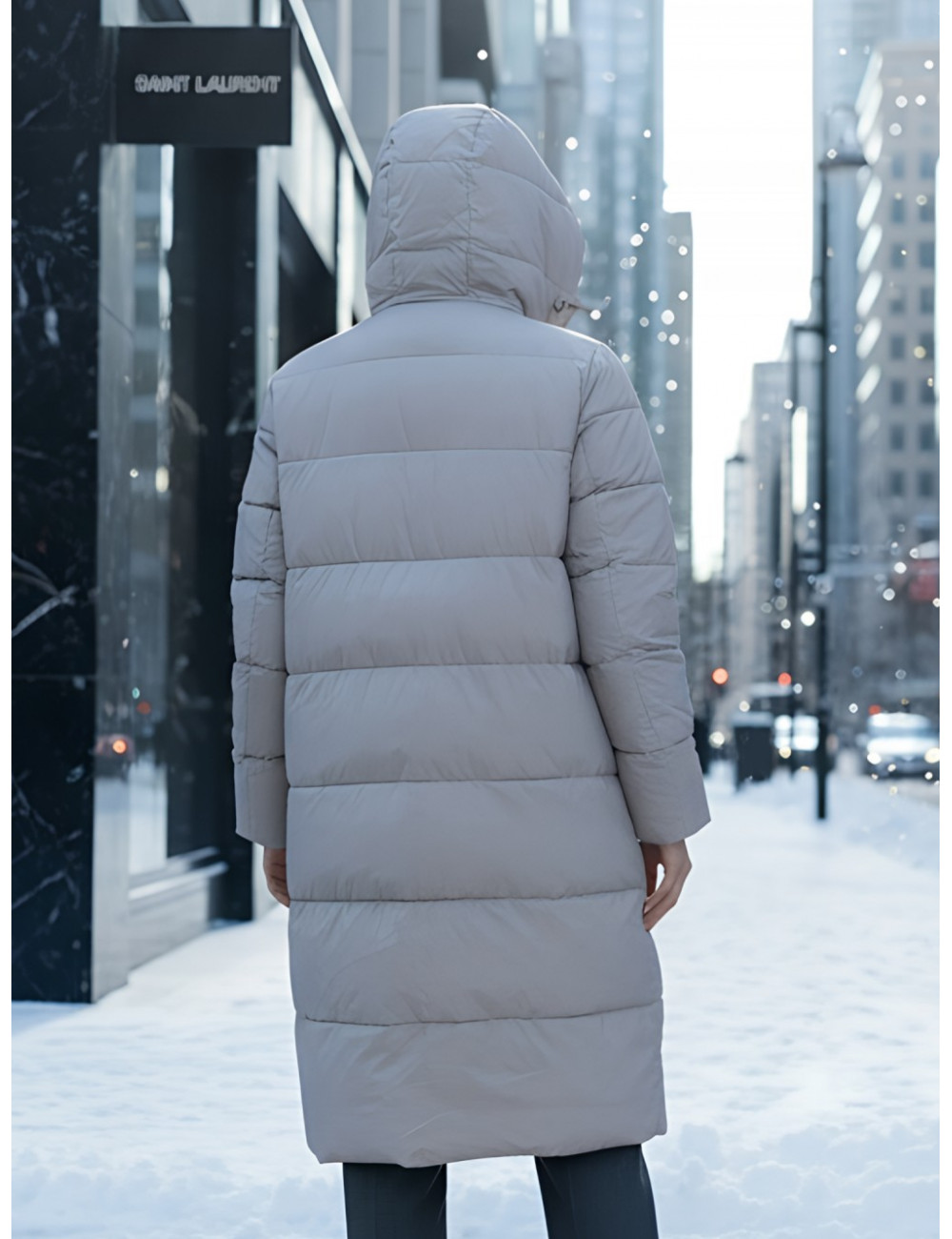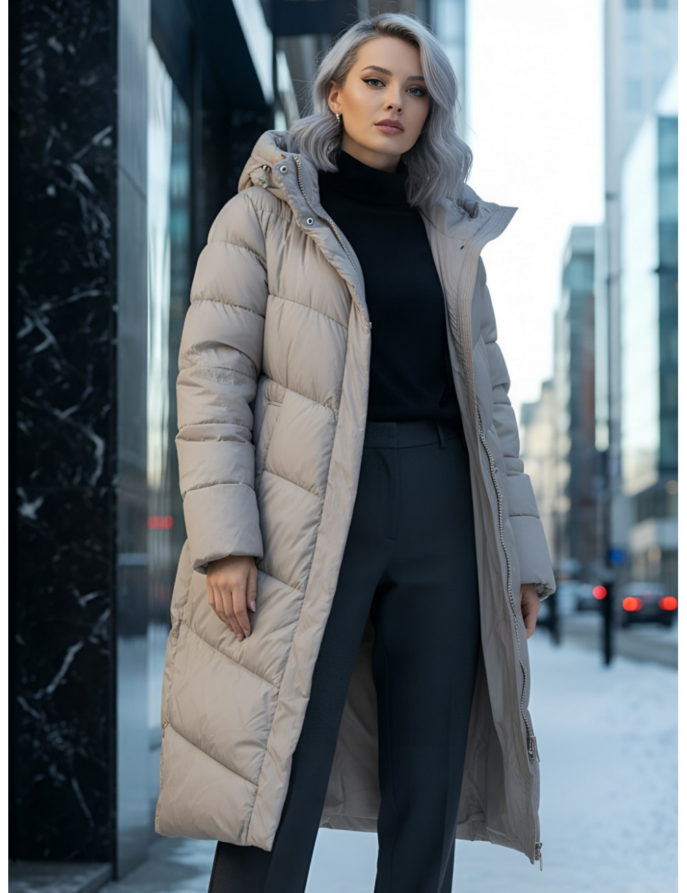 Стильный дизайн: удлинённый крой ниже колена и прямой, свободный покрой делают пуховик универсальным для любого стиля: от офисного до повседневного. Капюшон с фиксатором и стильные карманы добавляют функциональности и эстетики. Внутренние карманы с полиэстером обеспечивают дополнительный комфорт и удобство.
