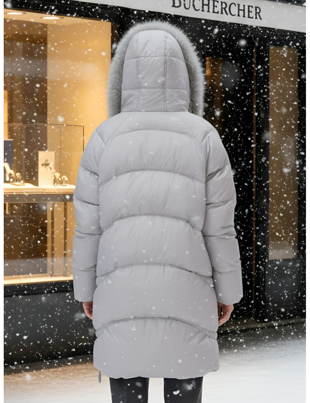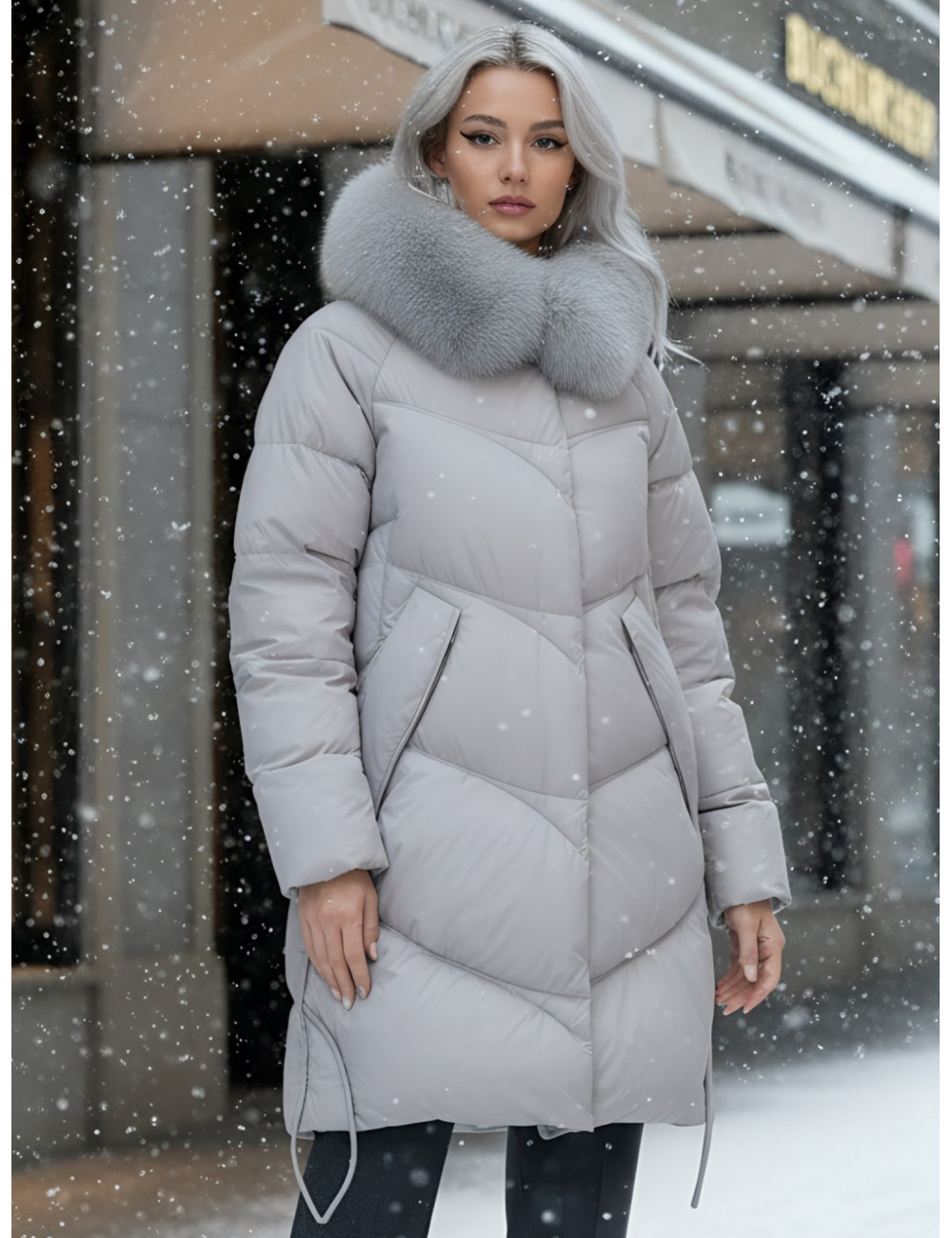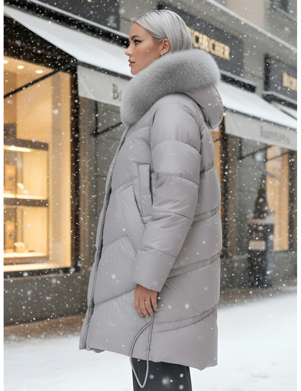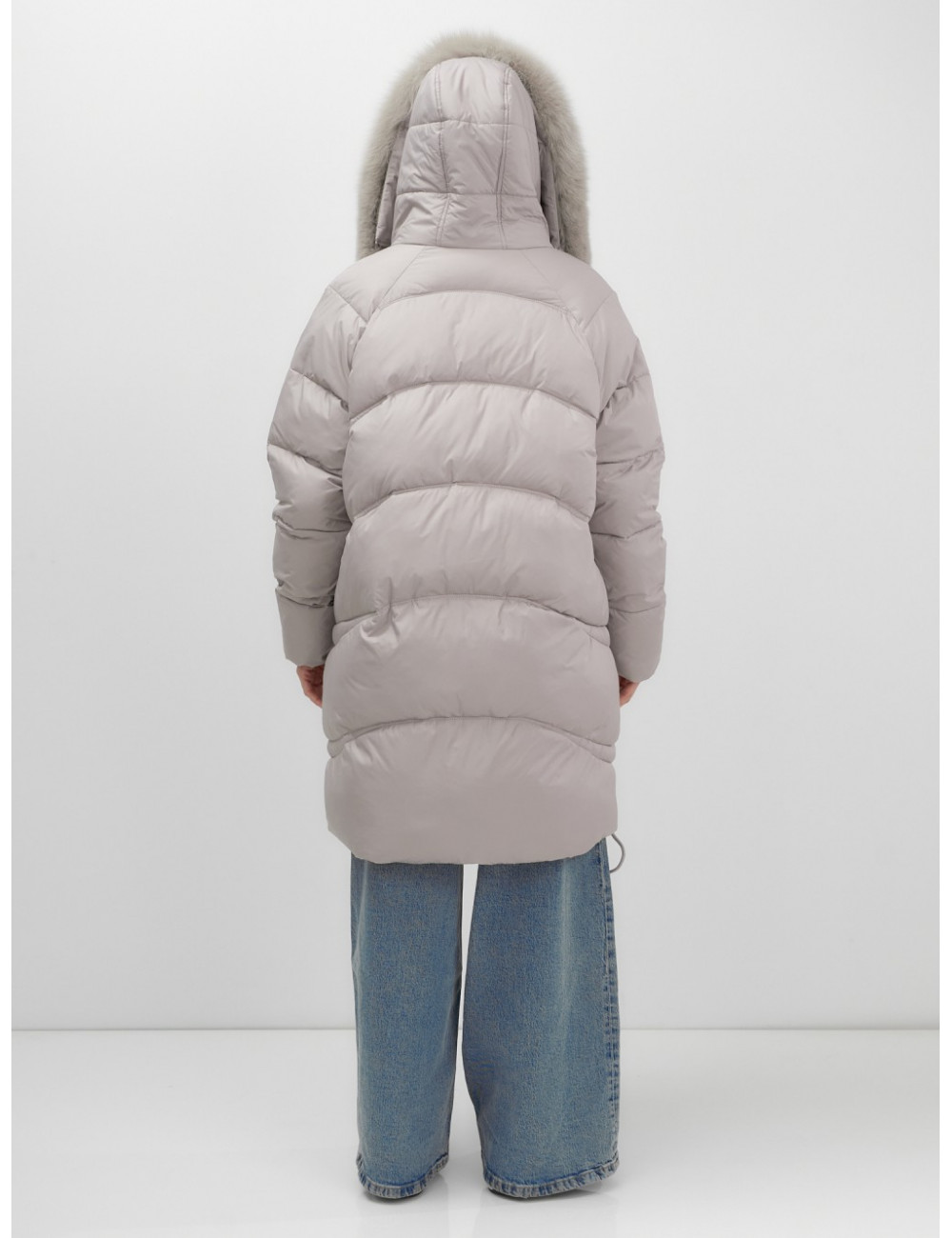 Роскошная съёмная опушка из натурального песца создаёт неповторимый образ. Первоклассное качество меха подчёркивает премиальность модели.