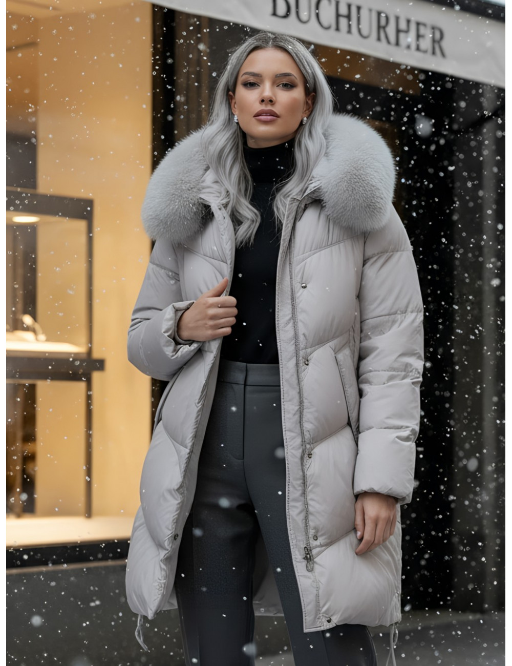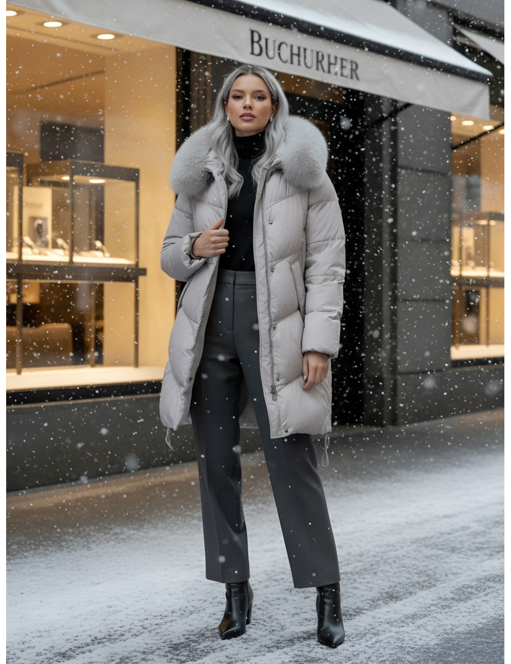Четыре изысканных оттенка коллекции осень-зима 2025 — благородный чёрный, элегантный тёмно-коричневый, утончённый светло-коричневый и стильный хаки — гармонично сочетаются с натуральным мехом песца. Удлинённый силуэт до колена и свободный крой подходят для размеров 46–54.