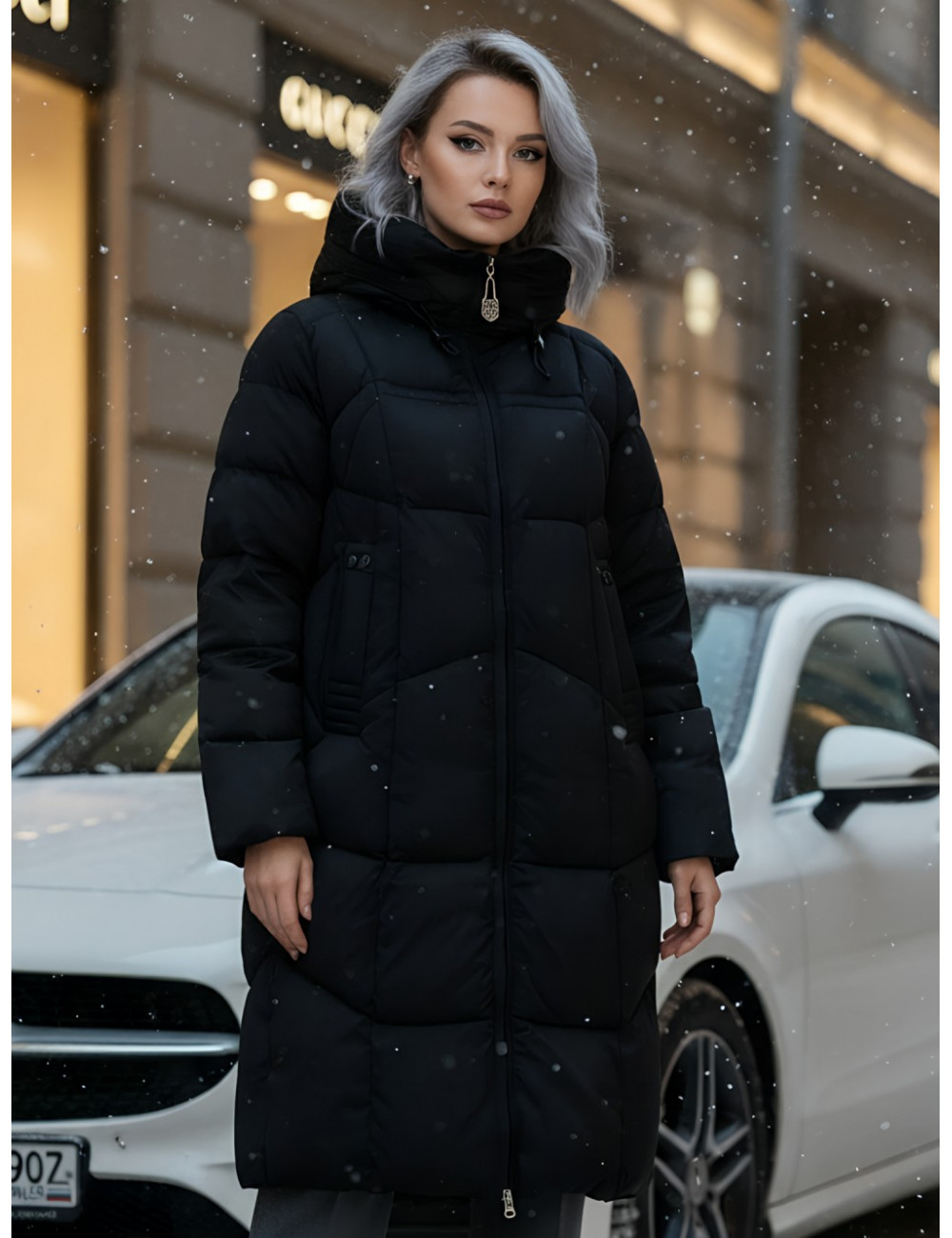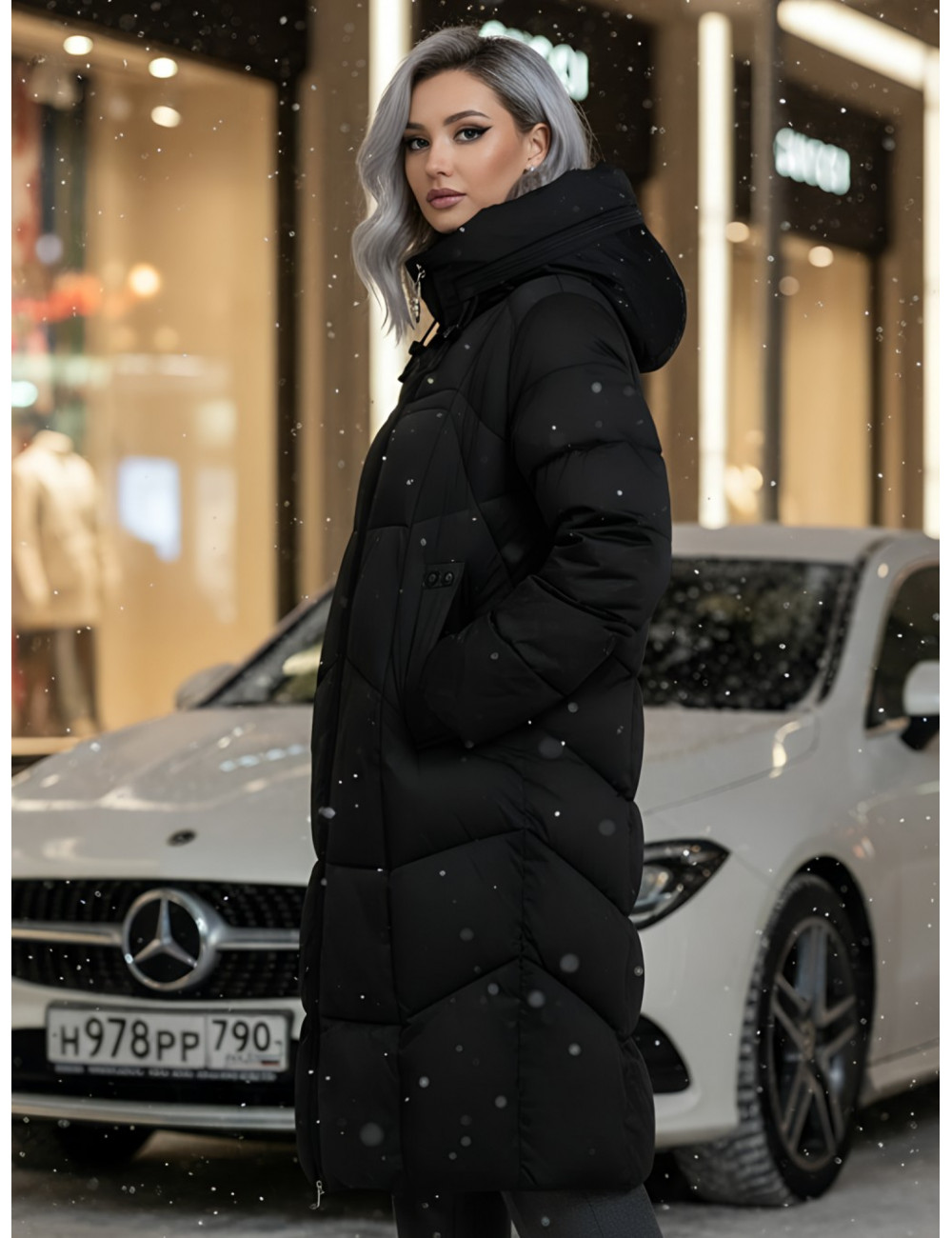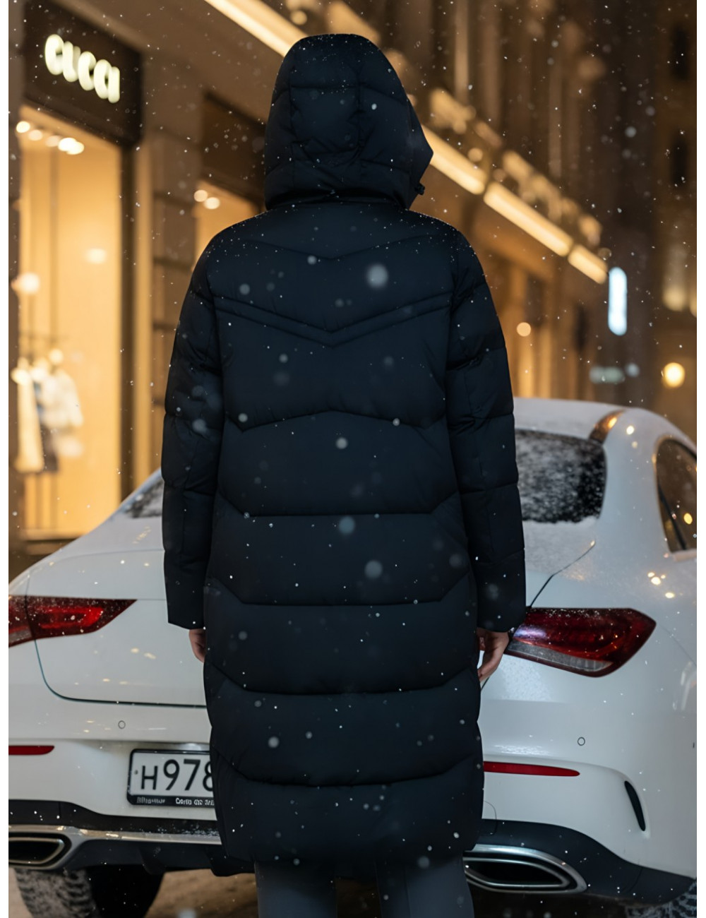Удлинённый крой ниже колена и свободный фасон делают этот пуховик универсальным для любого стиля — от офисного до повседневного. Стойка воротника и капюшон с фиксатором добавляют элегантности и защиты от холода.