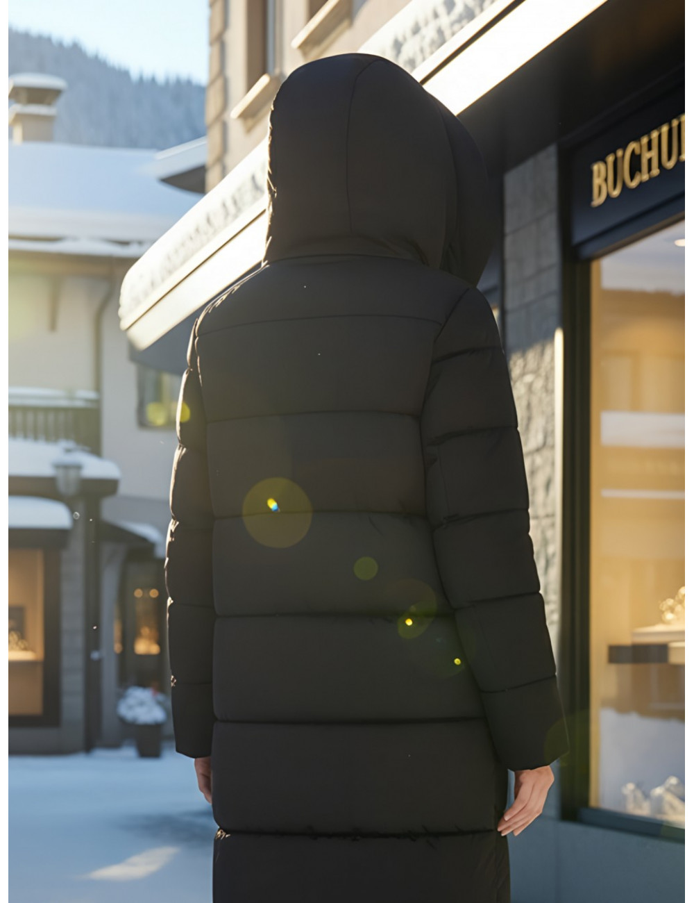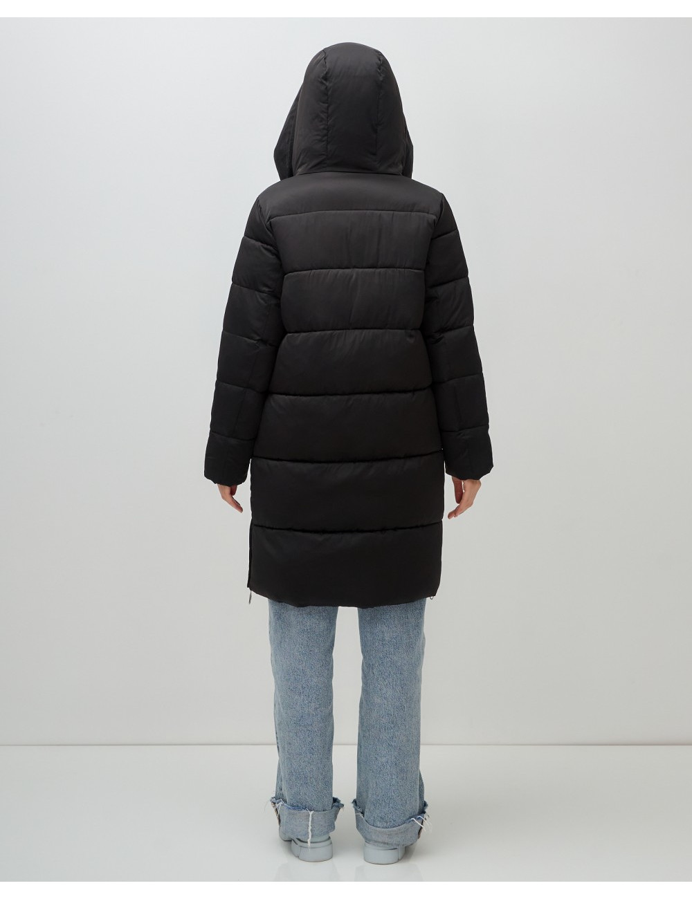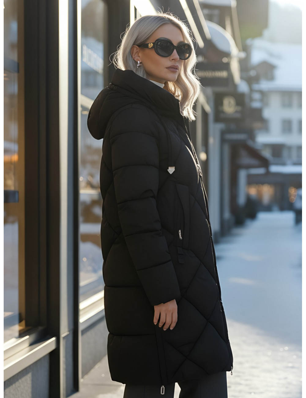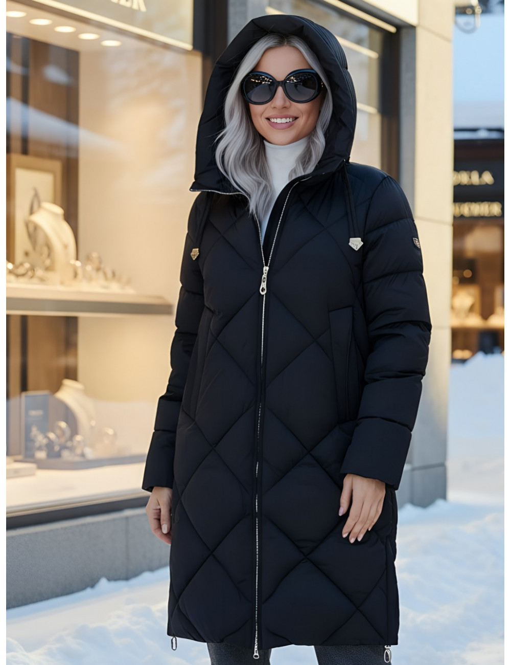 - Длина: до колена и удлинённый подол придают пуховику элегантный и стильный вид.