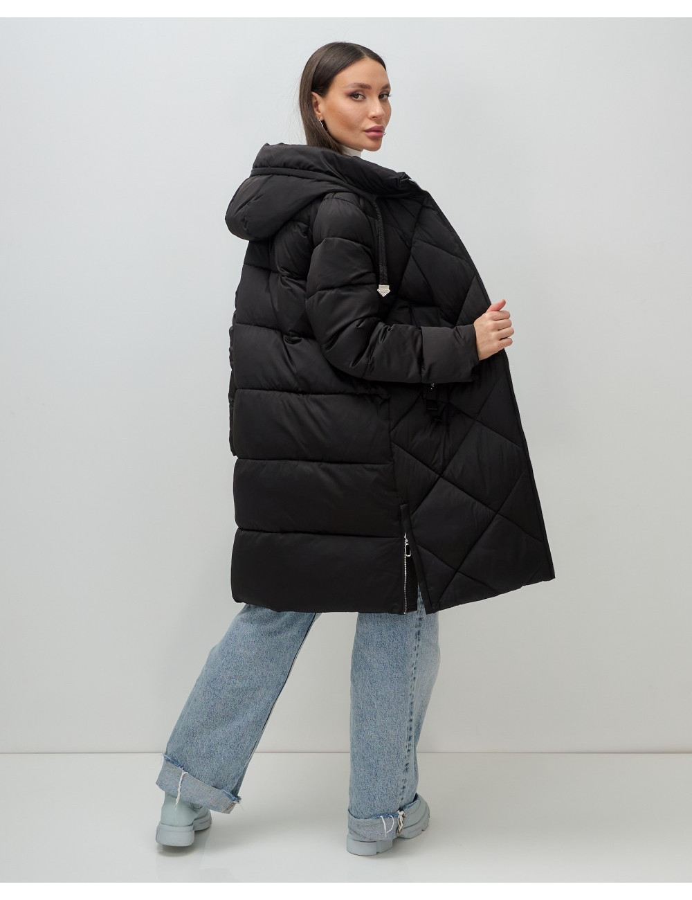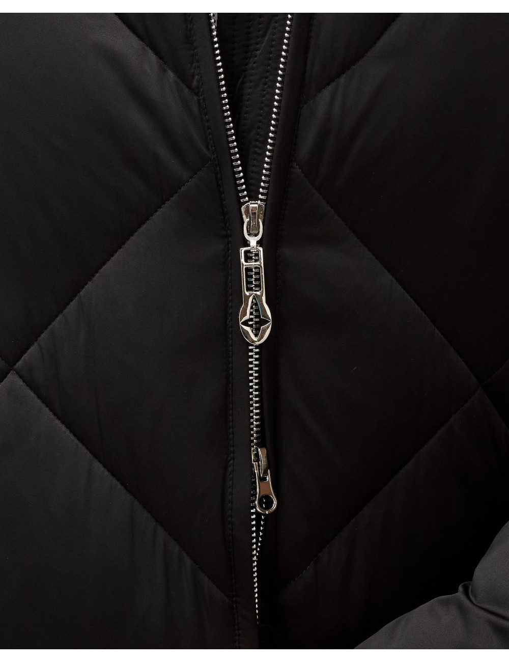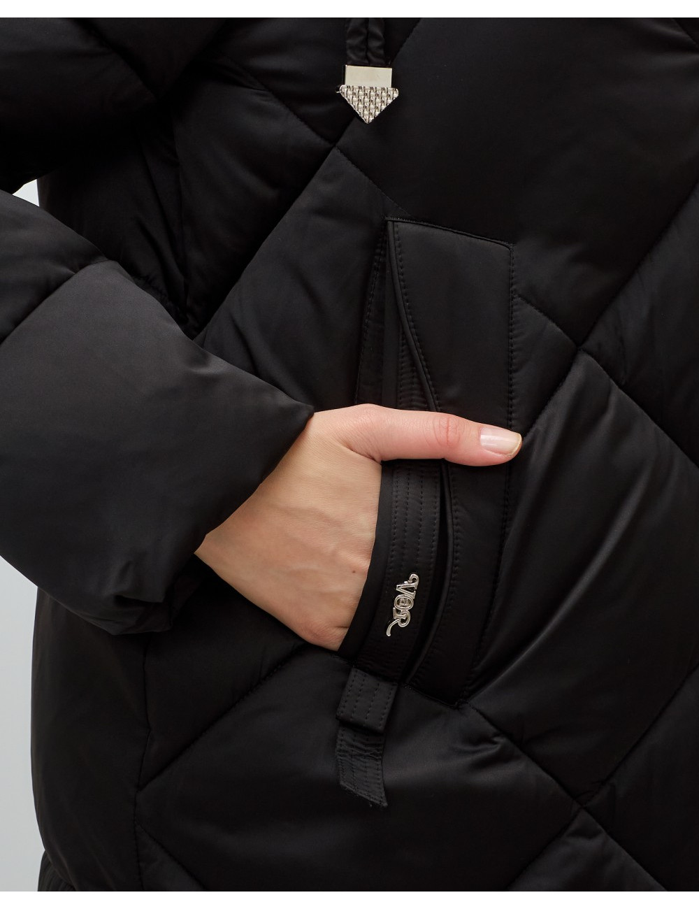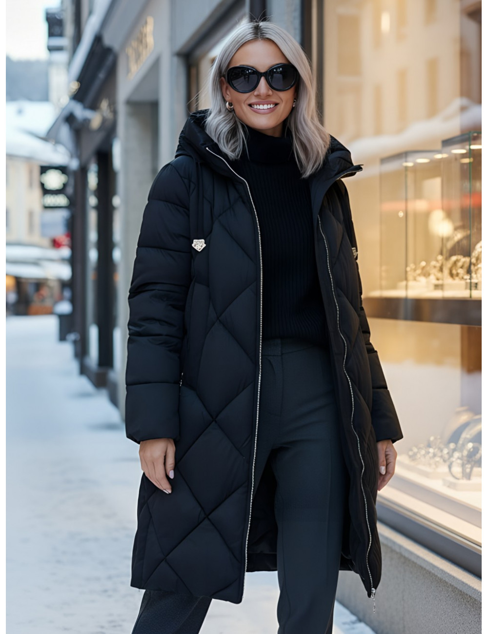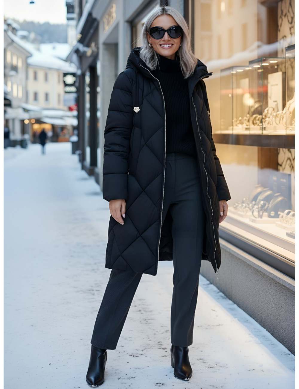 - Длина: до колена и удлинённый подол придают пуховику элегантный и стильный вид.