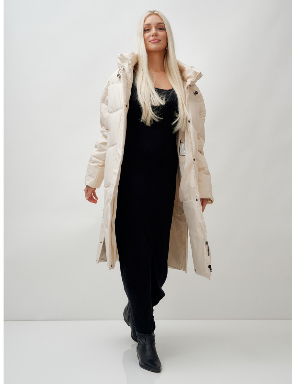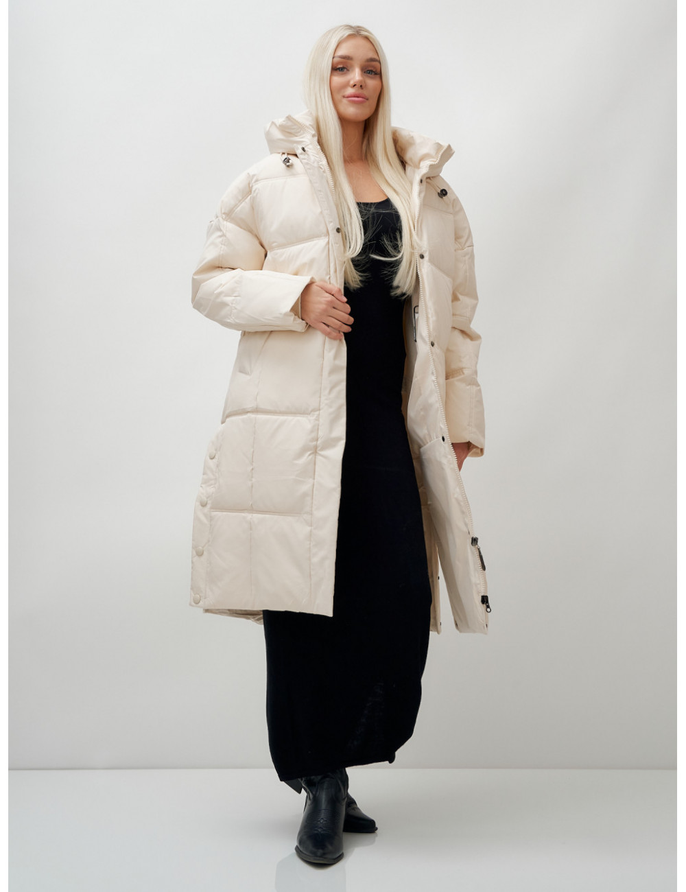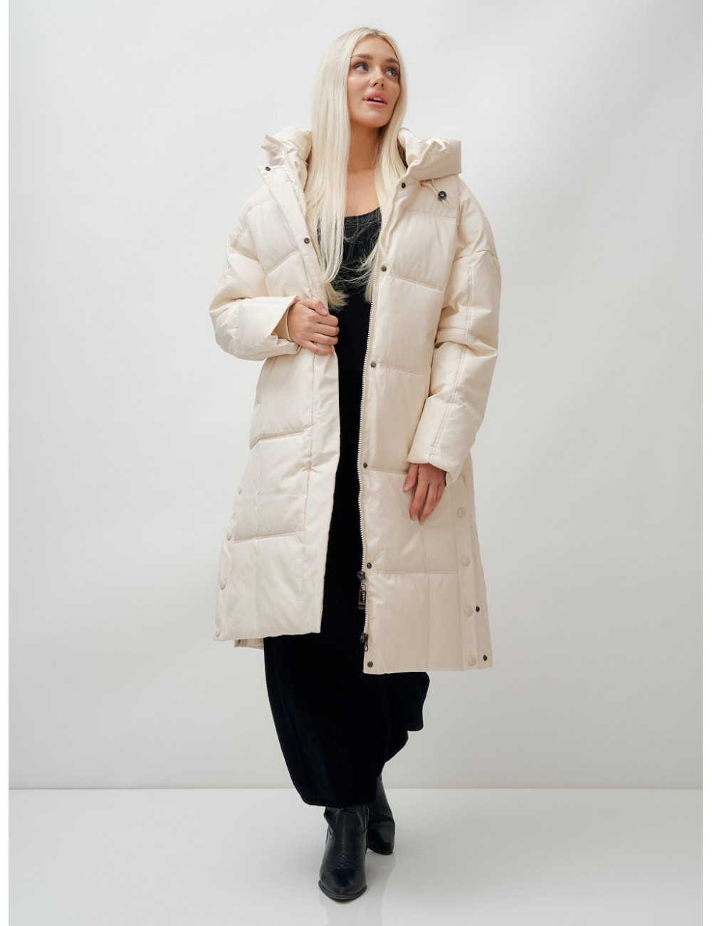 Пуховик имеет длину до колена, что обеспечивает защиту от холода и создаёт элегантный силуэт.