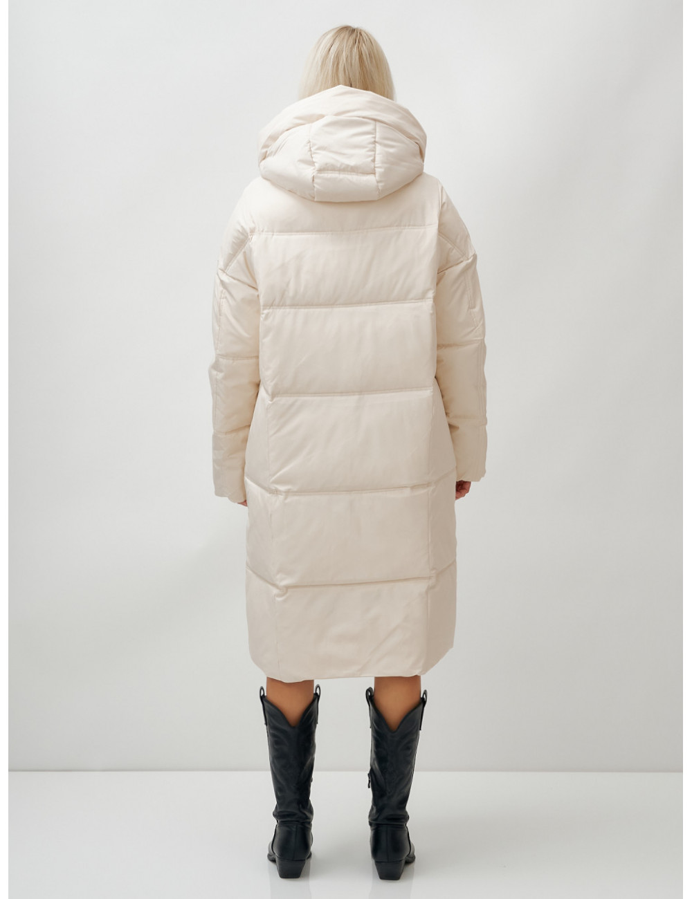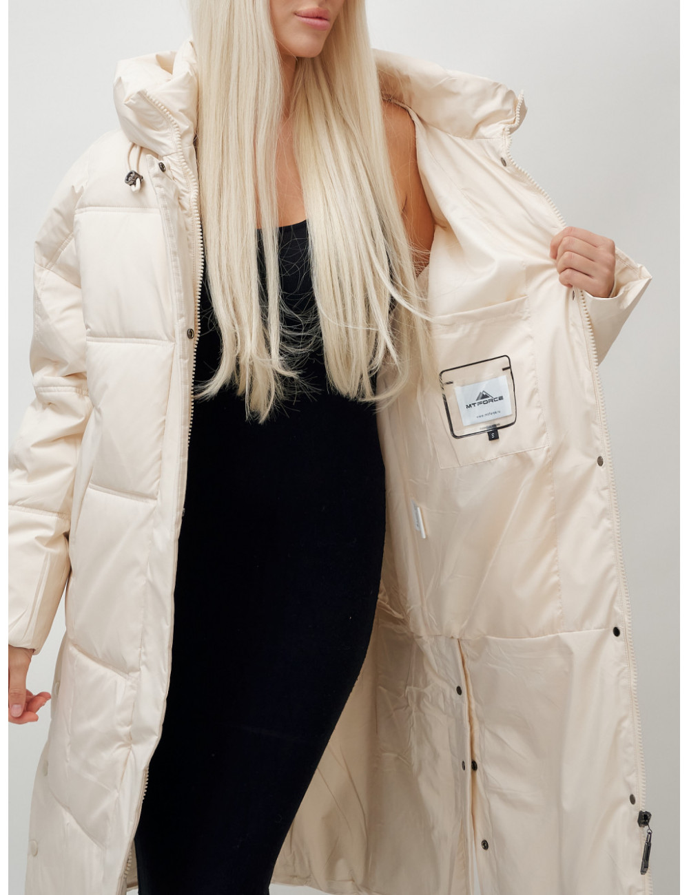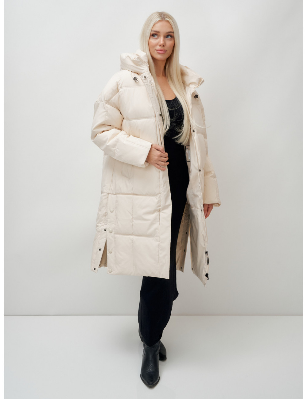 Пуховик имеет длину до колена, что обеспечивает защиту от холода и создаёт элегантный силуэт.