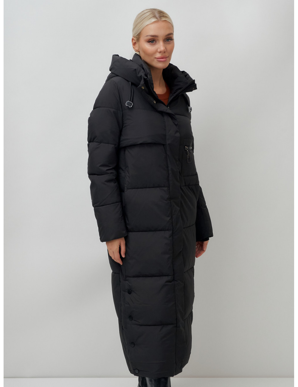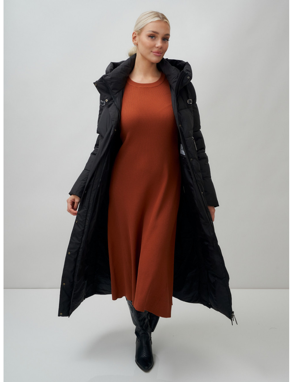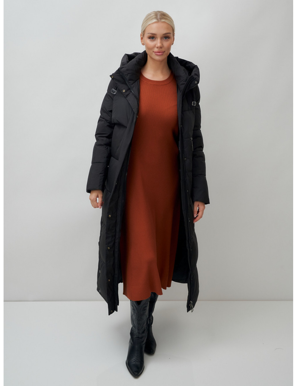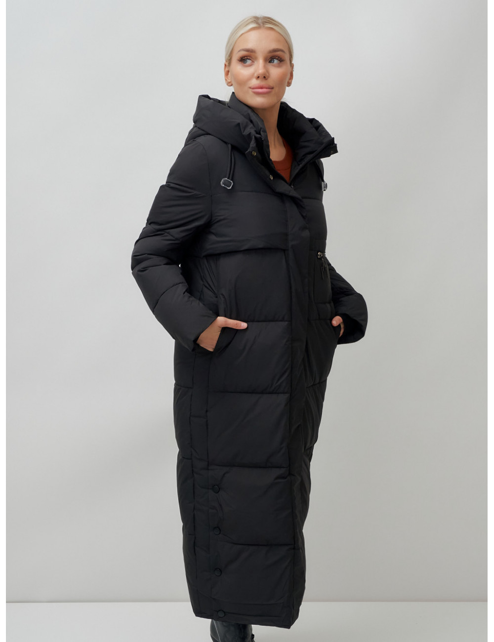Доставка Длинный пуховик женский зимний с капюшоном чёрный по Тюмени и Тюменской области СДЭК