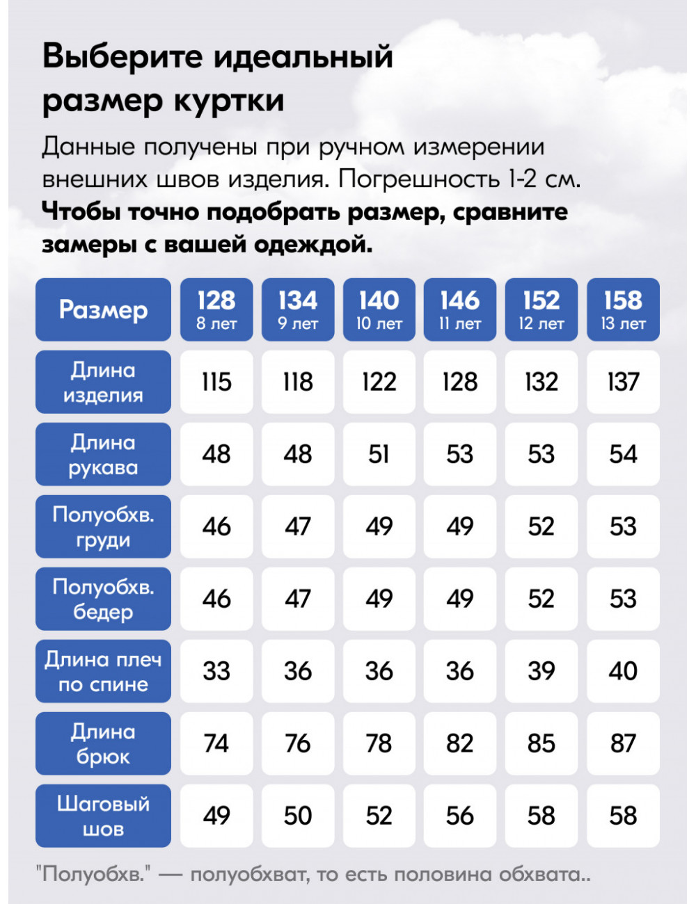 - Полуобхват груди (с передней стороны комбинезона, вокруг самой широкой части груди).