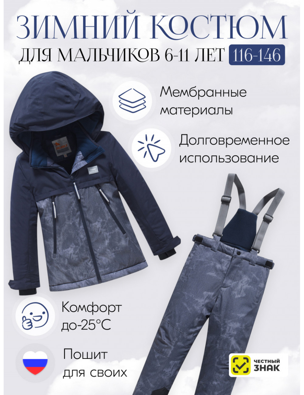Этот горнолыжный костюм отлично подойдёт для зимних видов спорта, таких как горные лыжи и сноуборд. Он обеспечит комфорт и защиту на склонах, а также позволит мальчику выглядеть стильно и современно.