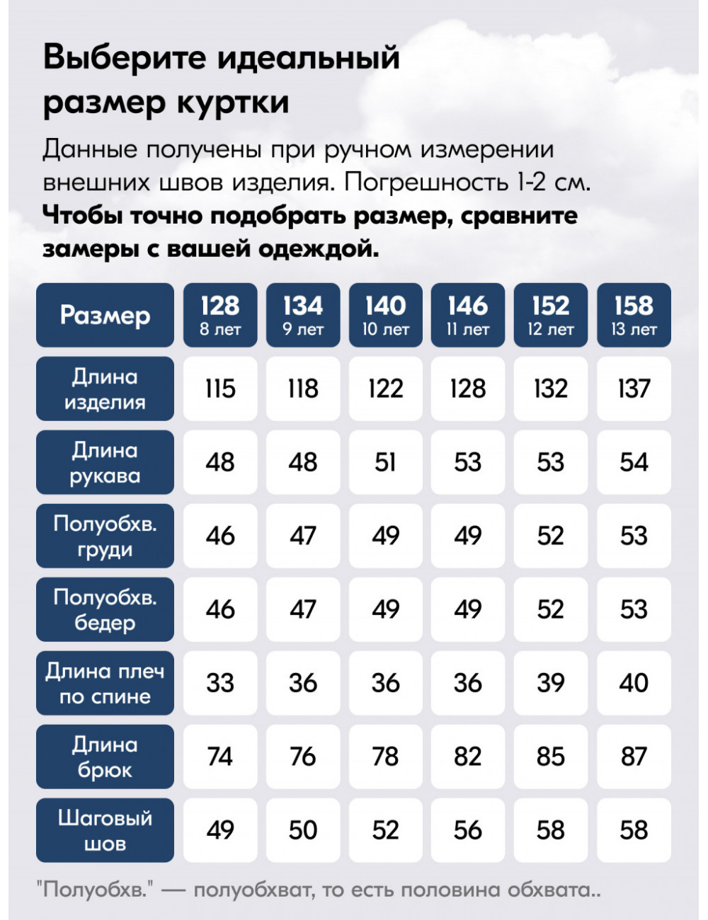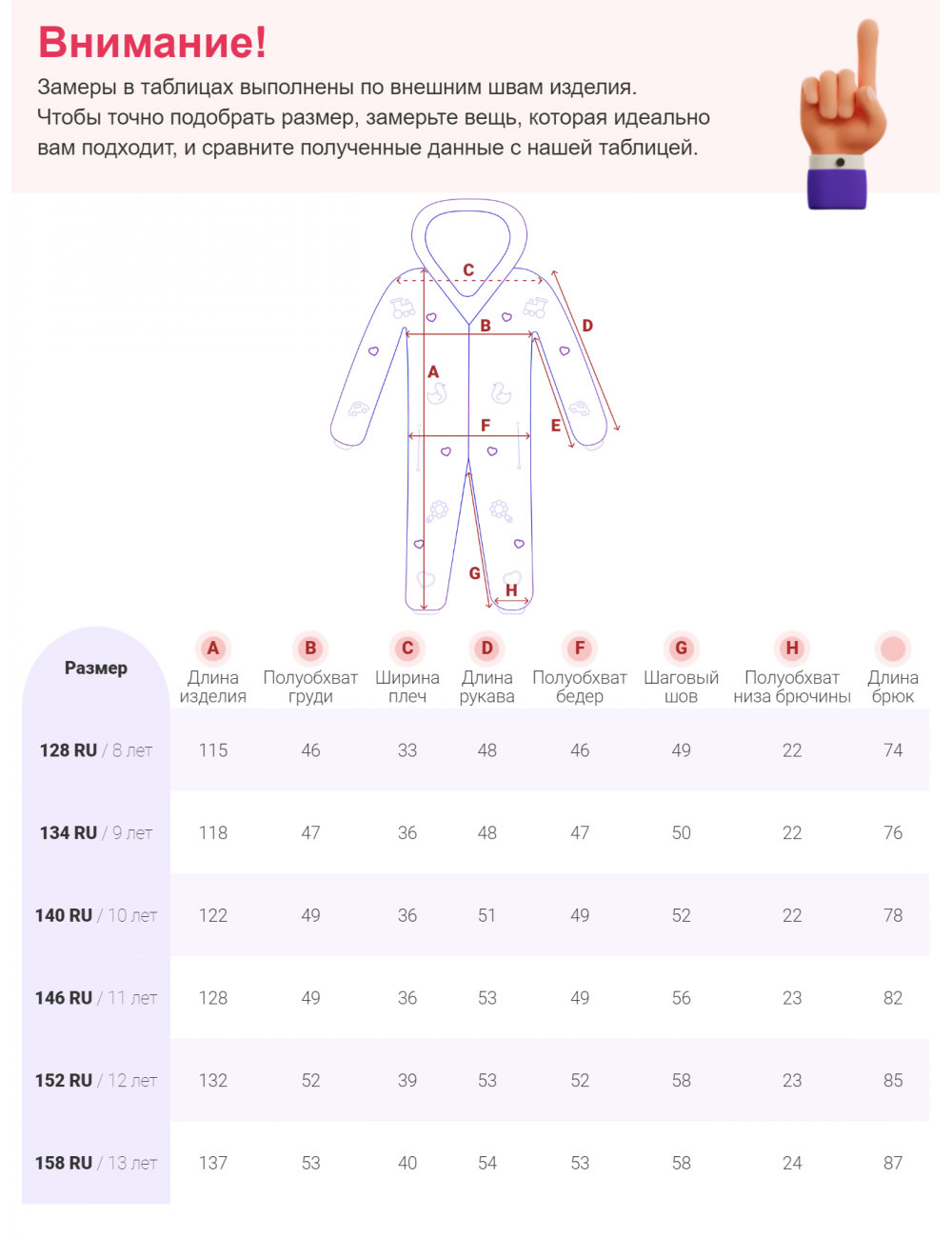 Для выбора идеального размера одежды рекомендуем измерить следующие параметры при помощи сантиметровой ленты: длина комбинезона, полуобхват груди, длина плеч по спине, длина рукава, внутренний шов рукава, полуобхват бёдер.