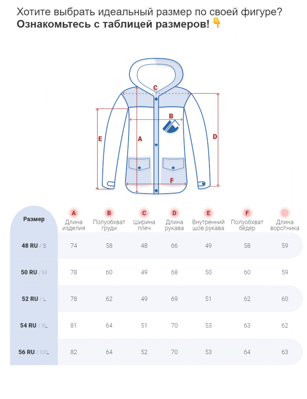 Перед использованием рекомендуется отпарить изделие. Куртка соответствует российским стандартам и идёт в размер. Учитывайте особенности строения фигуры при выборе размера.