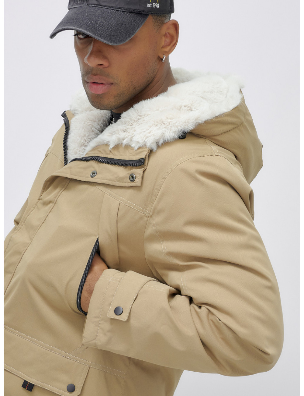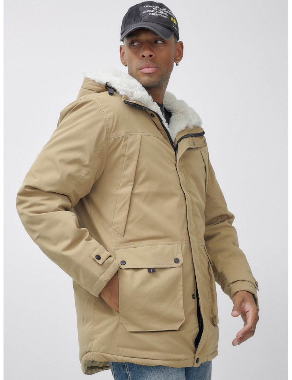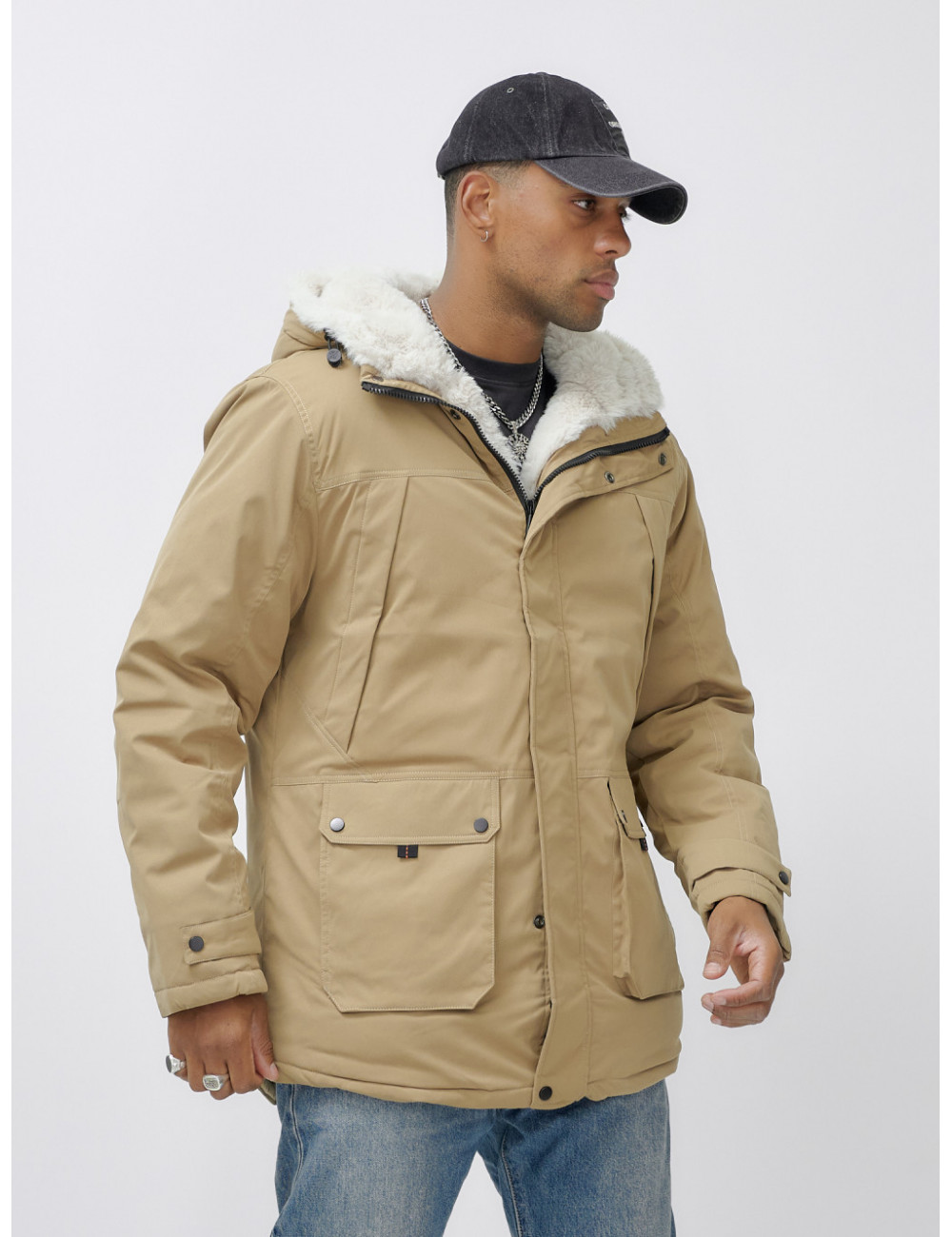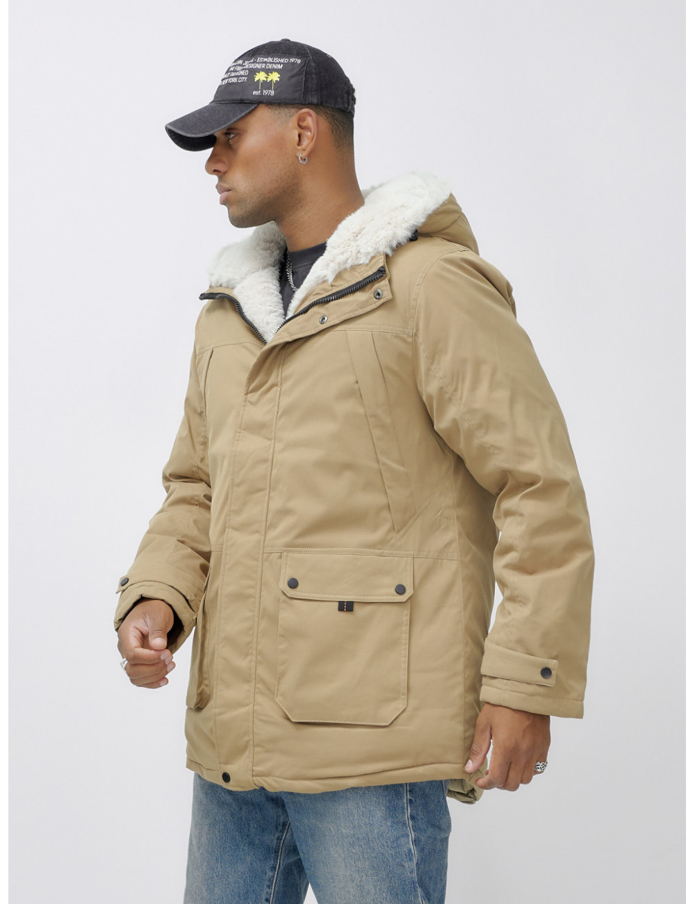 Доставка Мужская зимняя удлиненная парка с мехом горчичного оттенка. по Тюмени и Тюменской области СДЭК