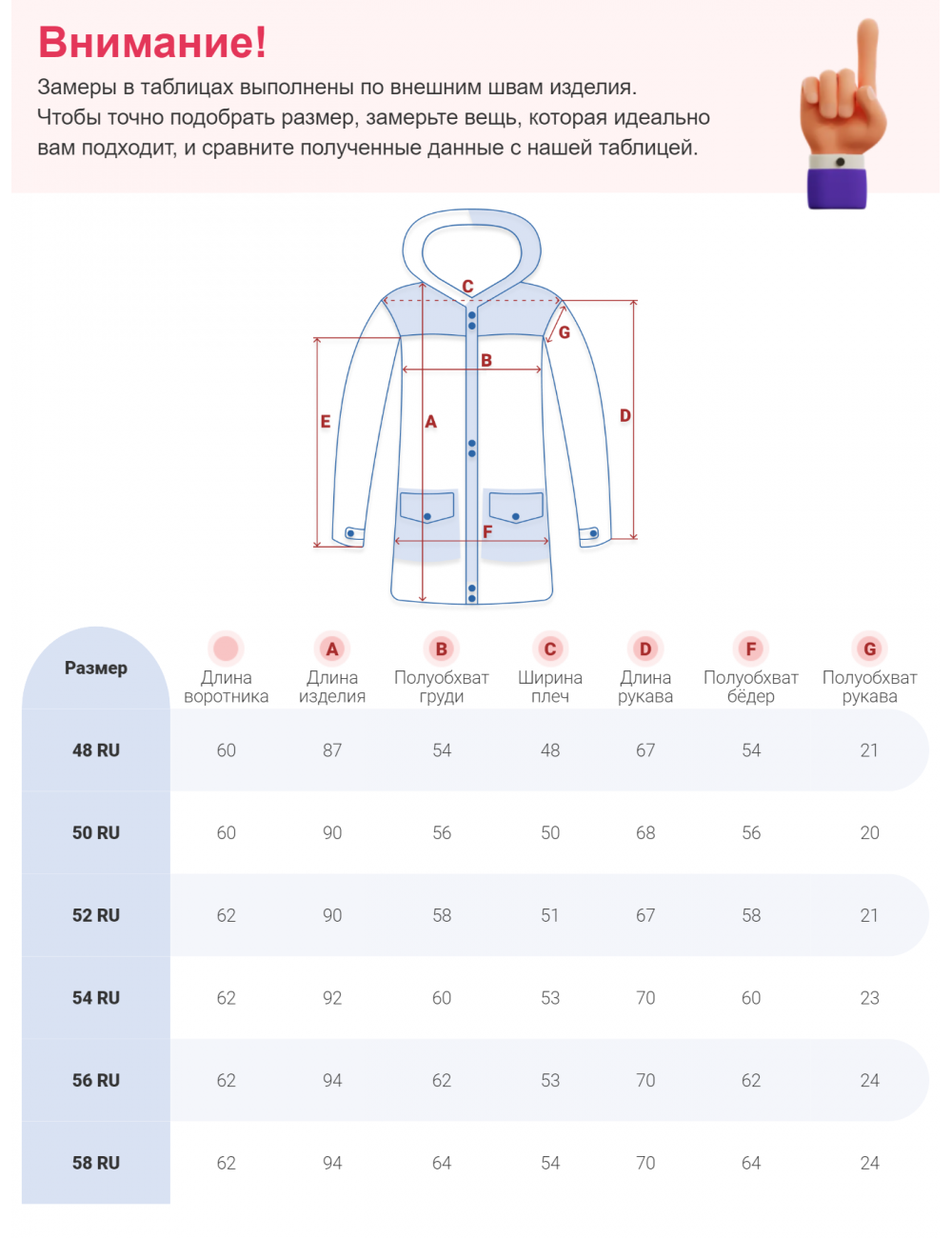 Для выбора идеального размера одежды рекомендуем вам измерить следующие параметры при помощи сантиметровой ленты: длина куртки, полуобхват груди, длина плеч по спине, длина рукава, внутренний шов рукава, полуобхват бёдер.