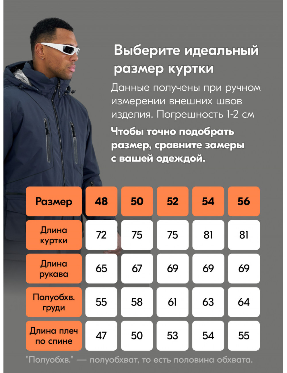Для выбора идеального размера одежды рекомендуем измерить следующие параметры: длина куртки, полуобхват груди, длина плеч по спине, длина рукава, полуобхват бёдер и другие. Используйте сантиметровую ленту для точности измерений.