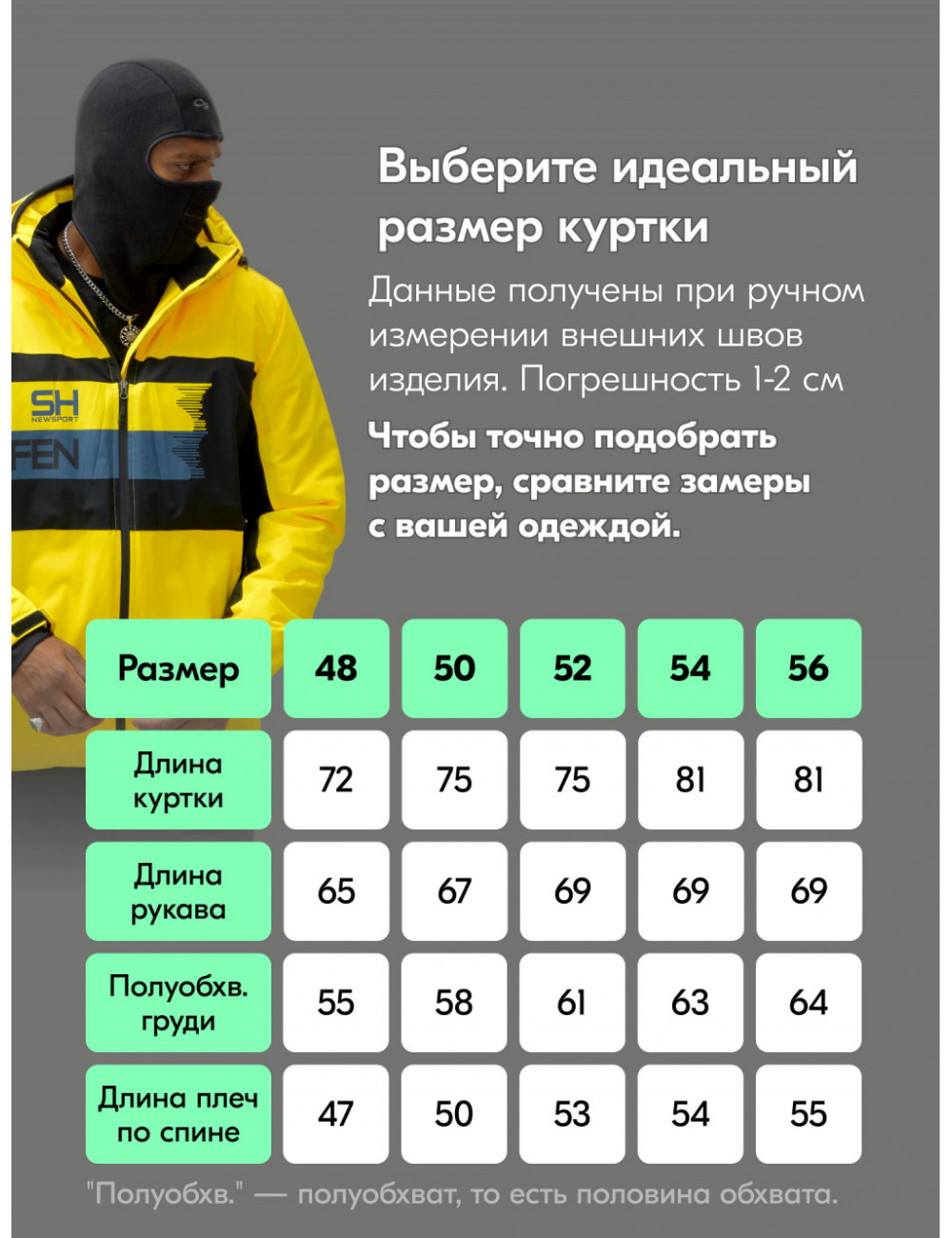 - Полуобхват груди: измеряется с передней стороны куртки, вокруг самой широкой части груди.
