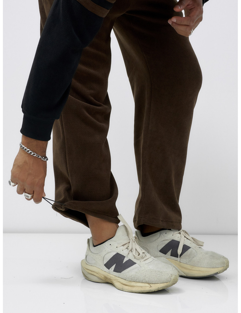 Удобные брюки с эластичной резинкой в талии и регулируемым шнурком обеспечивают идеальную посадку. Боковые карманы на молнии — это практичность и безопасность для ваших мелочей. Фиксатор утяжки на штанинах позволяет регулировать длину и создаёт аккуратный вид.