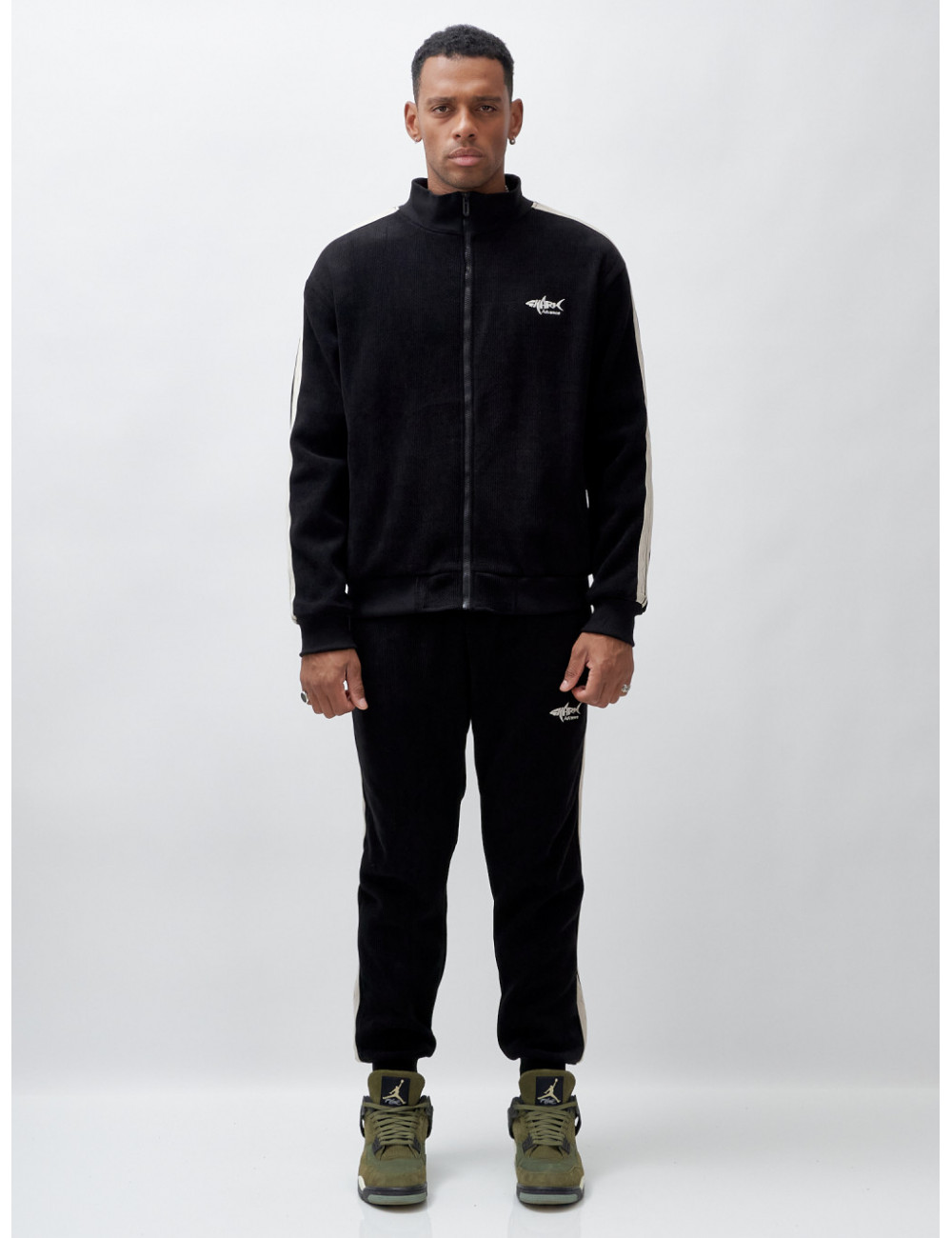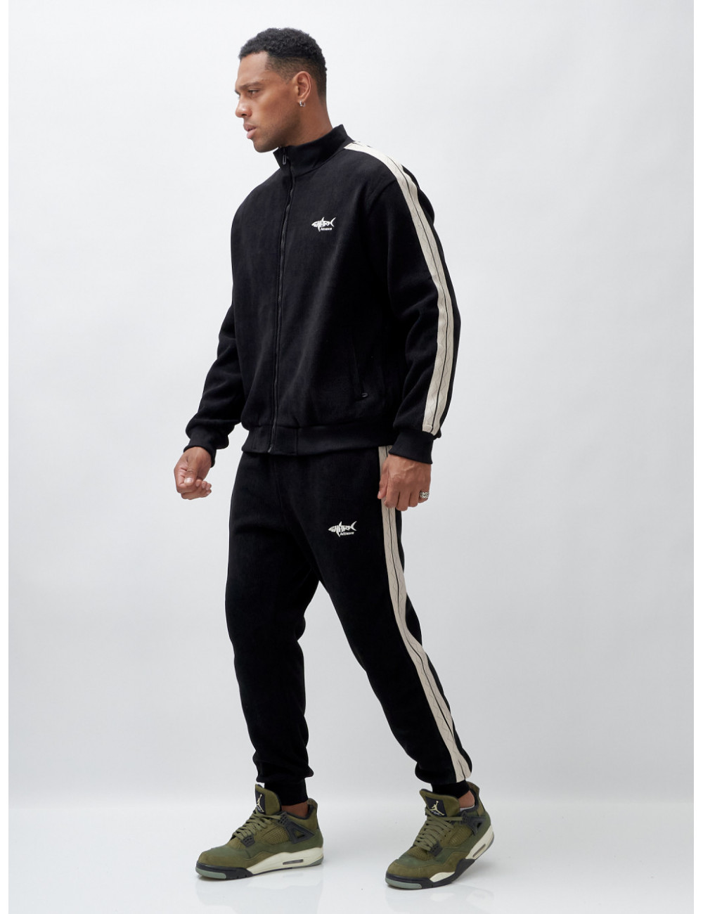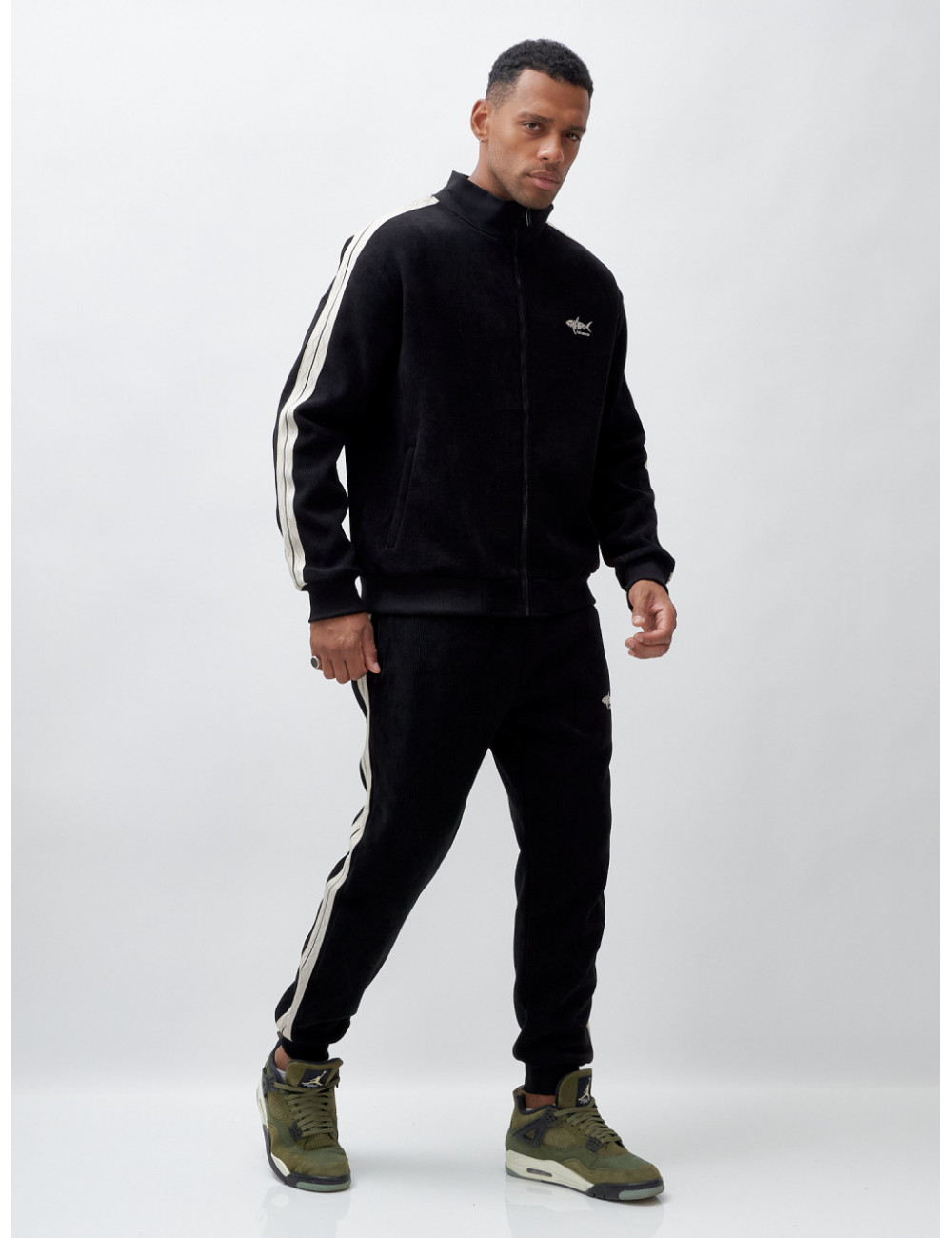- Стильный дизайн. Олимпийка с высоким трикотажным воротником и крупной молнией не только защищает от ветра, но и выглядит стильно. Декоративные полосы по боковым швам рукава и штанин добавляют изюминку вашему образу.