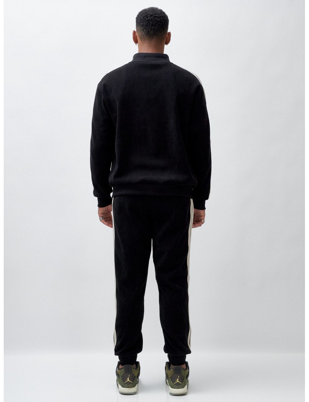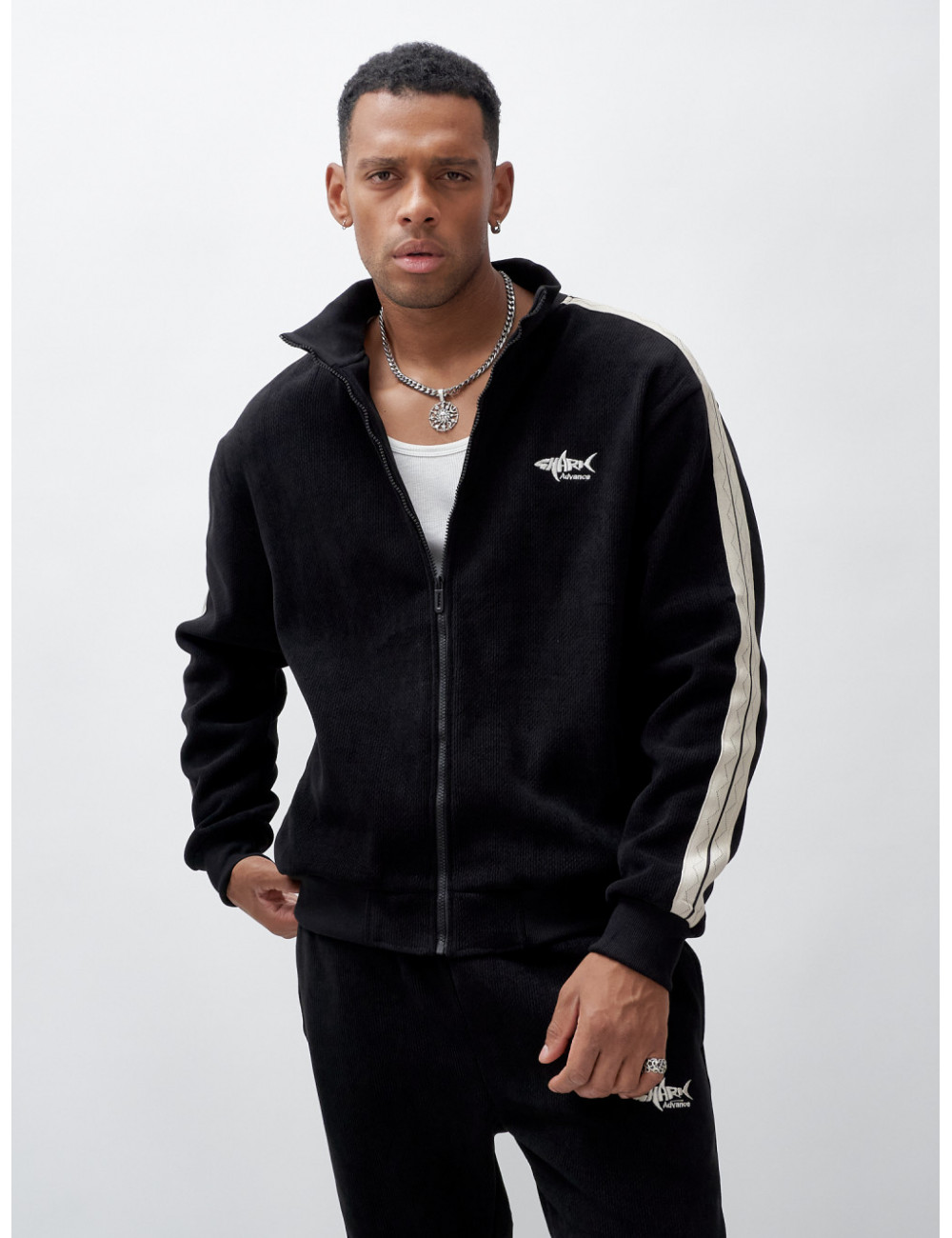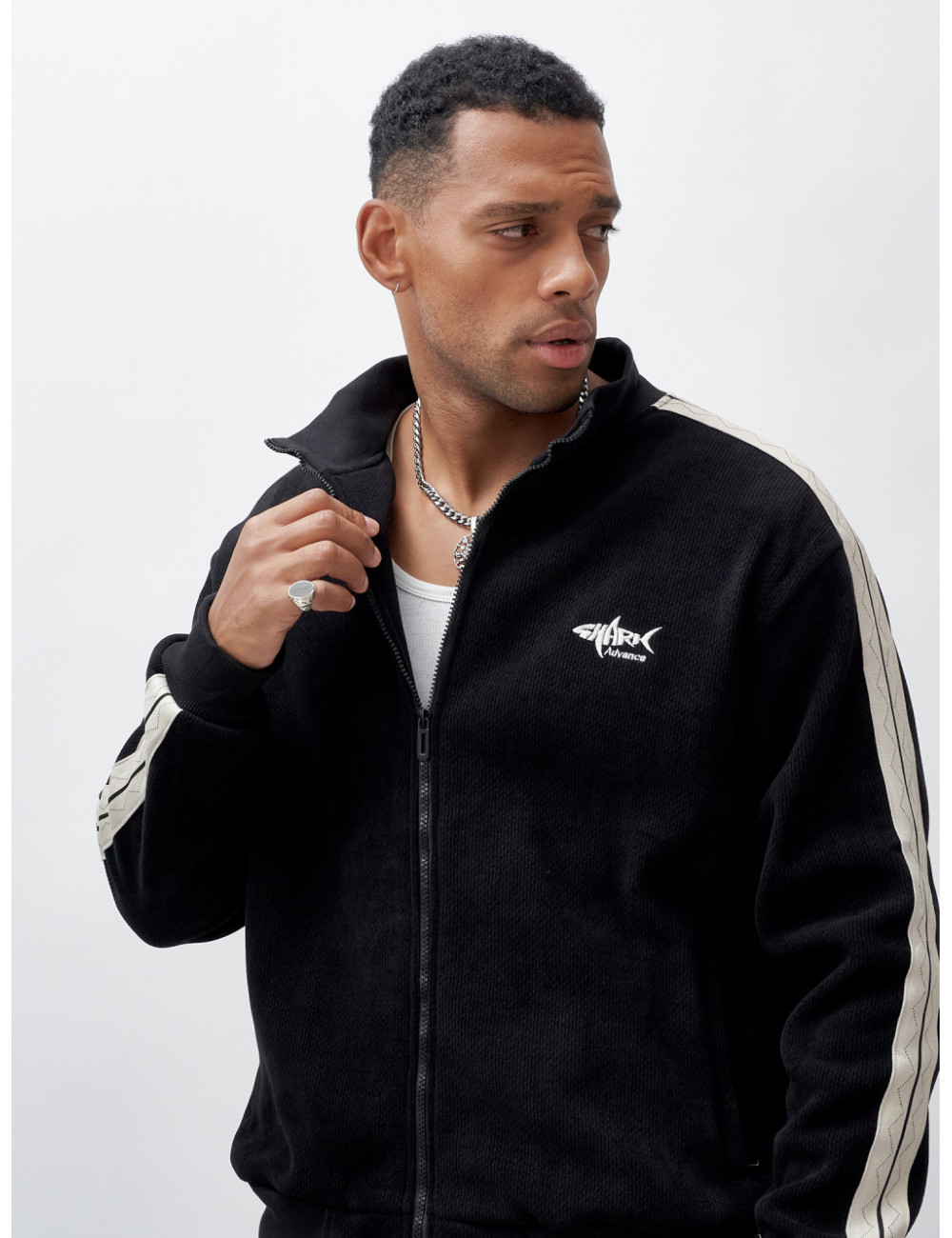 - Стильный дизайн. Олимпийка с высоким трикотажным воротником и крупной молнией не только защищает от ветра, но и выглядит стильно. Декоративные полосы по боковым швам рукава и штанин добавляют изюминку вашему образу.