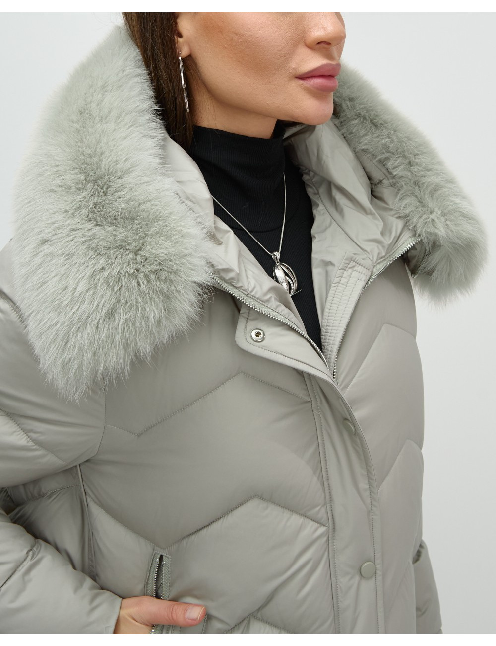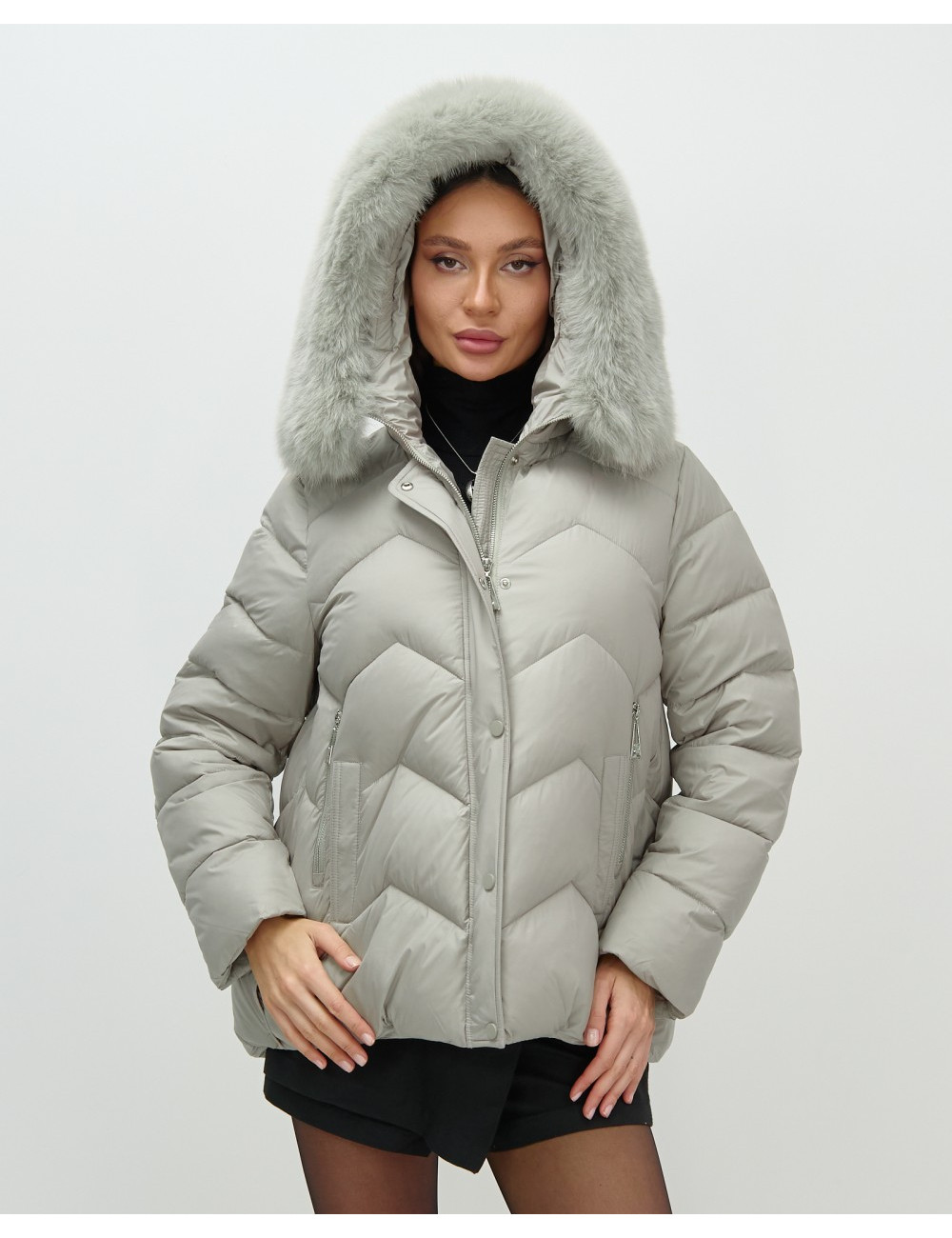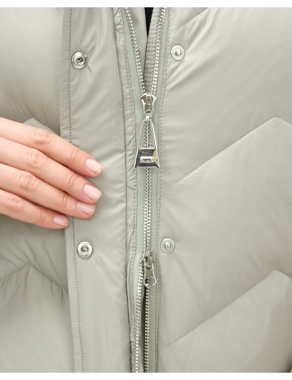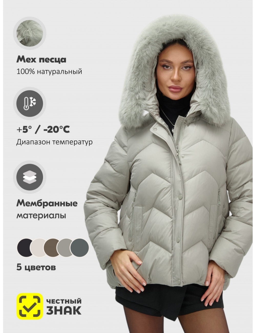 Пуховик представлен в пяти актуальных цветах: чёрный, бежевый, светло-зелёный, коричневый, тёмно-серый.