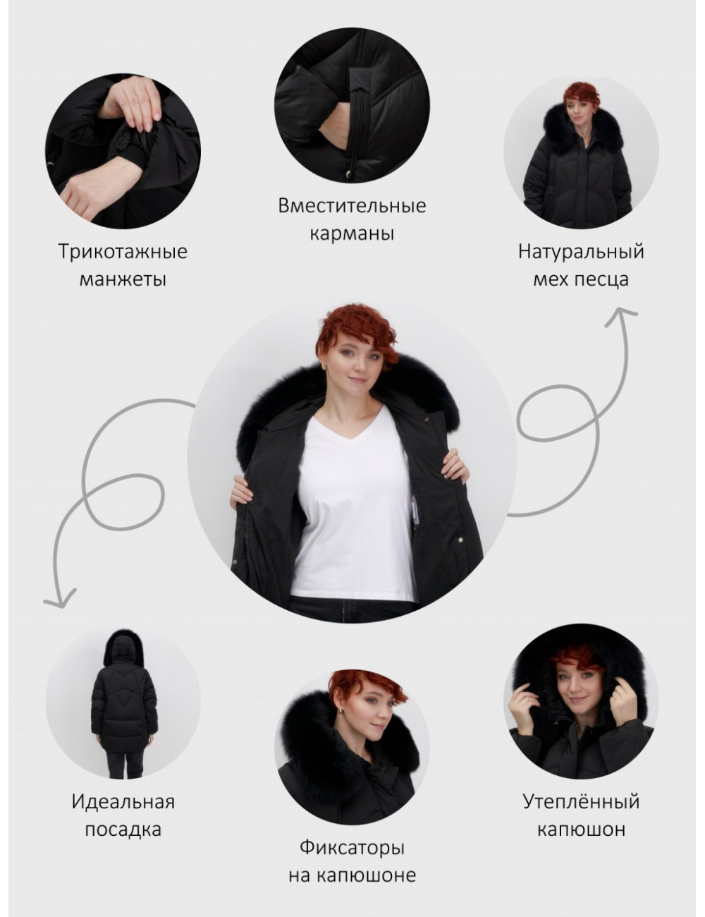 | Декоративные элементы | Капюшон, Манжеты, Карманы, Мех |