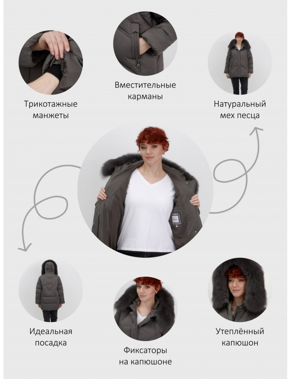 | Декоративные элементы | Капюшон, Манжеты, Карманы, Мех |