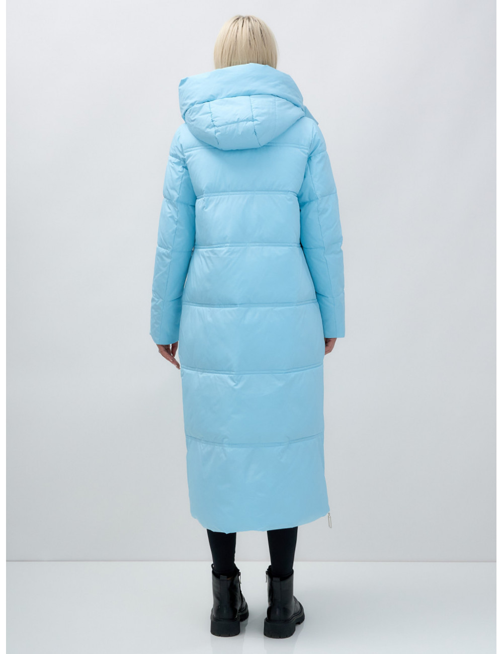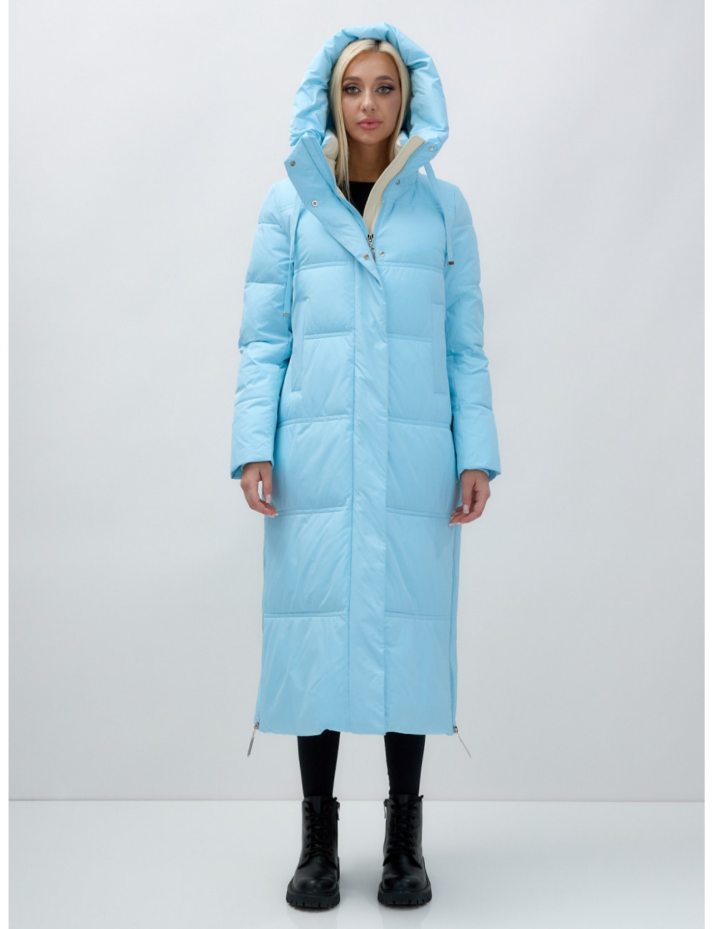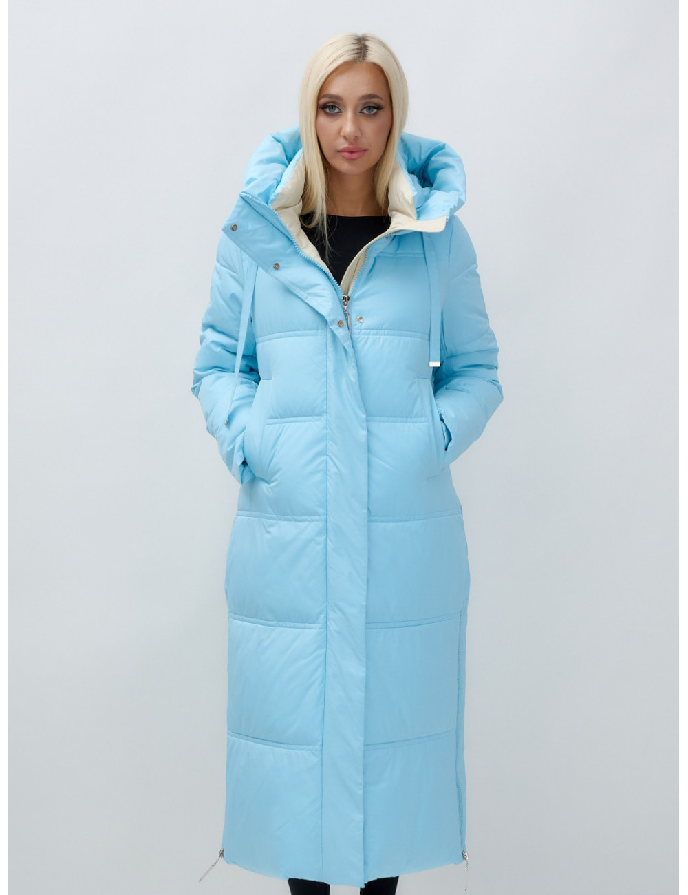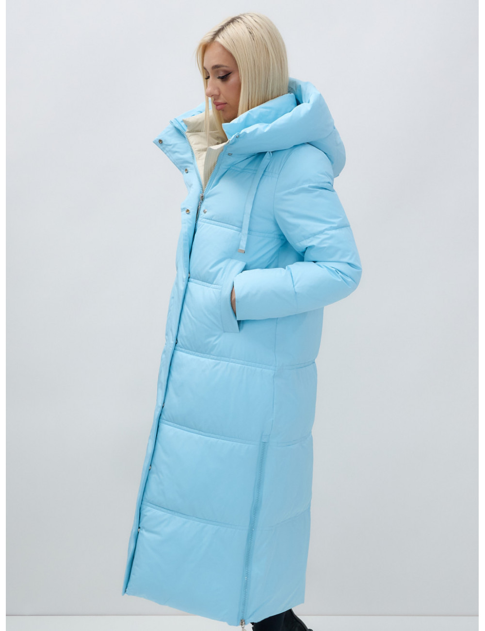 Пуховик-пальто женский утеплённый стёганый зимний с капюшоном голубой.