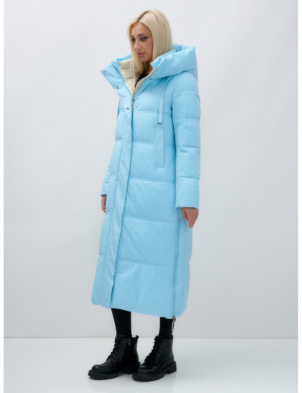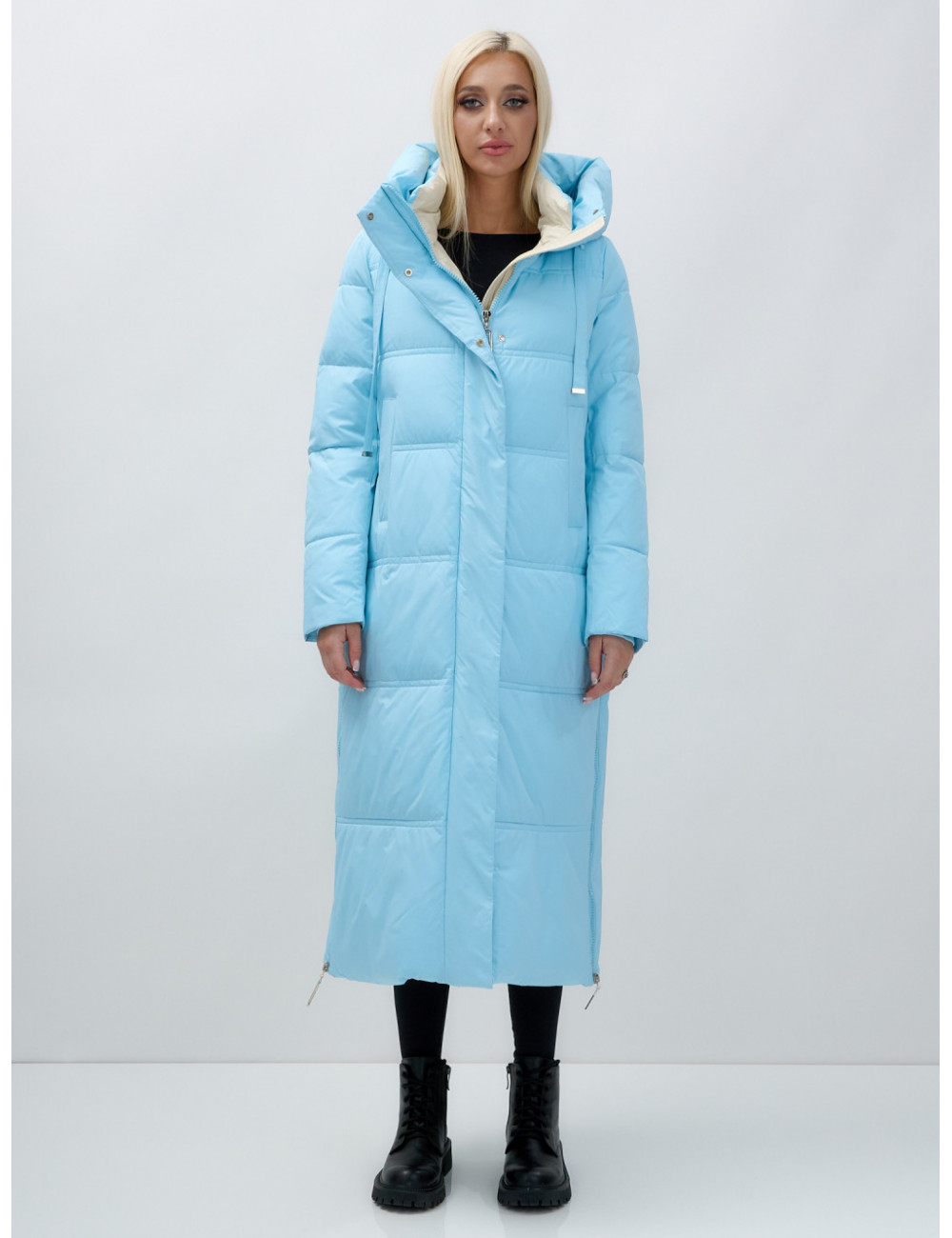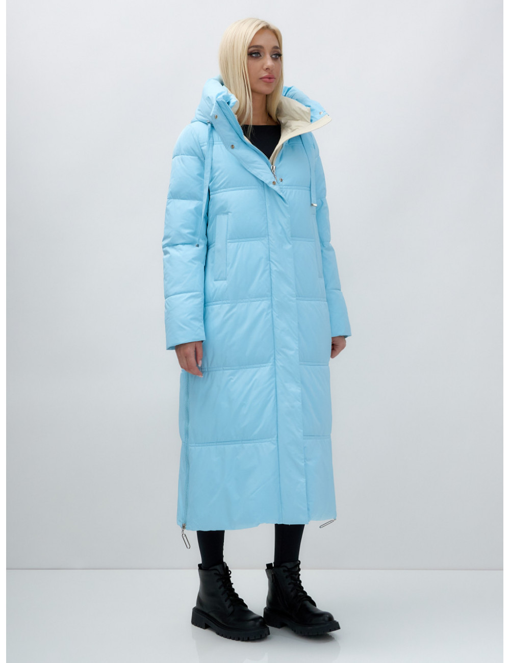 Пуховик-пальто женский утеплённый стёганый зимний с капюшоном голубой.