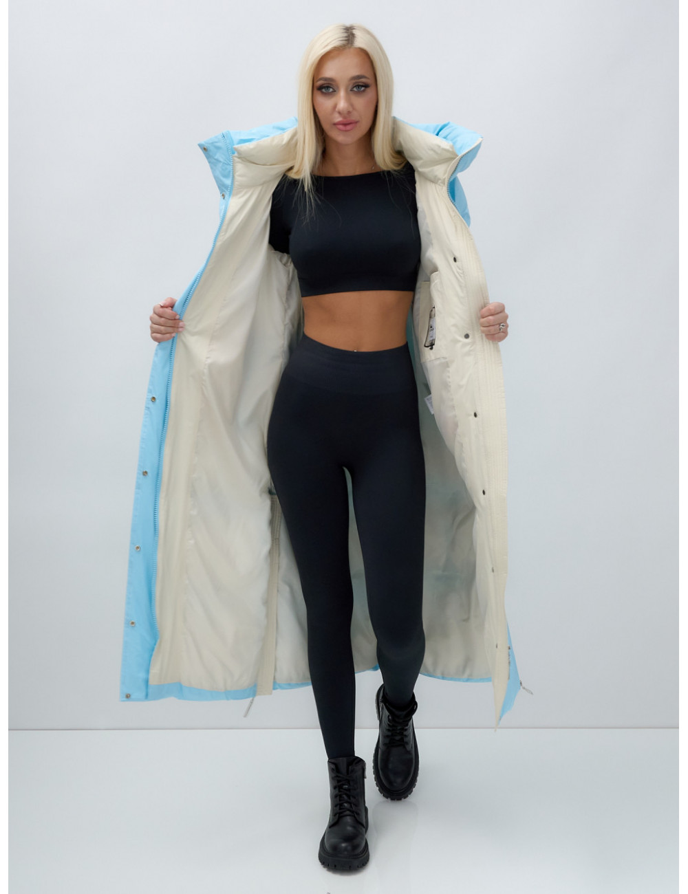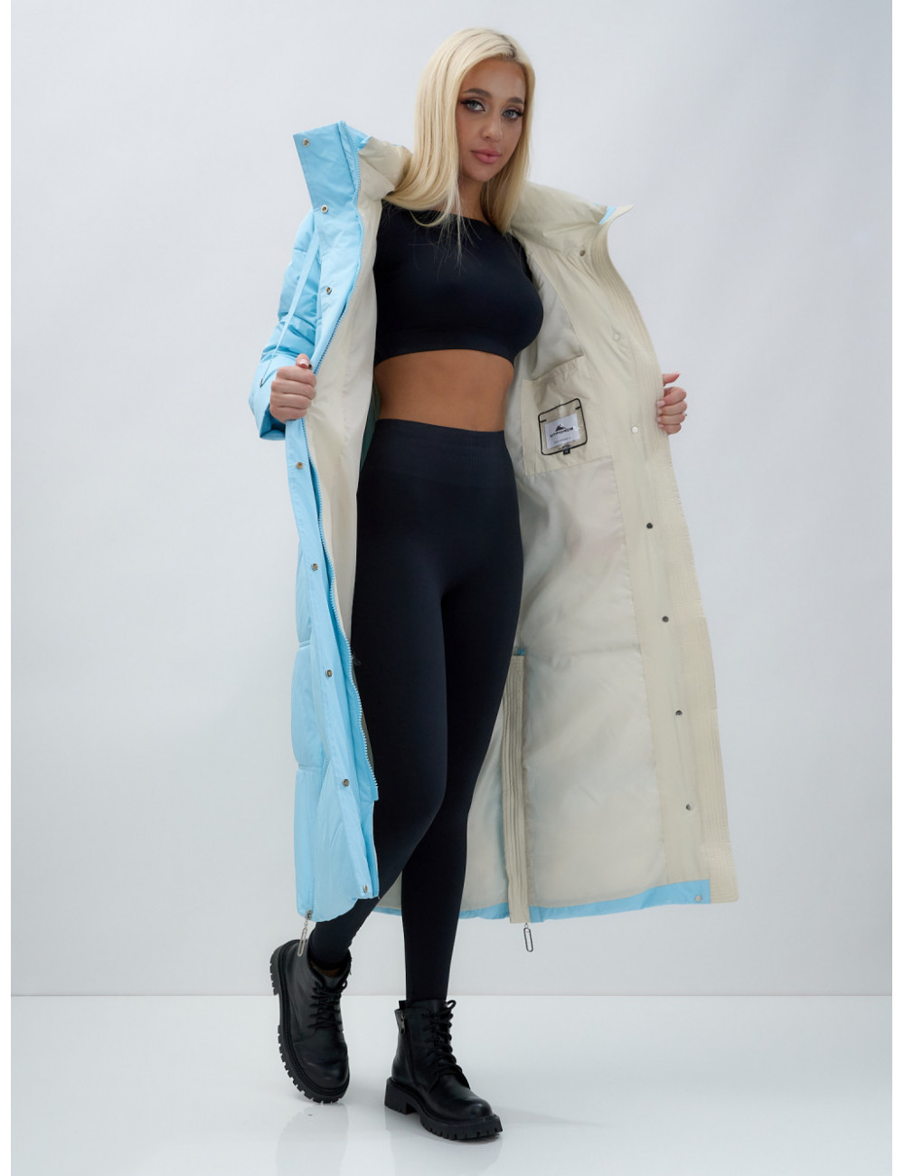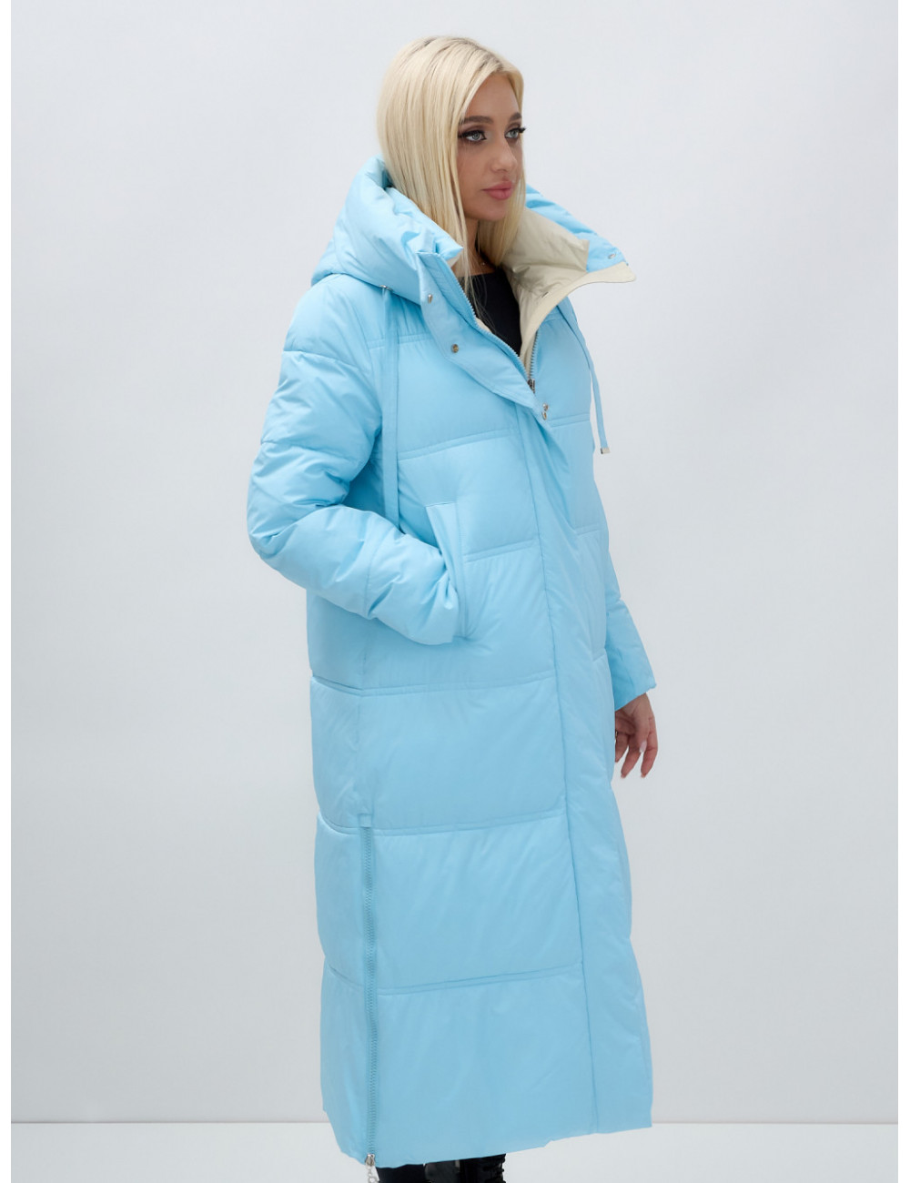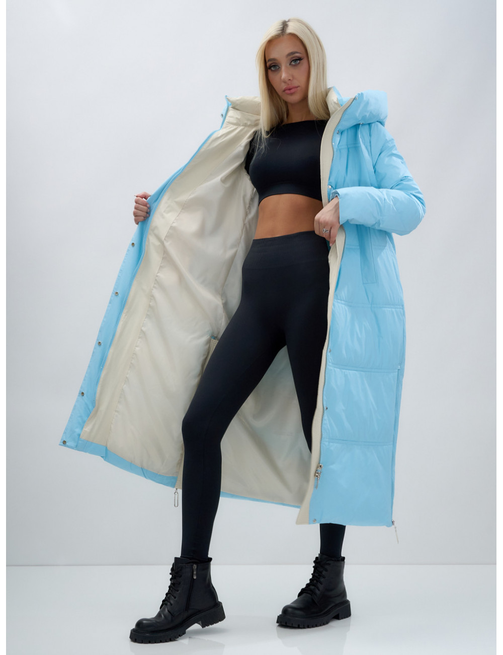 Пуховик-пальто женский утеплённый стёганый зимний с капюшоном голубой.