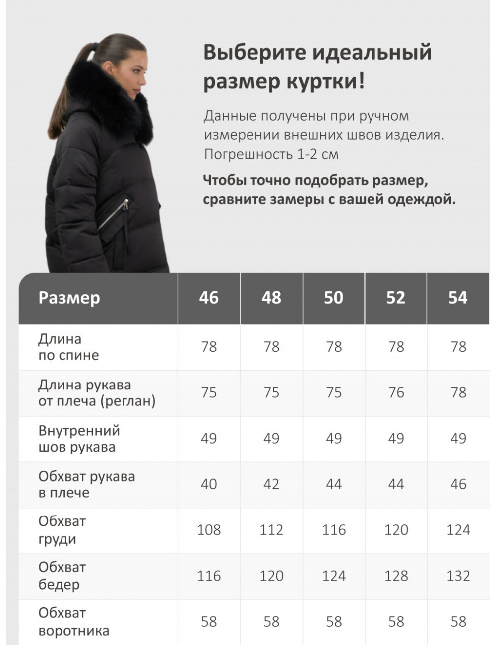 Пуховик представлен в размерах от 46 до 54. Профессиональный пошив гарантирует безупречную посадку для роста 158–190 см.