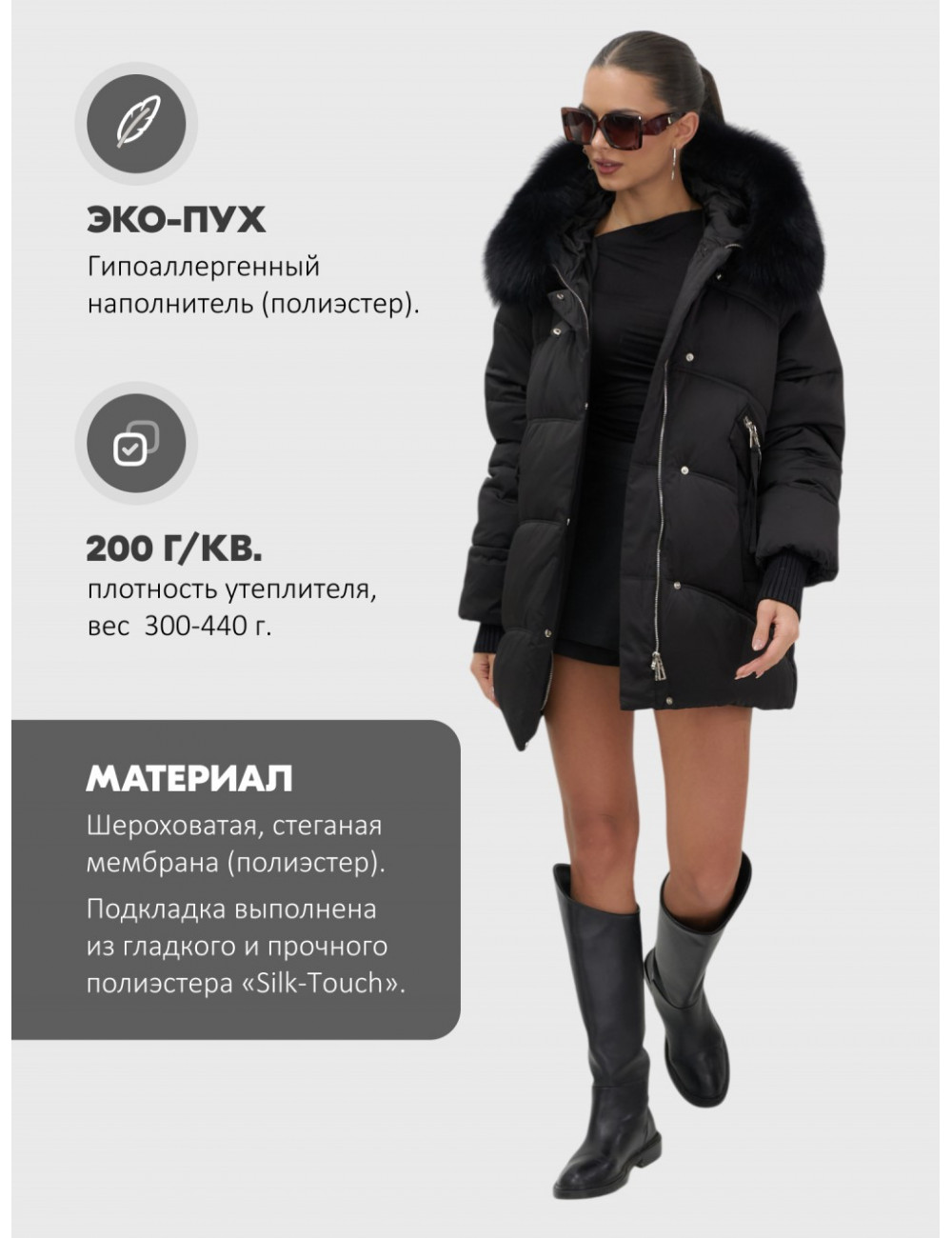 | Особенности модели | быстросохнущая, ветрозащита, водоотталкивающий материал, гипоаллергенный материал, дышащий материал, съемная опушка |