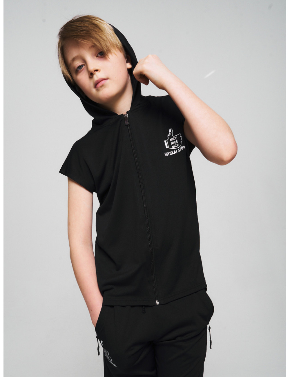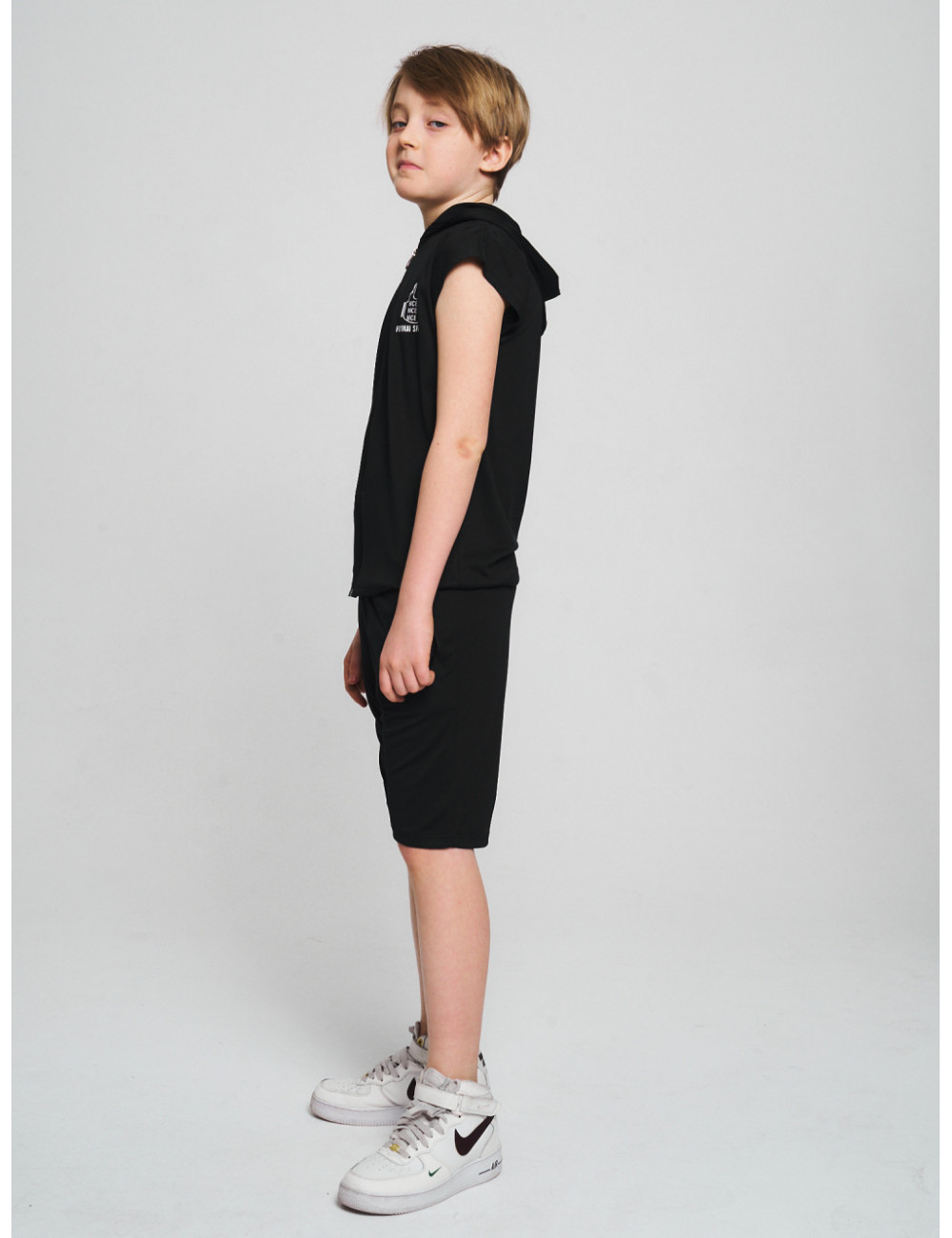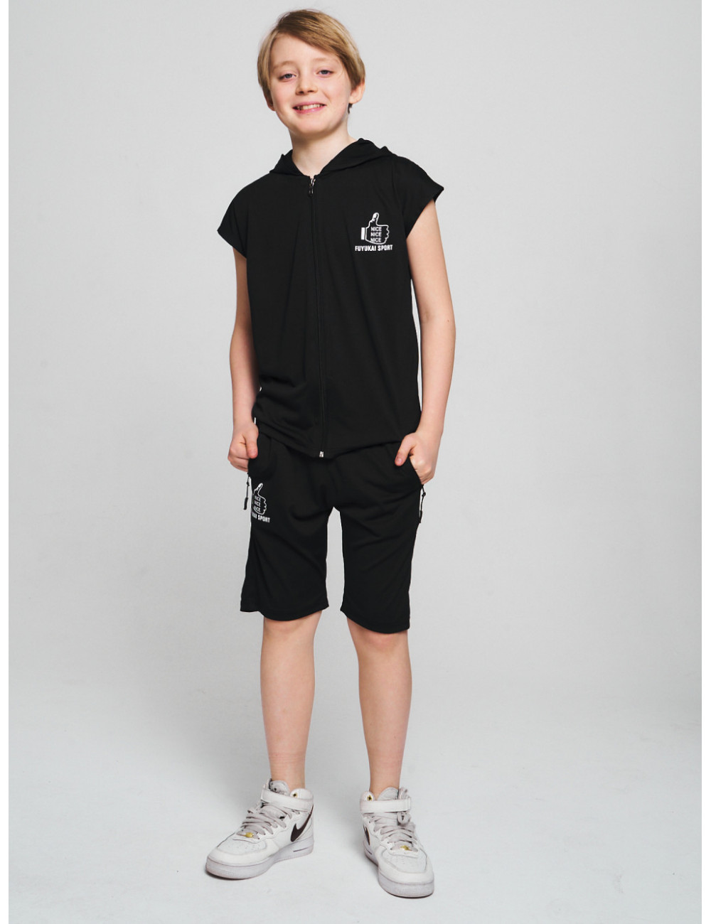 Оригинальный и уникальный летний костюм для мальчика включает футболку на молнии и эластичные шорты.