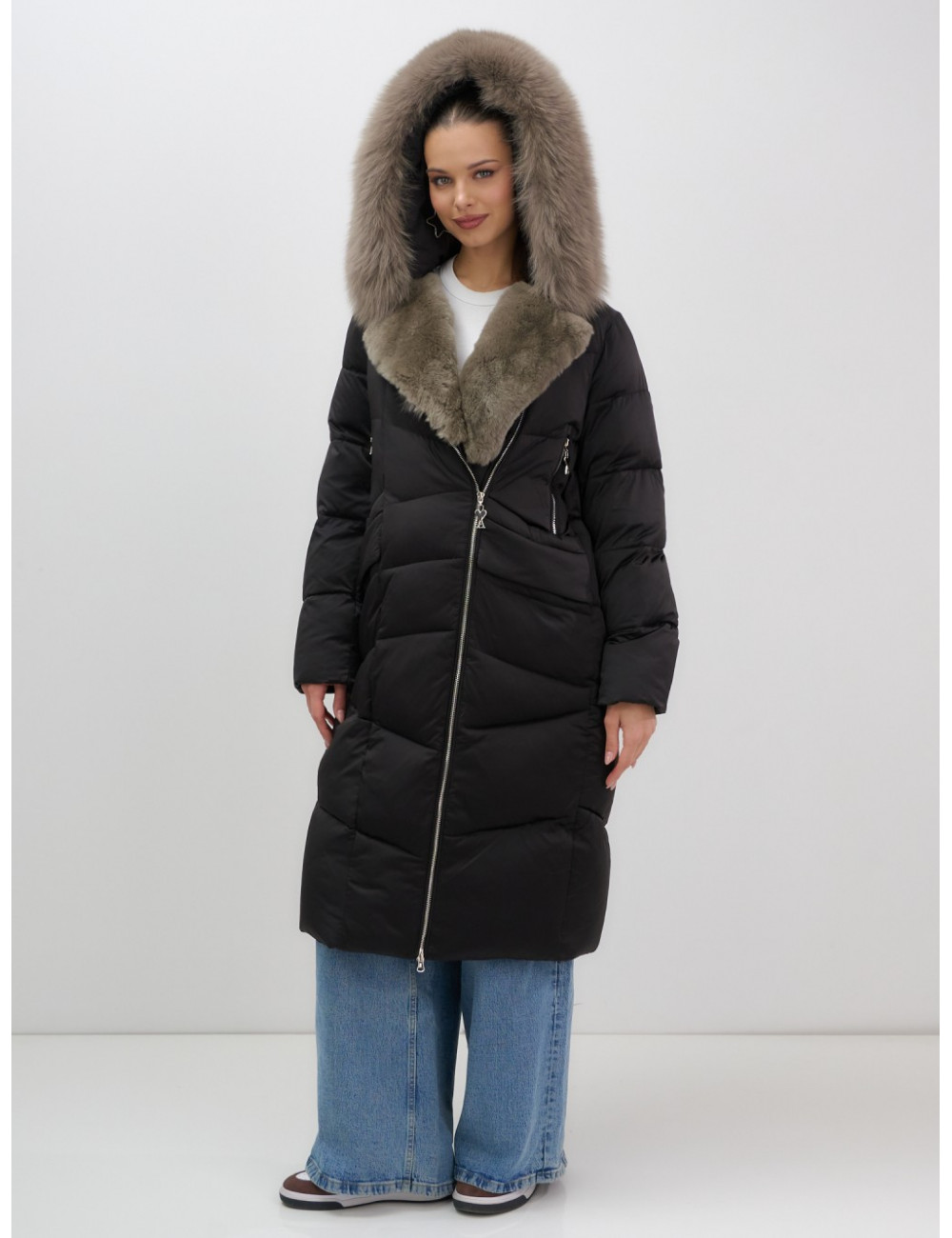 Купить за 21809 ₽ в Тюмени Утеплённый двубортный пуховик с мехом и капюшоном, чёрный Пуховик премиум-класса 2025: роскошь и комфорт