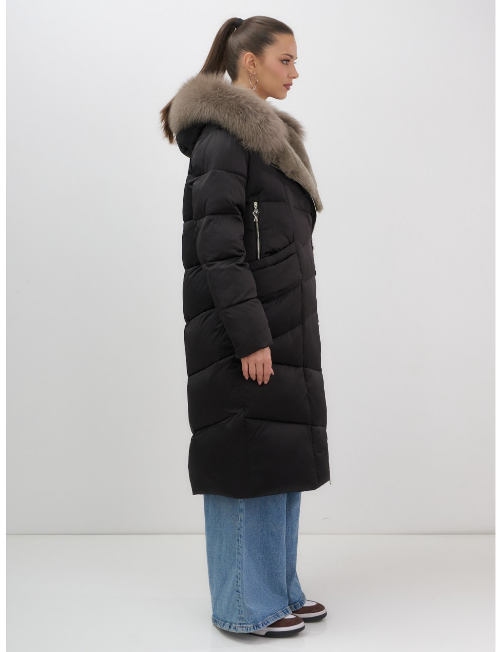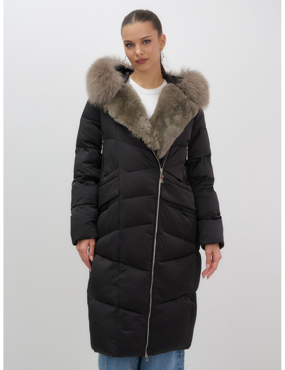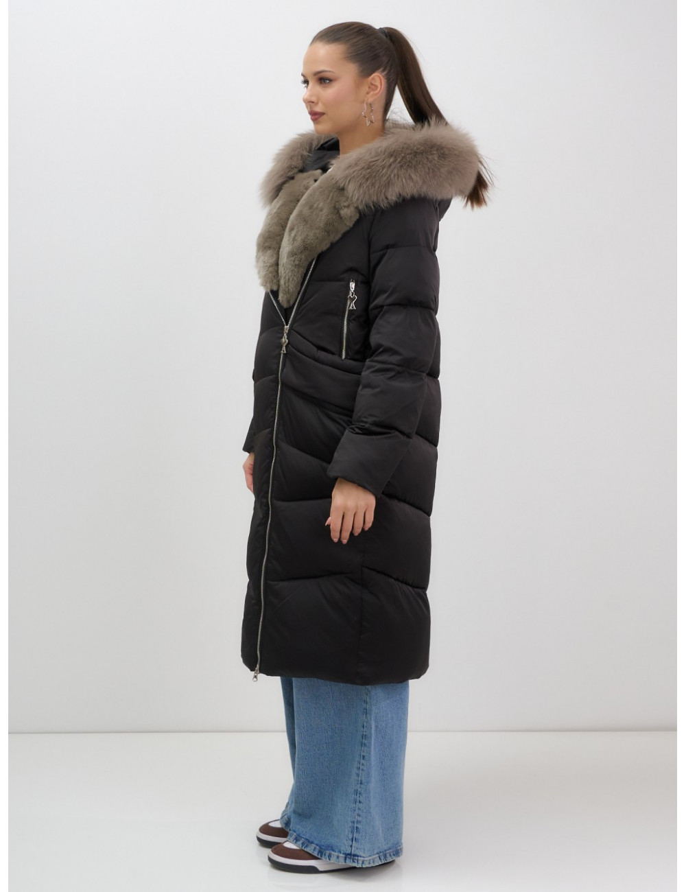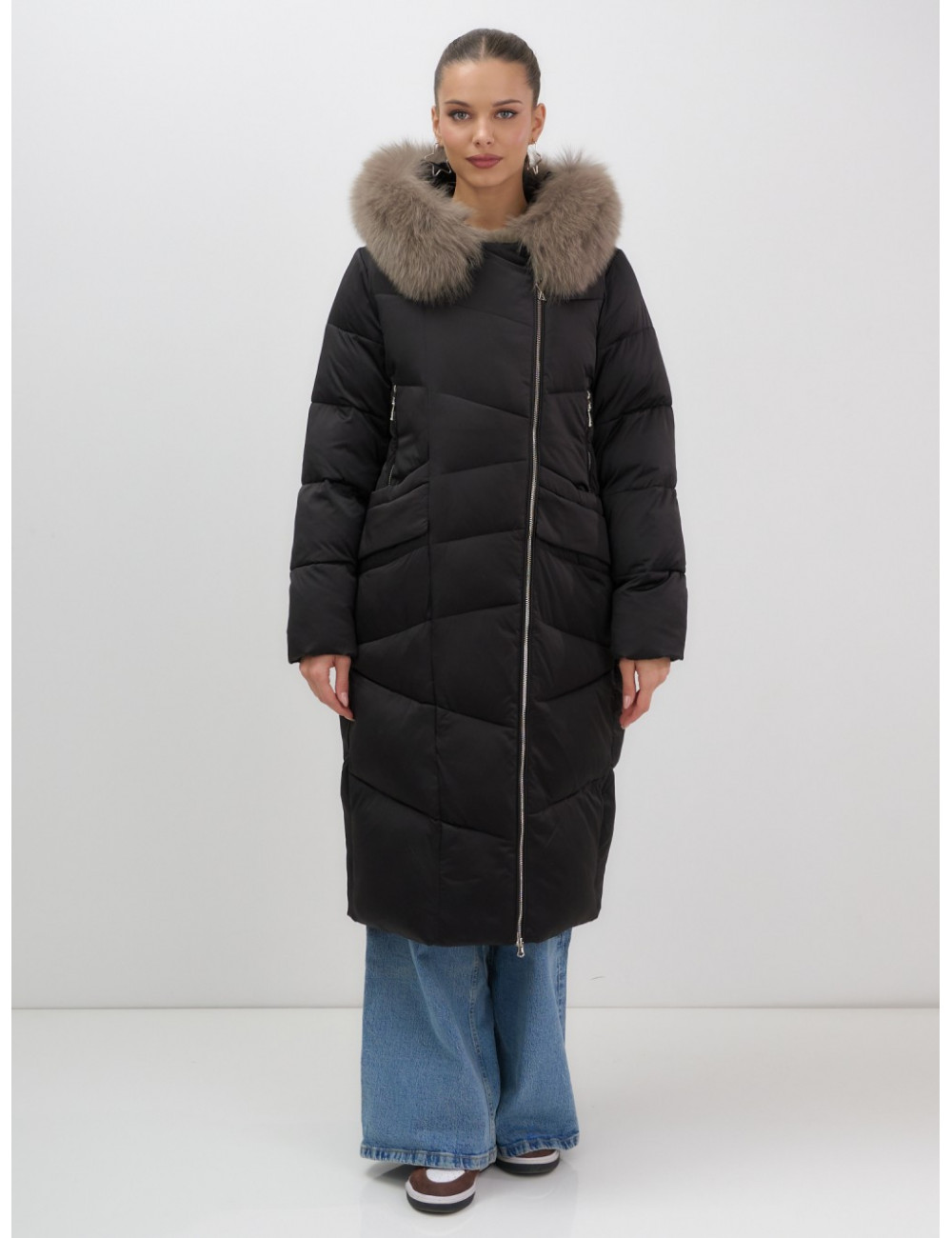 Утеплённый двубортный пуховик с мехом и капюшоном, чёрный