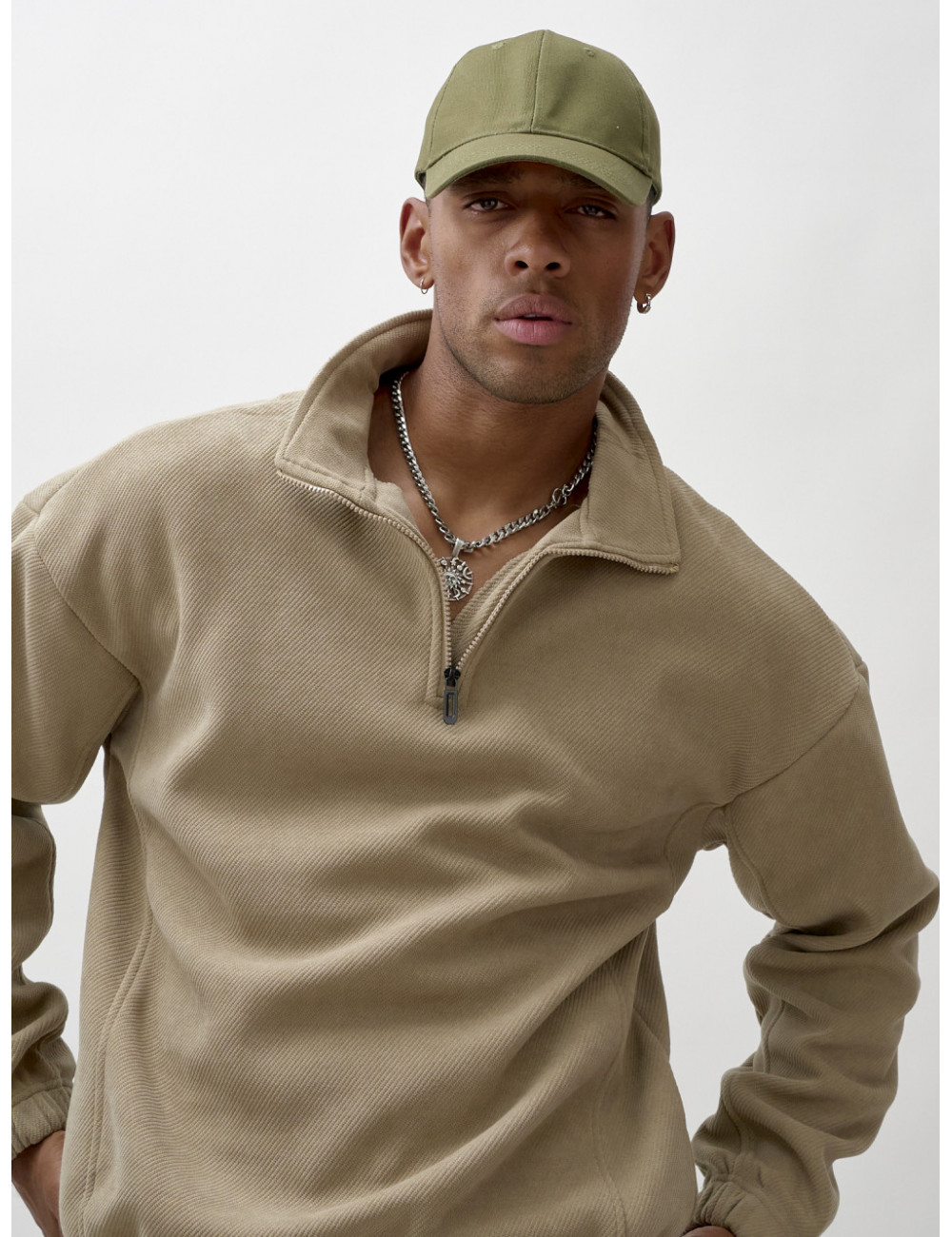 Худи с отложным воротником и спущенными плечами обеспечивает комфорт и свободу движений. Воротник-стойка на молнии не только добавляет стильный акцент, но и защищает от ветра.