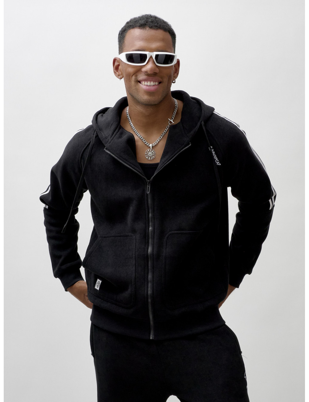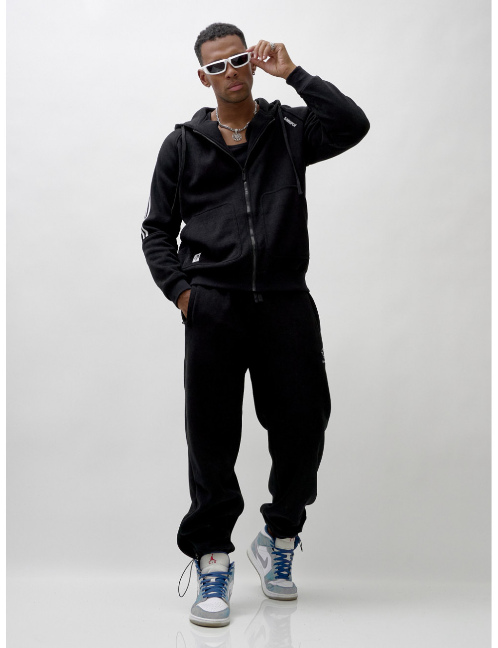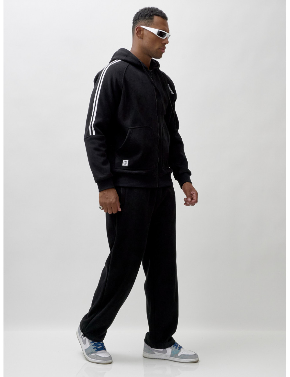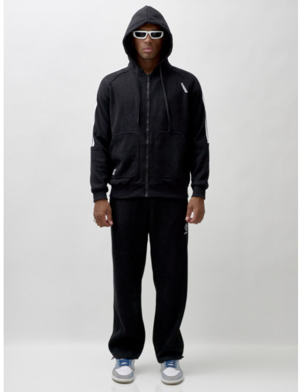 Олимпийка на молнии с глубоким несъёмным капюшоном обеспечит удобство и тепло. Накладные боковые карманы — идеальное место для хранения мелочей или согревающих рук. Спортивные брюки свободного кроя обеспечивают максимальную свободу движений и комфорт. Прорезные боковые карманы позволяют удобно хранить необходимые вещи, а резинка с фиксатором на штанине обеспечивает надёжную посадку и стильный вид.