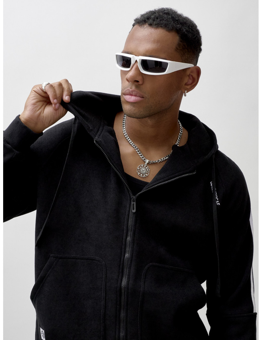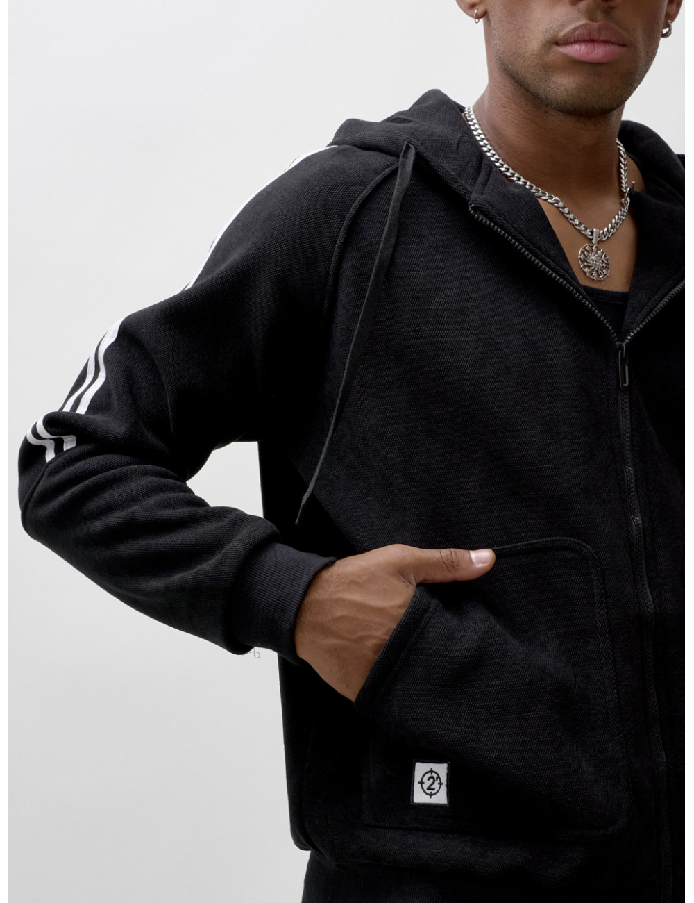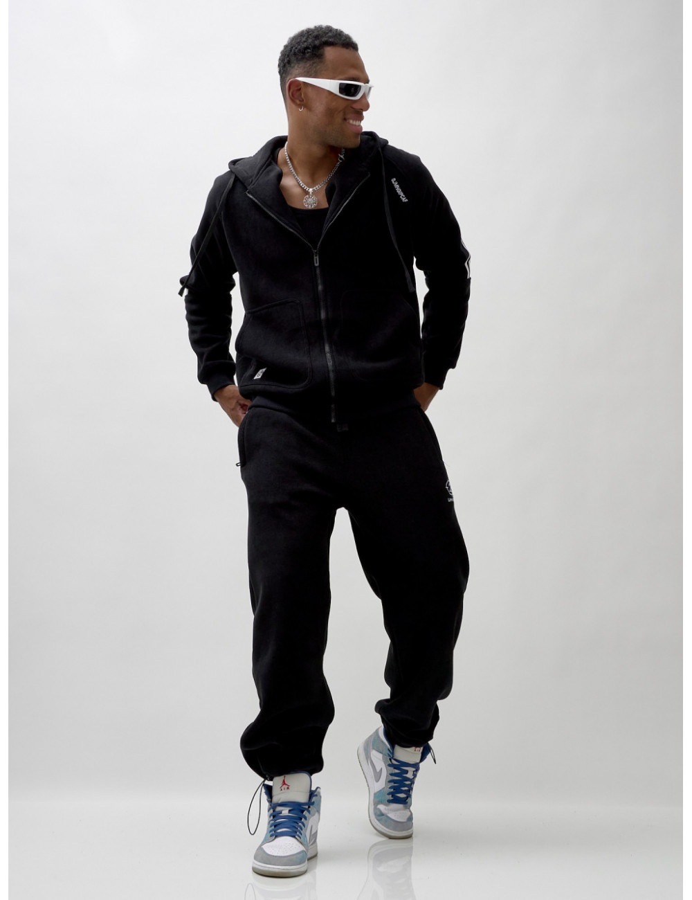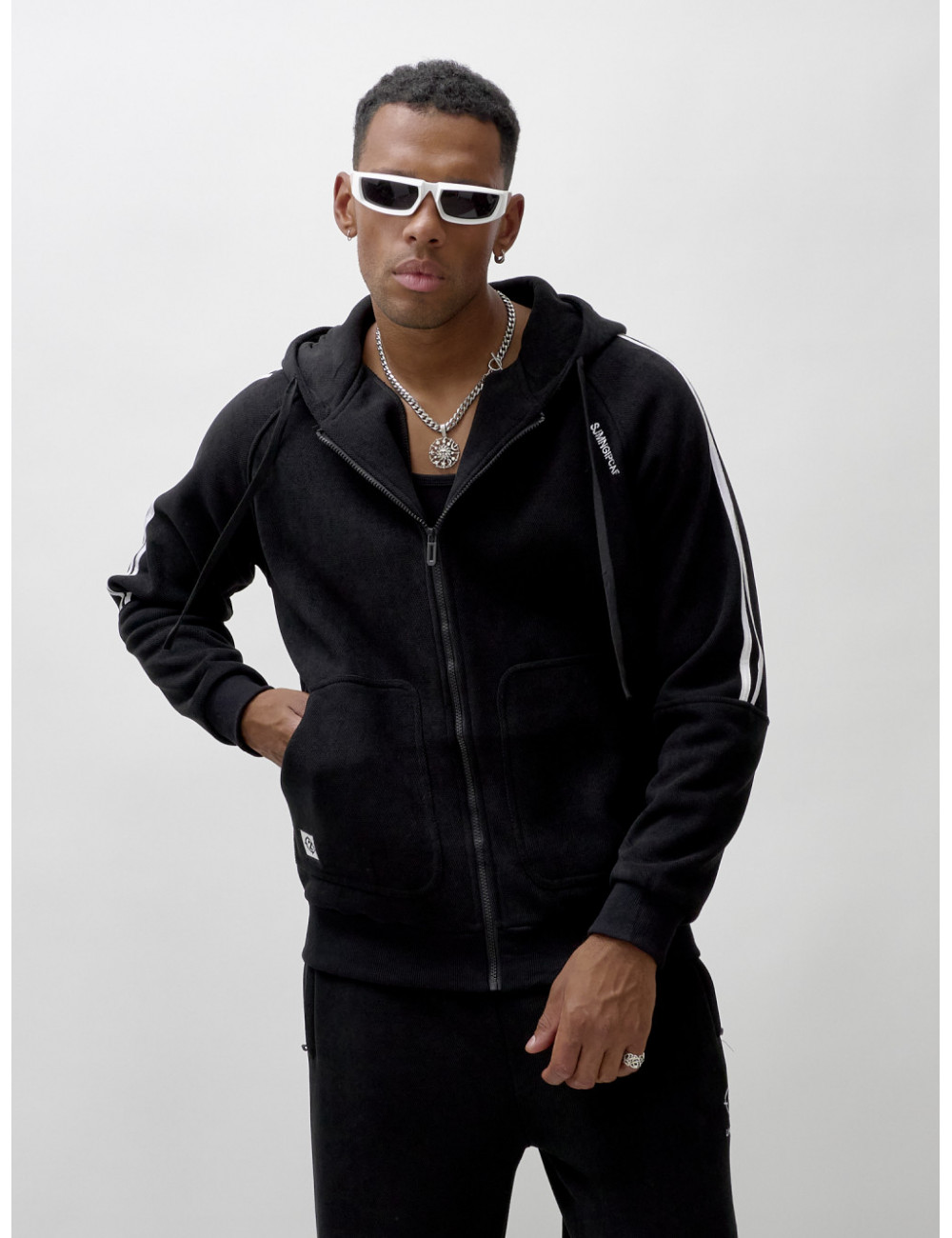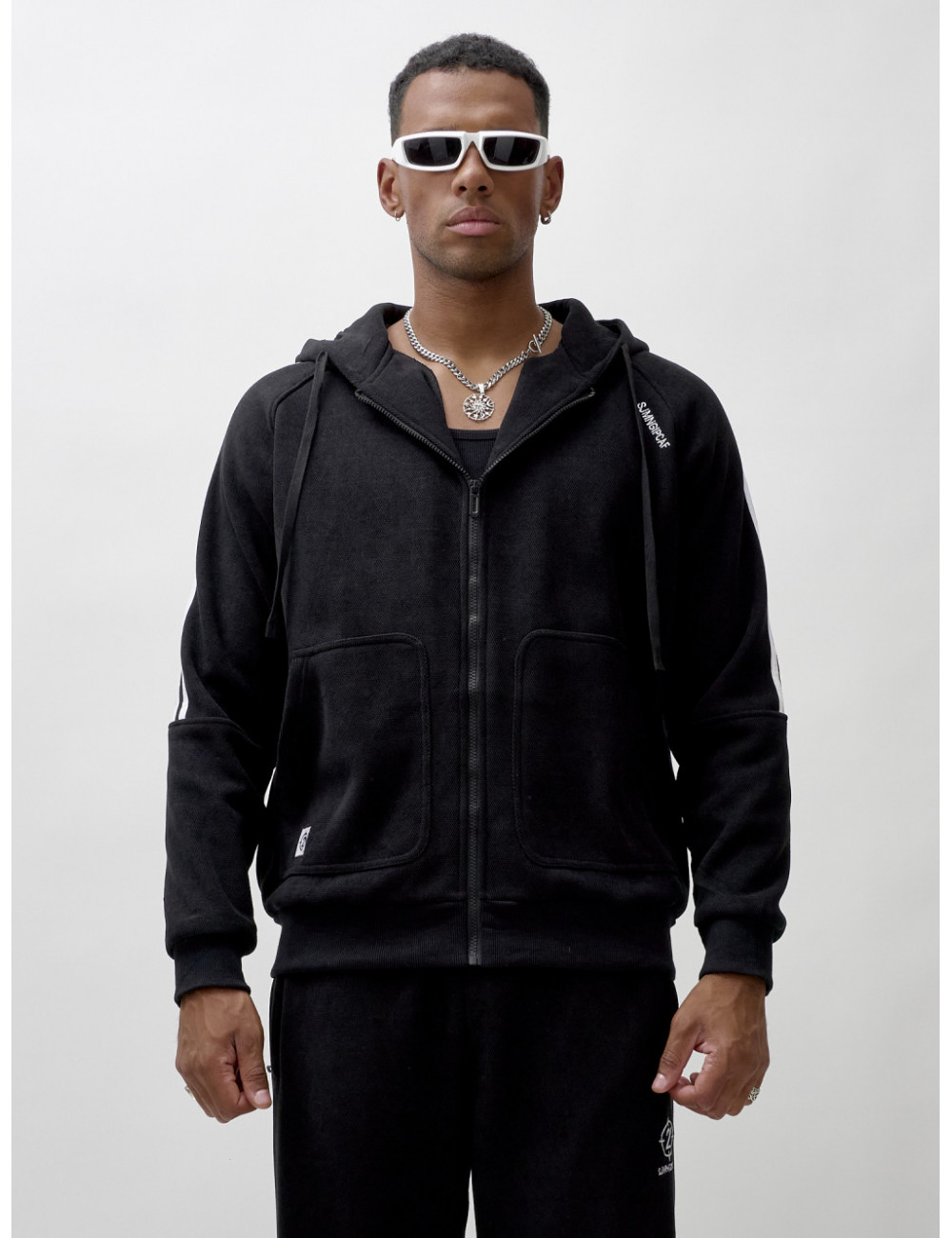 Олимпийка на молнии с глубоким несъёмным капюшоном обеспечит удобство и тепло. Накладные боковые карманы — идеальное место для хранения мелочей или согревающих рук. Спортивные брюки свободного кроя обеспечивают максимальную свободу движений и комфорт. Прорезные боковые карманы позволяют удобно хранить необходимые вещи, а резинка с фиксатором на штанине обеспечивает надёжную посадку и стильный вид.