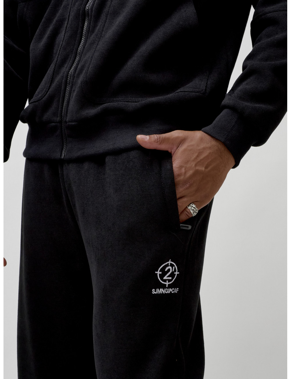 Костюм изготовлен из мягкого и приятного на ощупь материала с бархатистой фактурой, напоминающей плотный велюр. Внутренний флис добавляет дополнительное тепло и уют, делая этот костюм идеальным выбором для холодных дней.