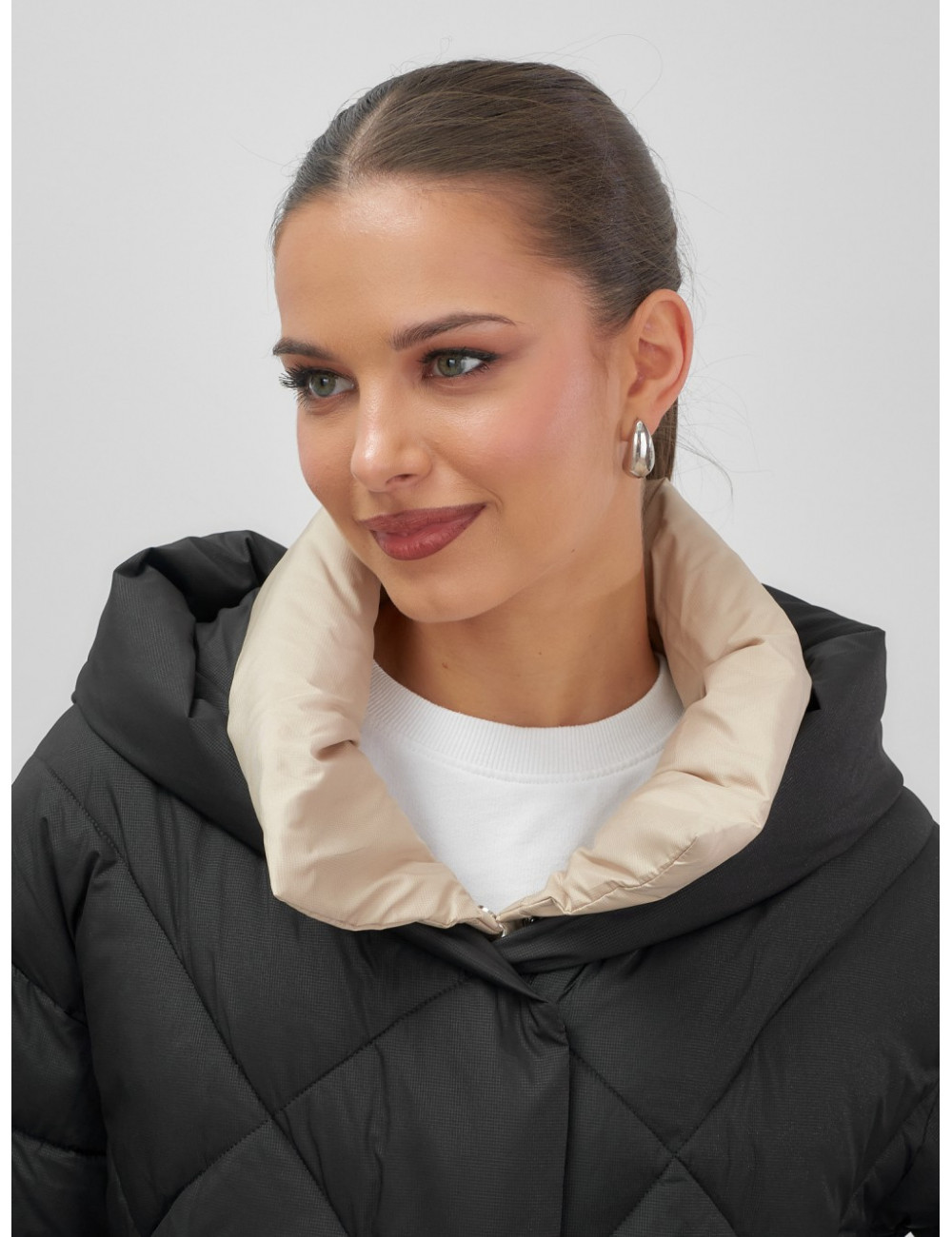 Пуховик представлен в различных цветах: чёрном, сером, бежевом и бирюзовом. Среди особенностей модели — быстросохнущие свойства, гипоаллергенный и дышащий материал, а также корректирующий эффект, который подчёркивает фигуру.