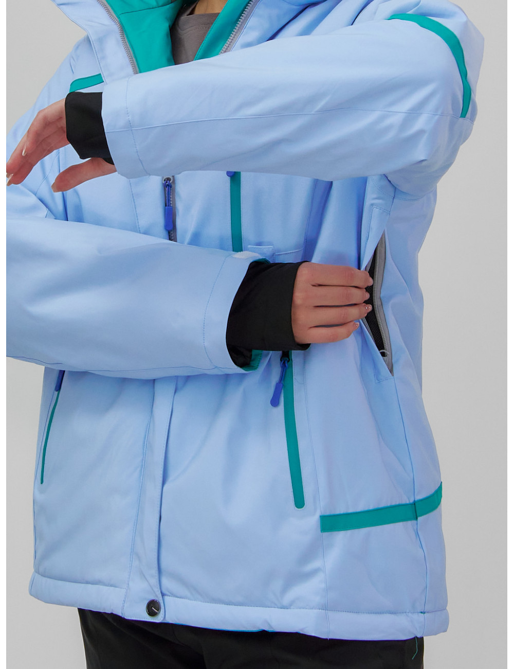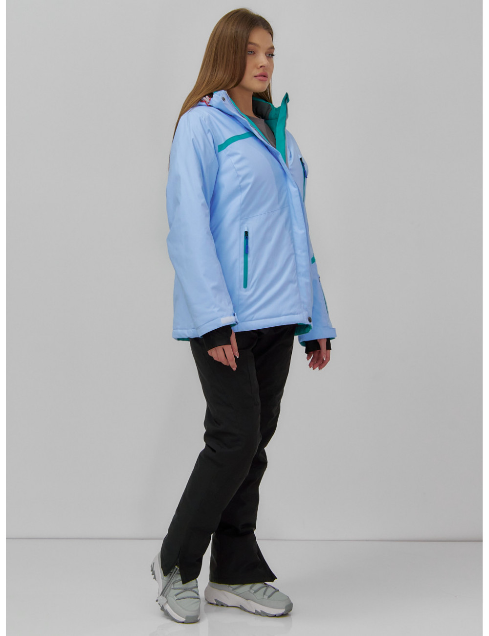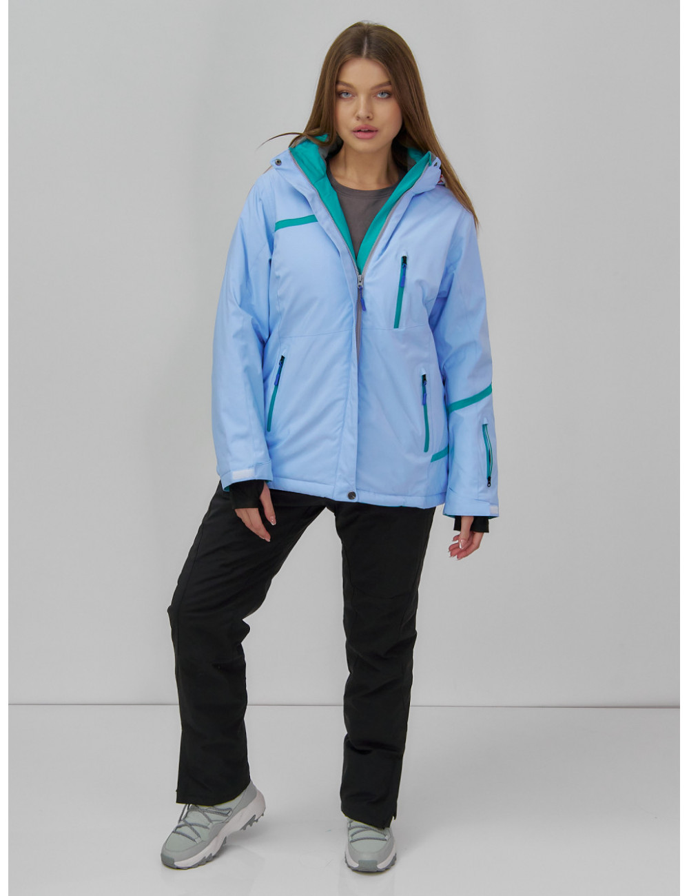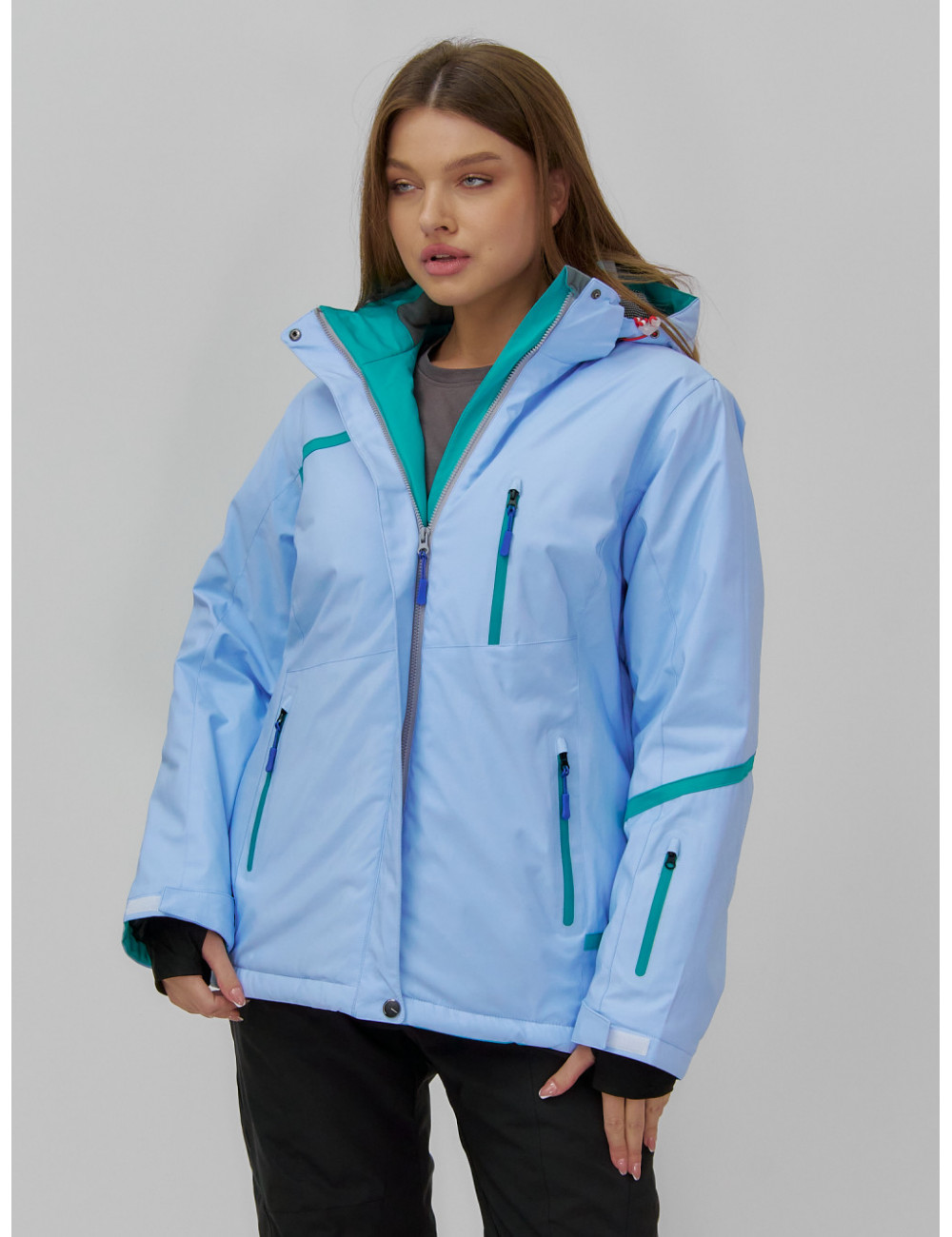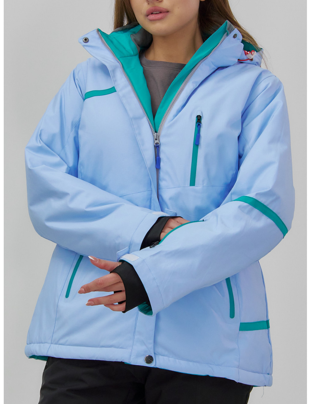 Куртка гармонично сочетается с горнолыжными брюками, термобельём и тёплыми аксессуарами, такими как шапки, перчатки и шарфы. Доставка по Москве и Московской области Женская горнолыжная куртка большого размера, голубая. Зима.