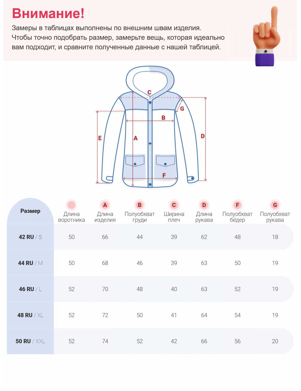 Мы предлагаем куртку в различных размерах, чтобы каждый мог найти свой идеальный вариант. Рекомендуется измерить основные параметры (длина куртки, полуобхват груди, длина плеч по спине и т. д.) и сравнить их с размерной сеткой, чтобы выбрать наиболее подходящий размер.