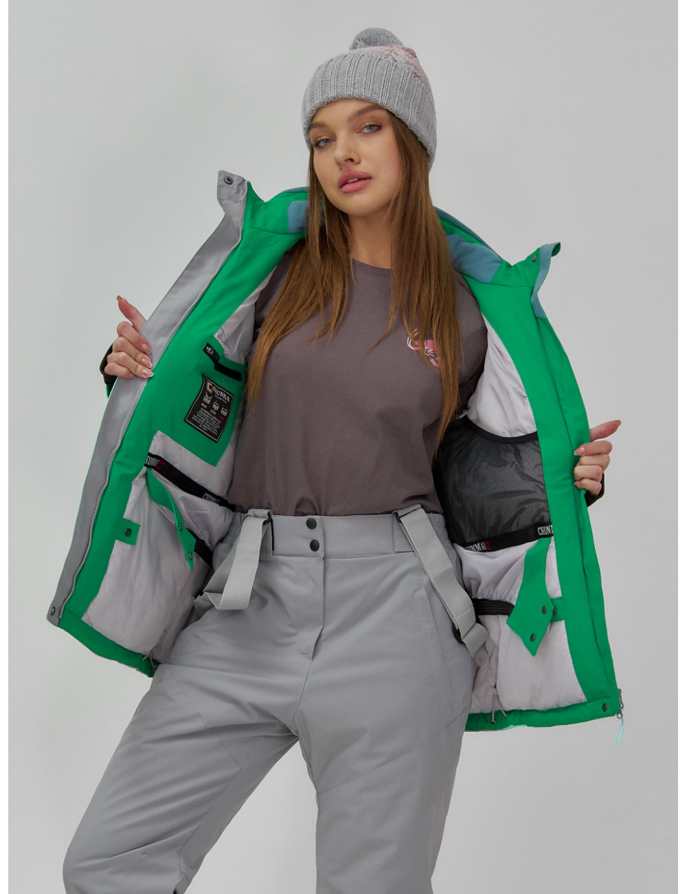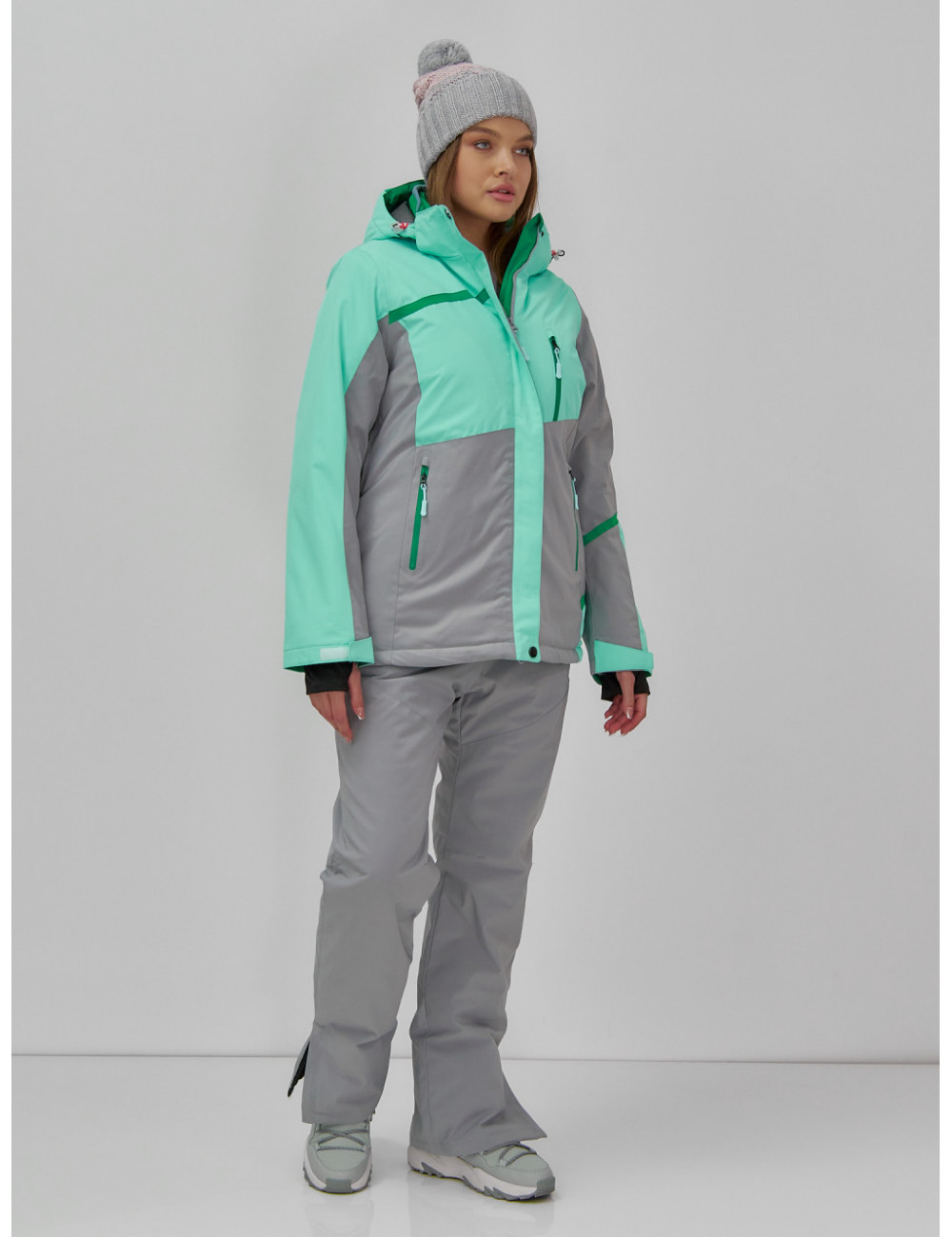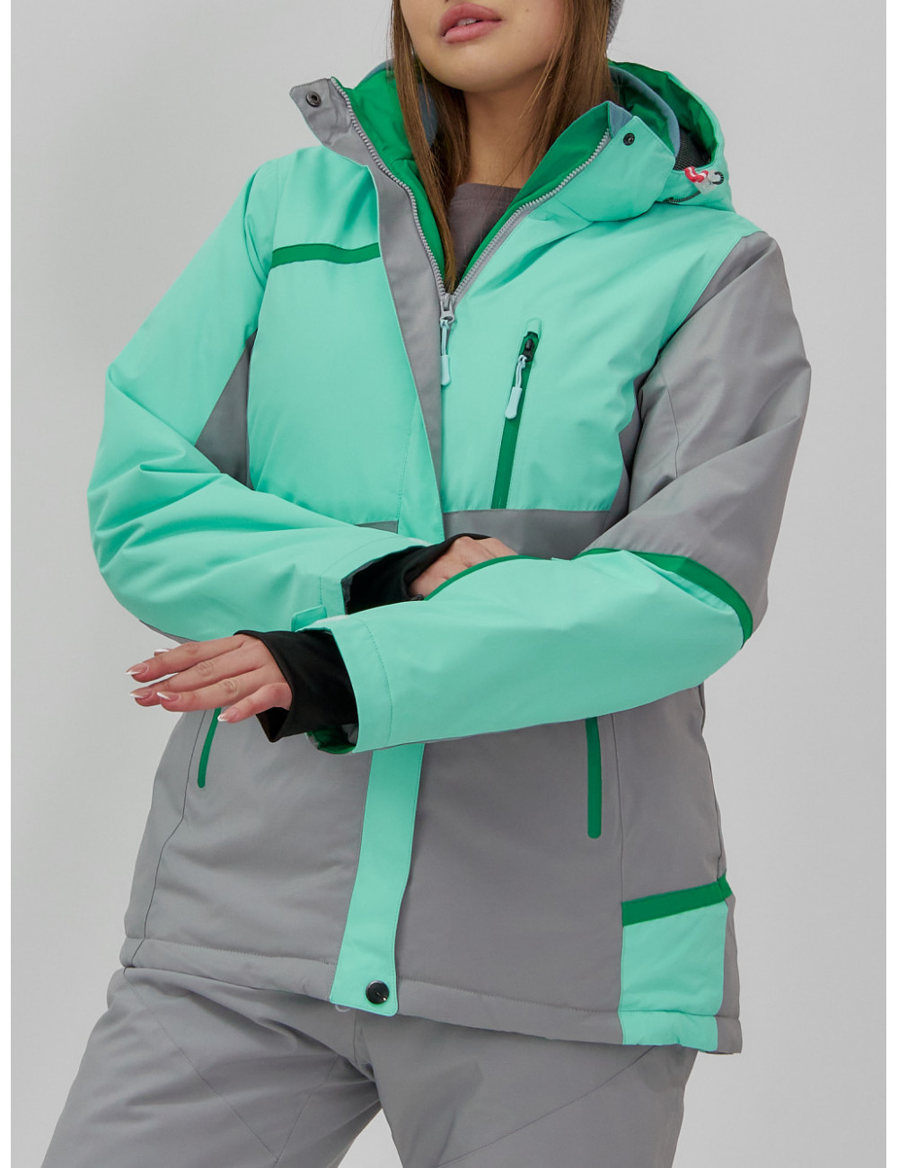 Дарим бесплатную доставку на заказы от 5000 рублей. Женская горнолыжная куртка с ярким принтом Доставка Горнолыжная женская куртка для зимы бирюзового цвета по Тюмени и Тюменской области СДЭК
