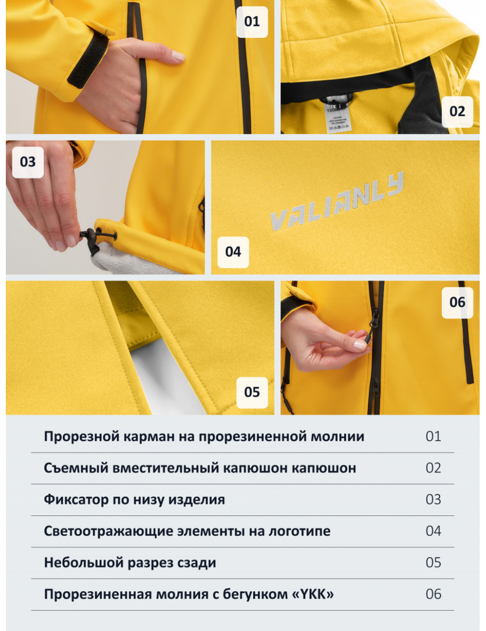 Модель оснащена съёмным капюшоном, длинными рукавами с фиксаторами, прорезным карманом на молнии и светоотражающими элементами.