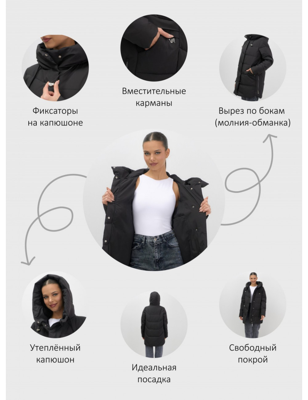 | Декоративные элементы | Капюшон, Карманы, Манжеты, Молния |