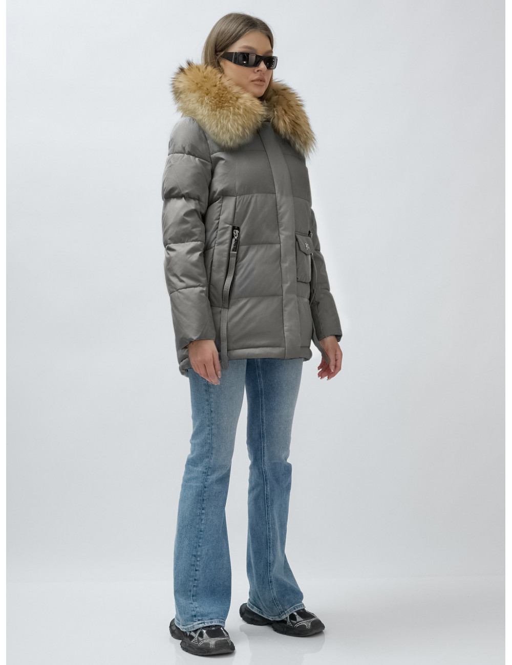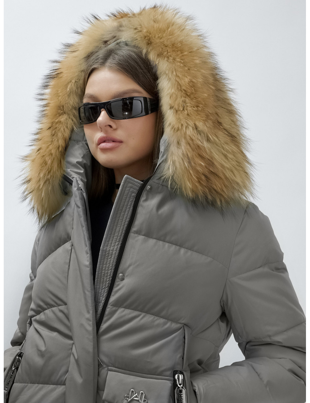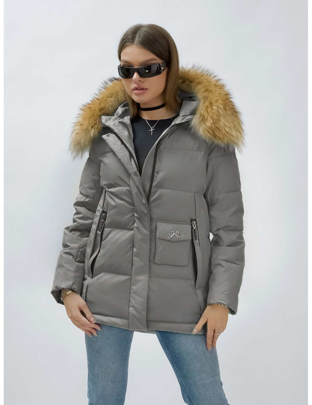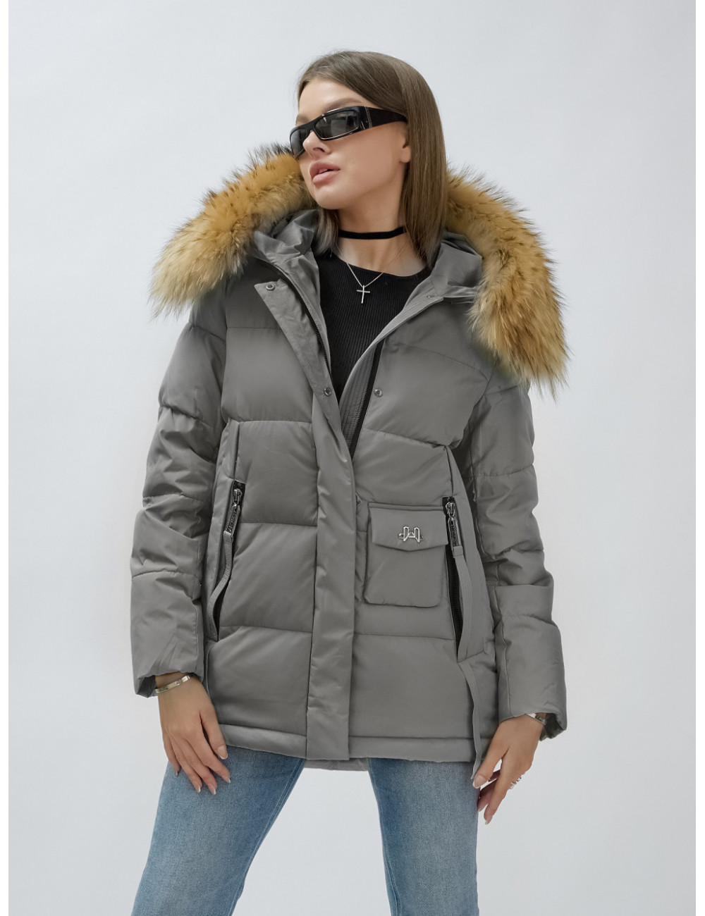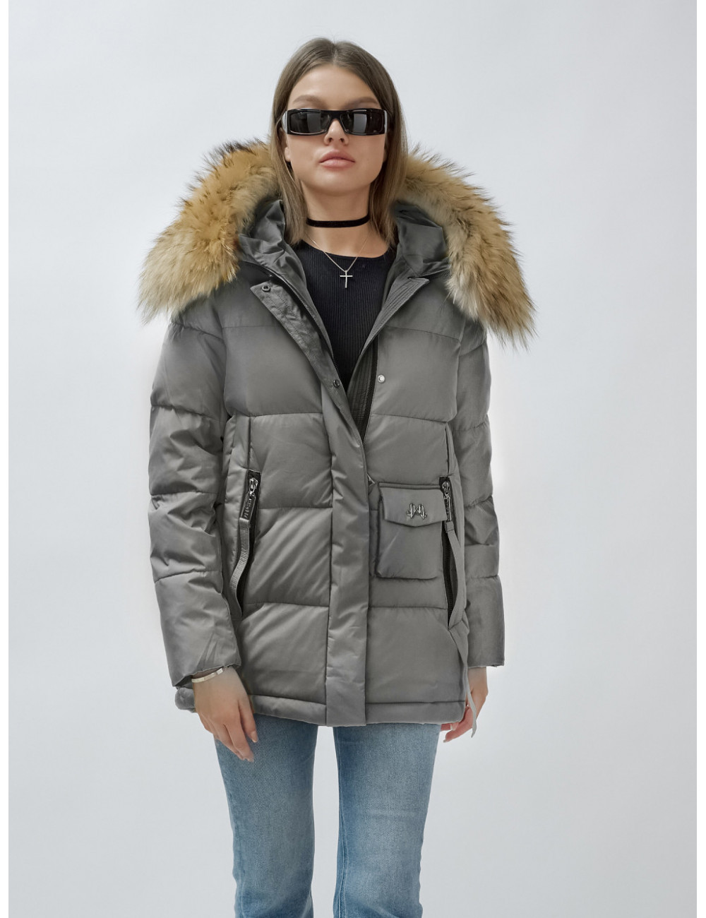Доставка Пуховик женский зимний с мехом енота премиум-класса, серый. по Тюмени и Тюменской области СДЭК