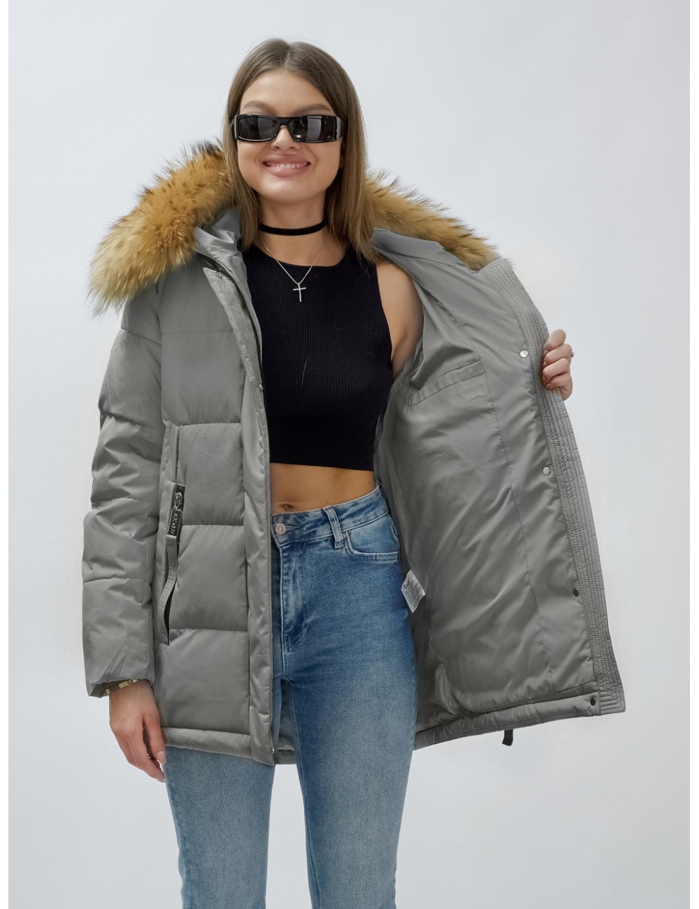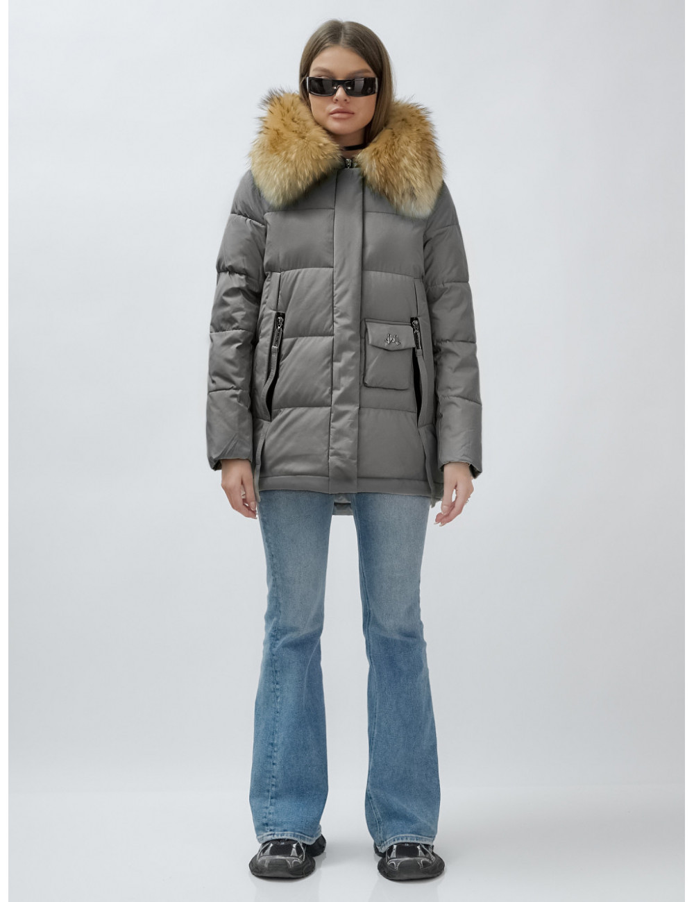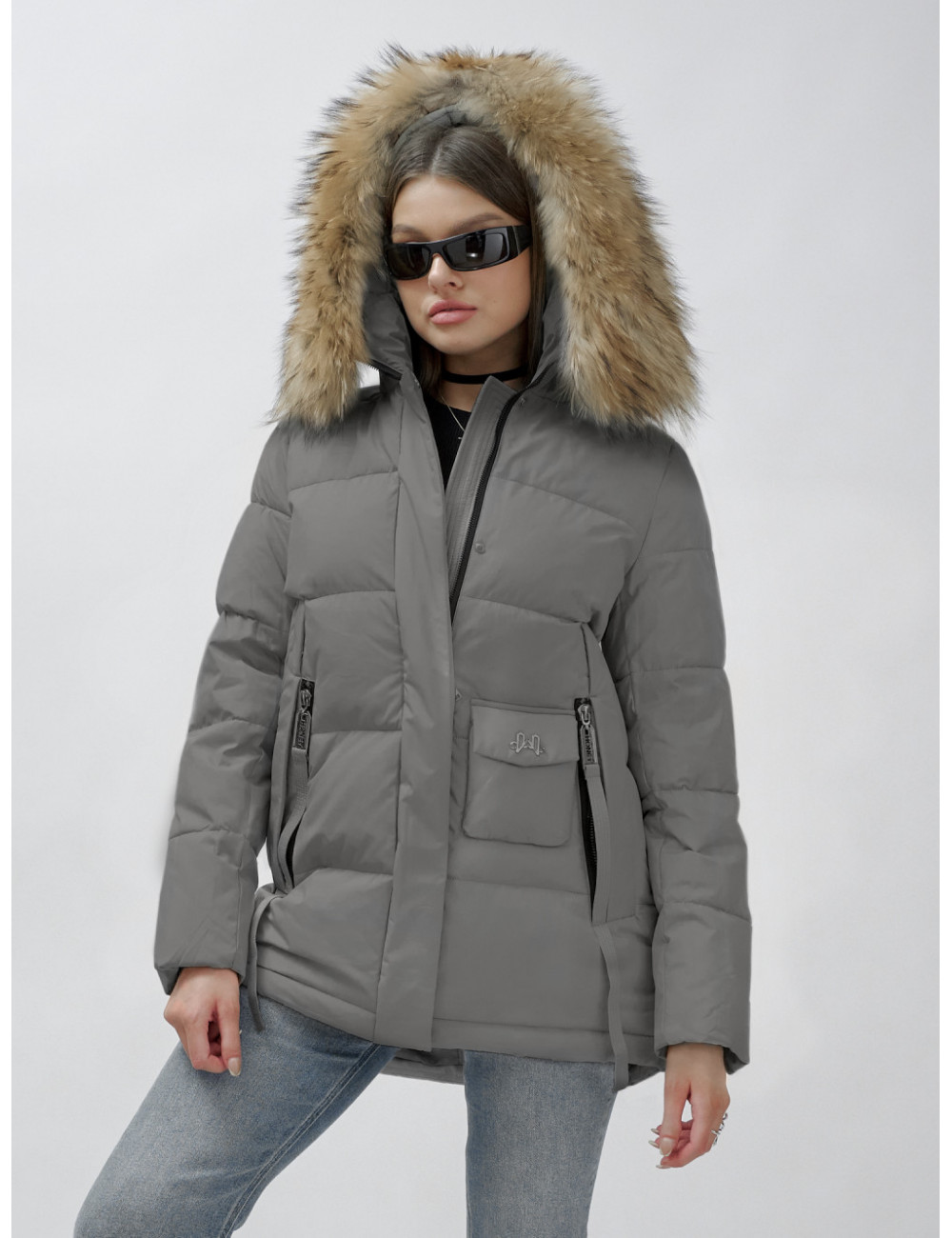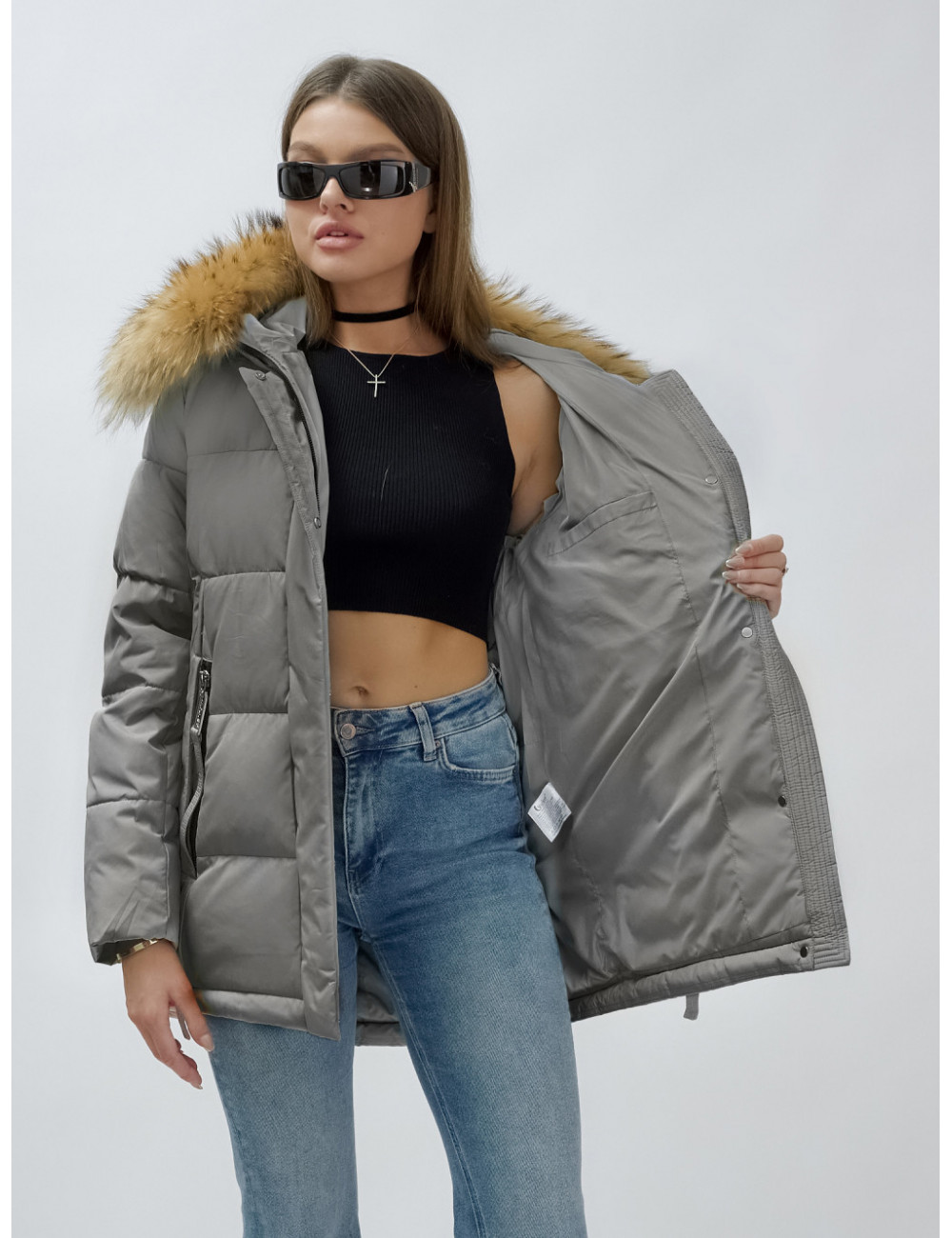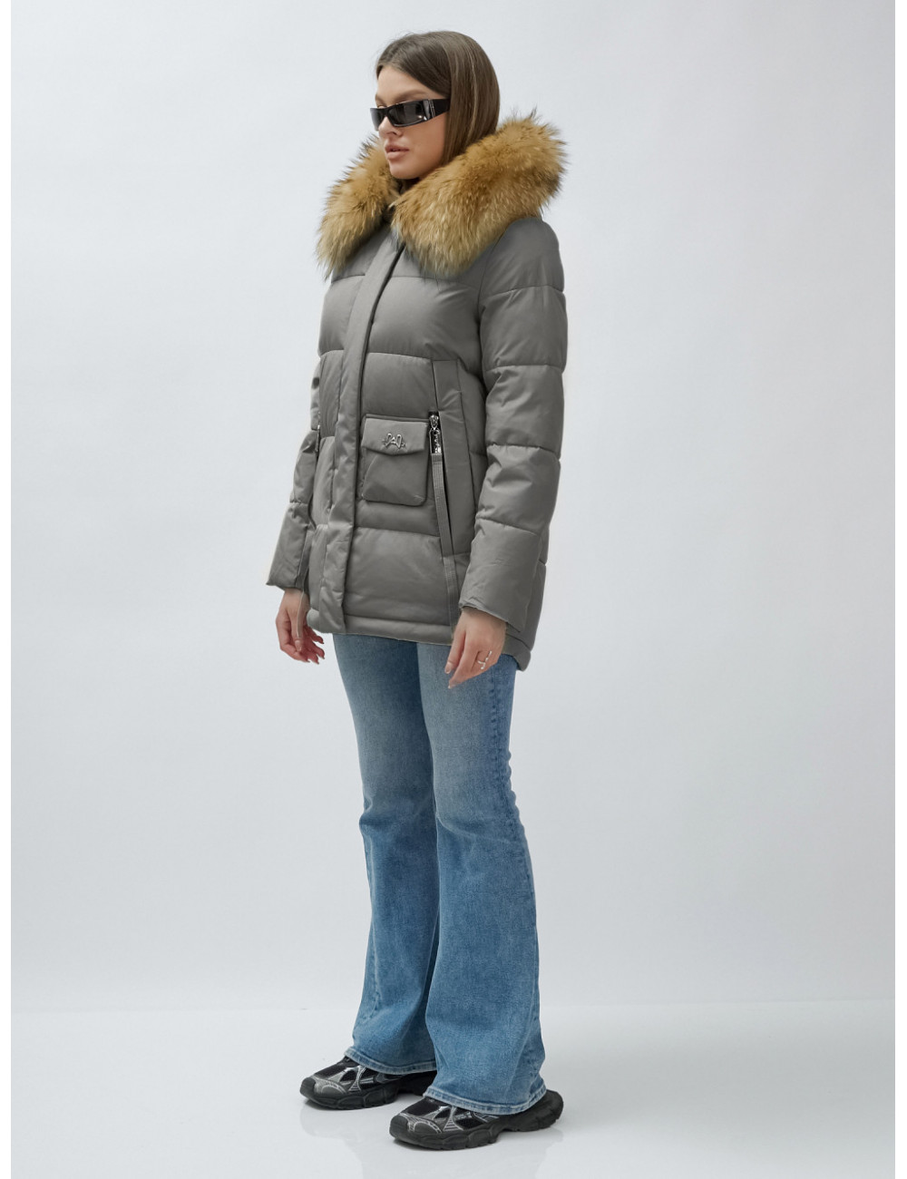 Доставка Пуховик женский зимний с мехом енота премиум-класса, серый. по Тюмени и Тюменской области СДЭК