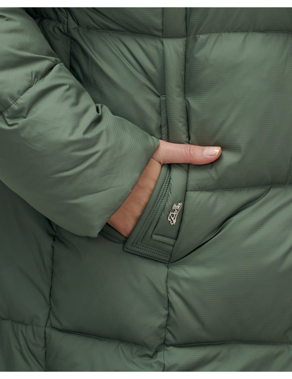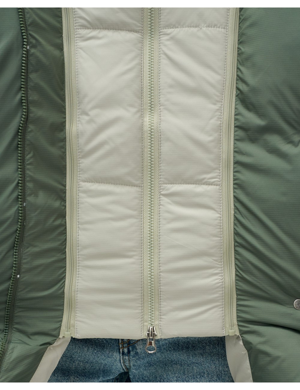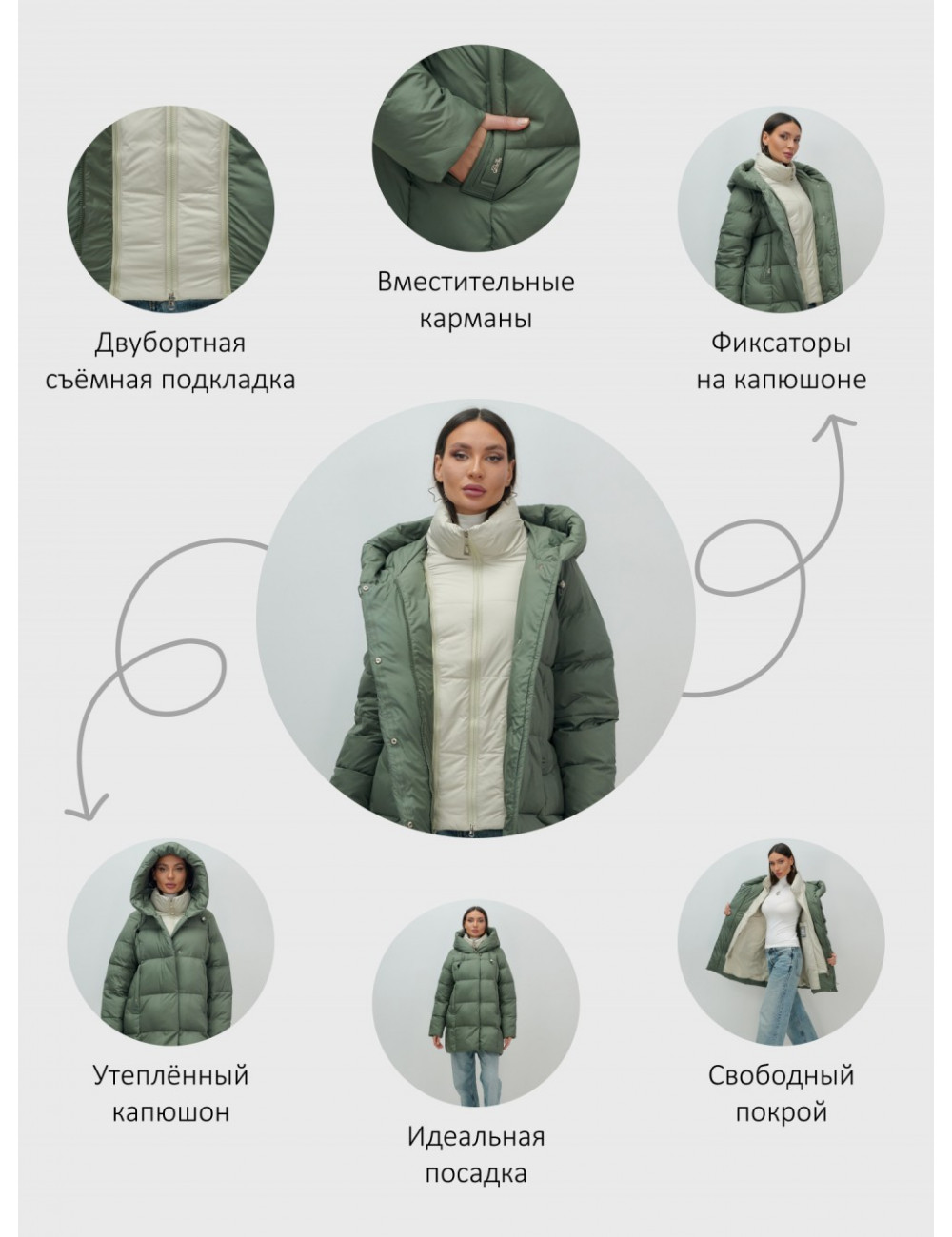 У модели есть укороченный подол, внутренние карманы и фиксатор на капюшоне. Длинные рукава на манжете и съёмный воротник добавляют функциональности.