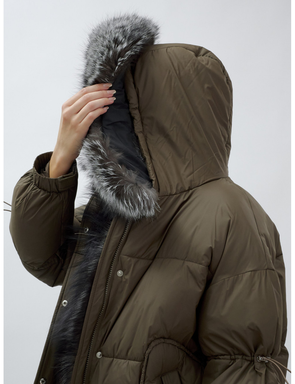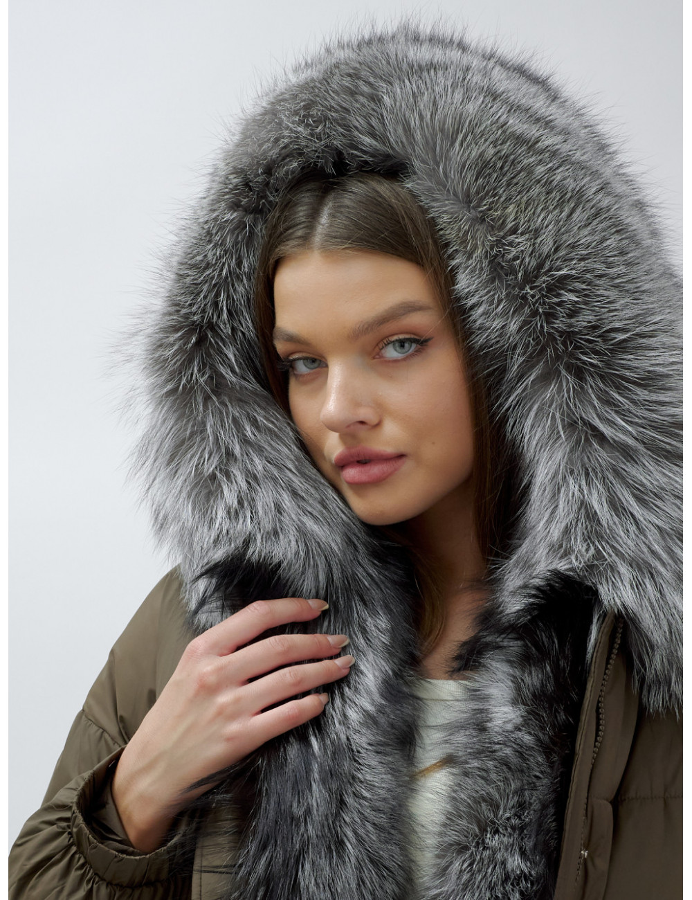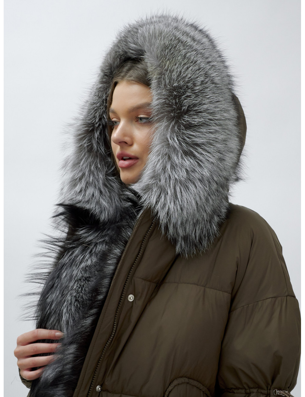- Опушка из меха чернобурки: элегантная опушка добавляет изысканности и стиля, подчёркивая вашу индивидуальность. Мех согревает не только голову, но и грудь.