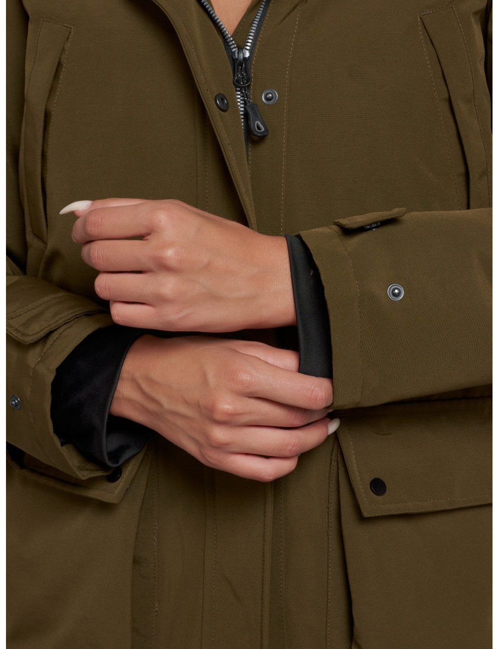 Функциональность. Парка оснащена девятью карманами — прорезными и накладными, а также внутренним карманом на молнии для хранения мелочей.