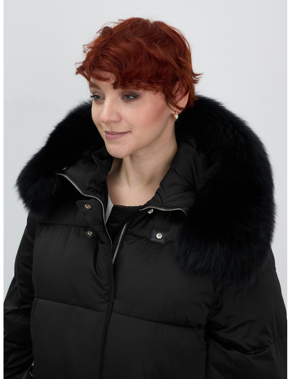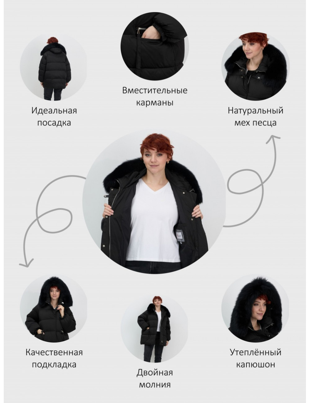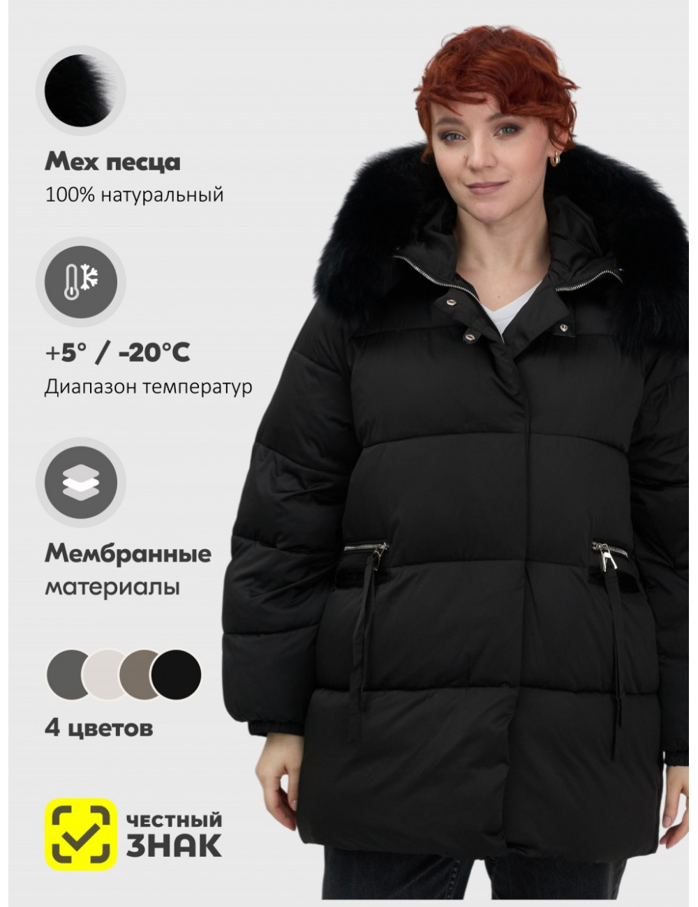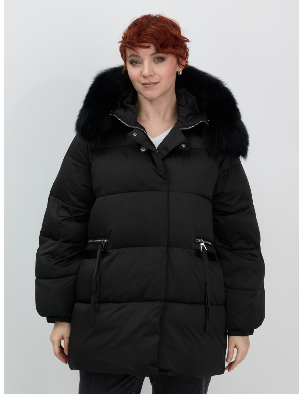 Технические характеристики Женский чёрный пуховик с мехом и капюшоном.