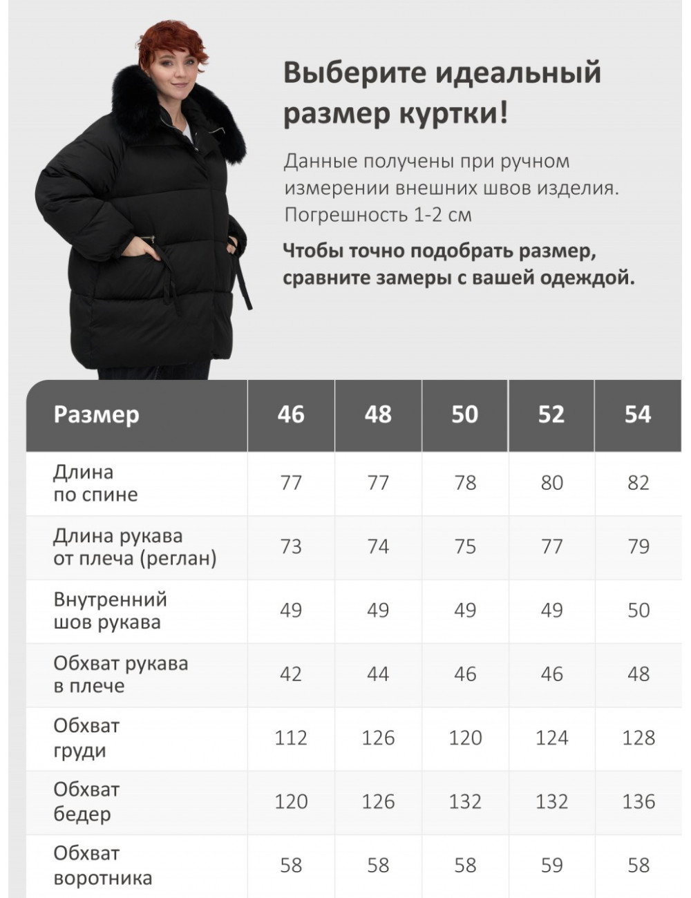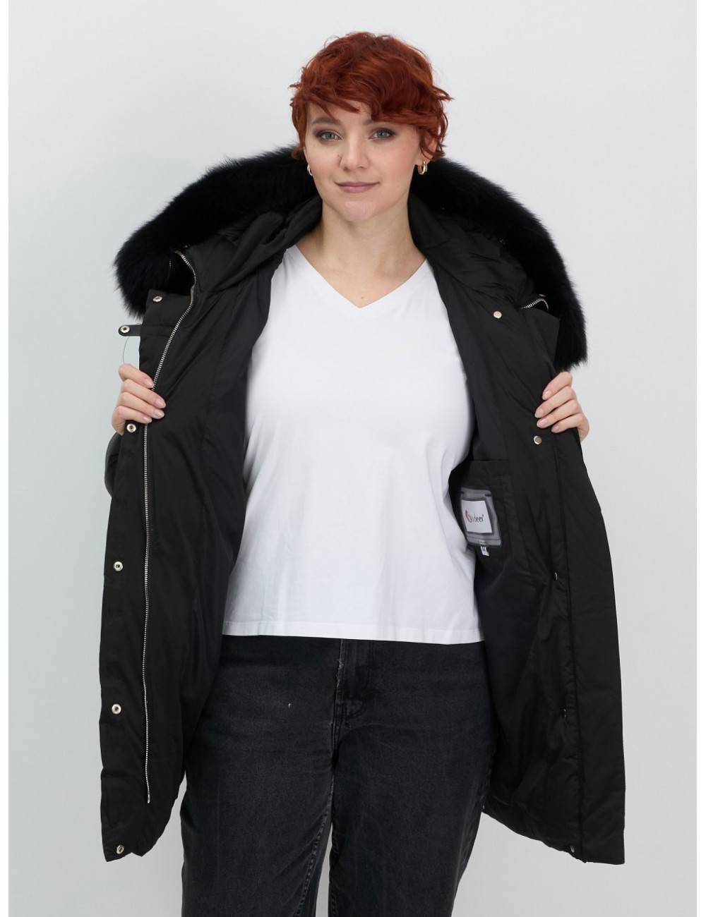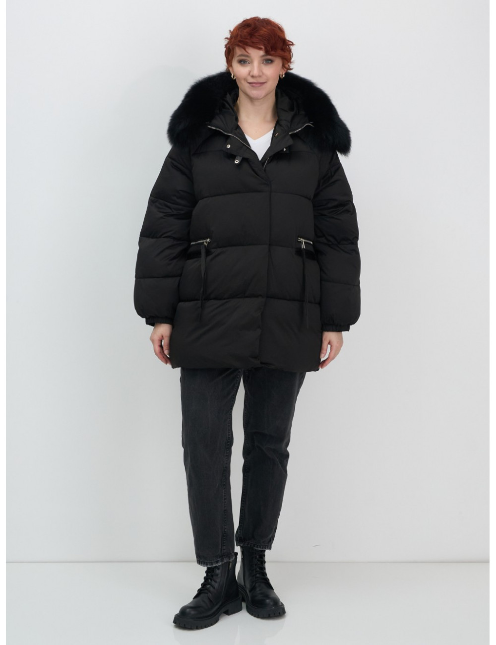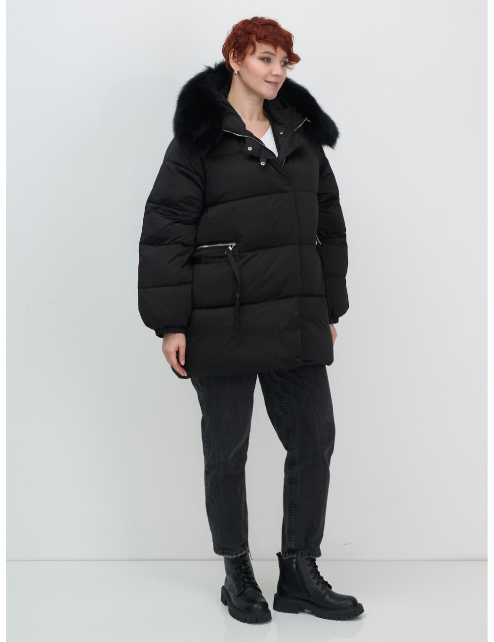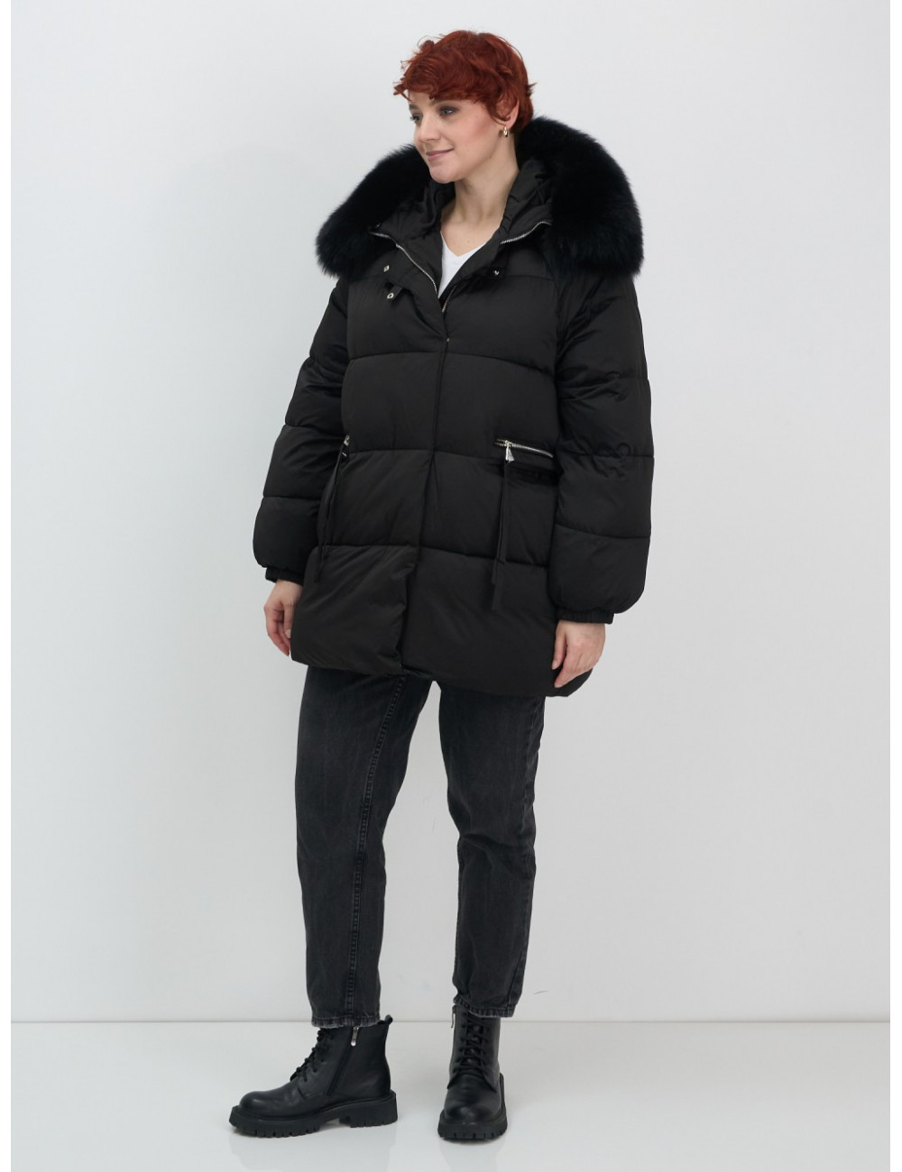 Технические характеристики Женский чёрный пуховик с мехом и капюшоном.