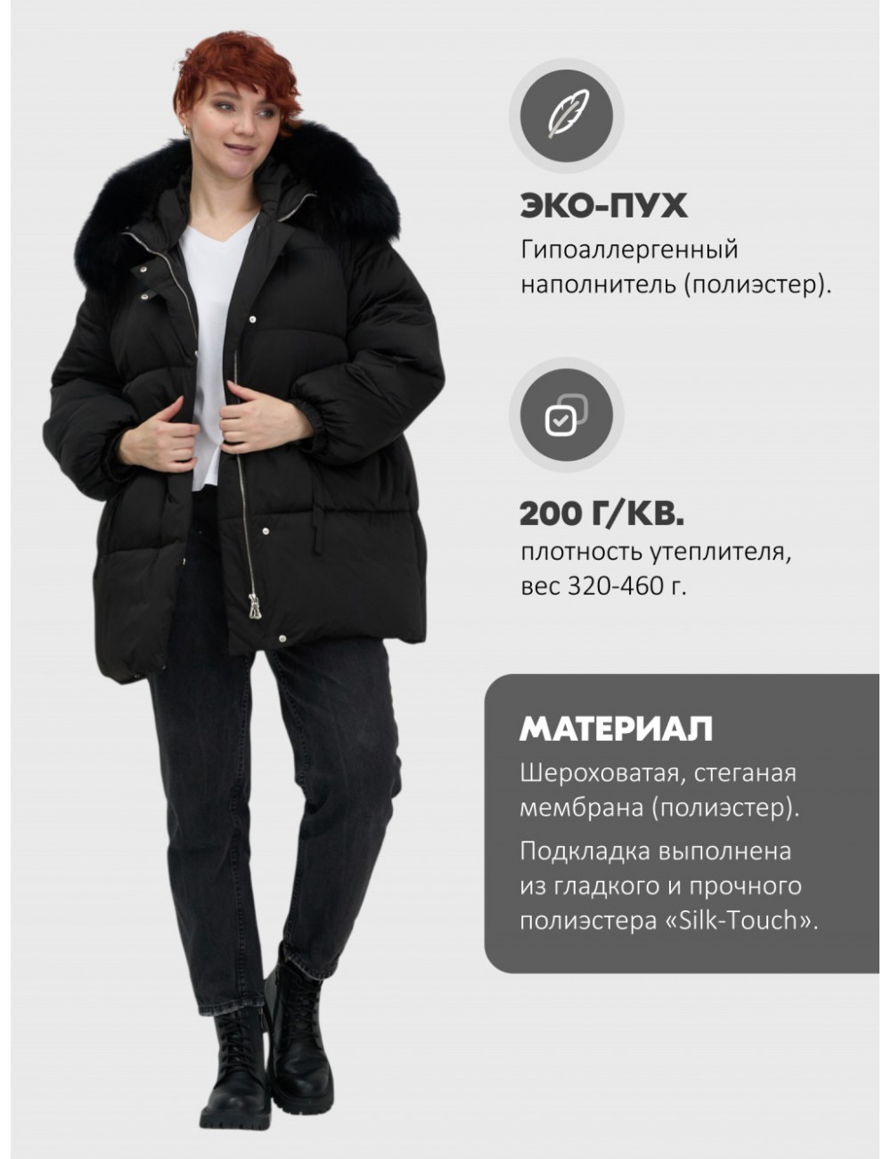 Особенности модели | быстросохнущая, ветрозащита, водоотталкивающий материал, гипоаллергенный материал, дышащий материал, съемная опушка |