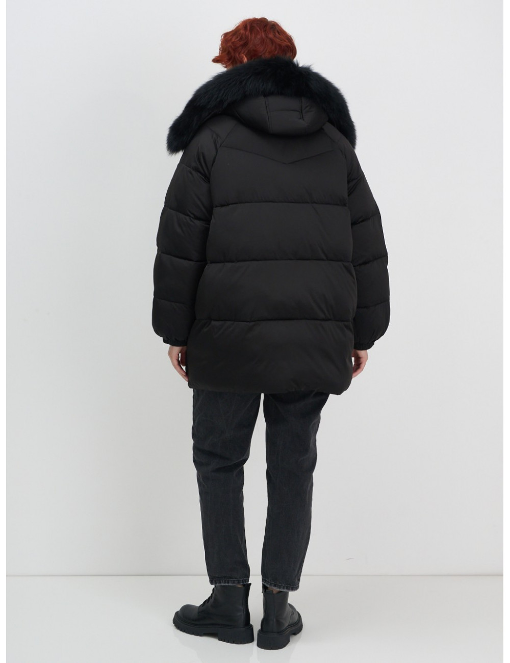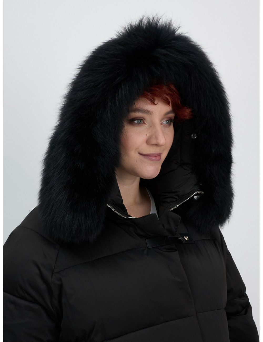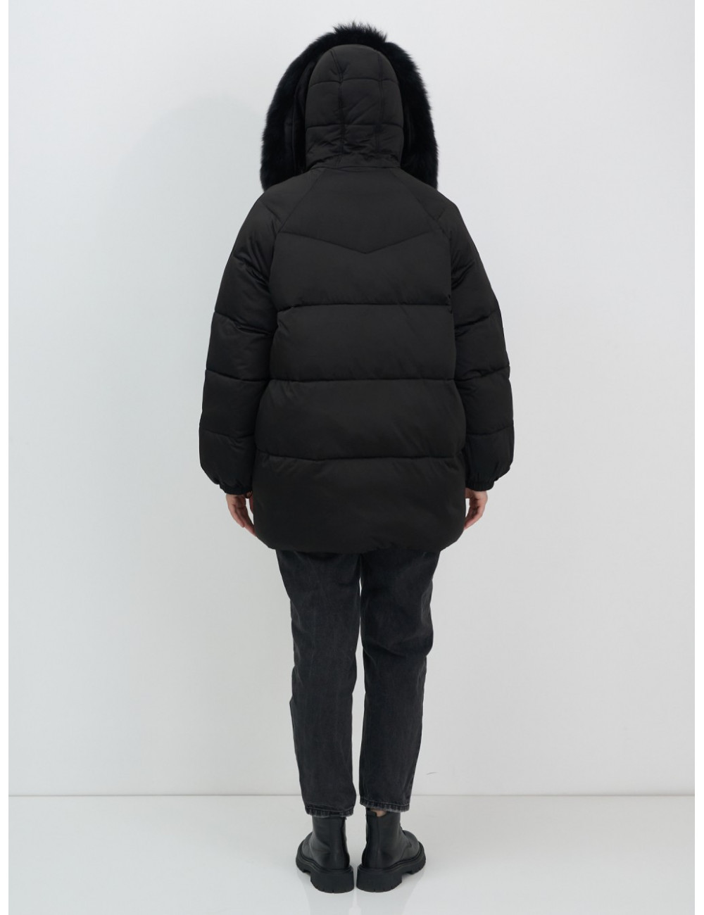 Женский чёрный пуховик с мехом и капюшоном.
